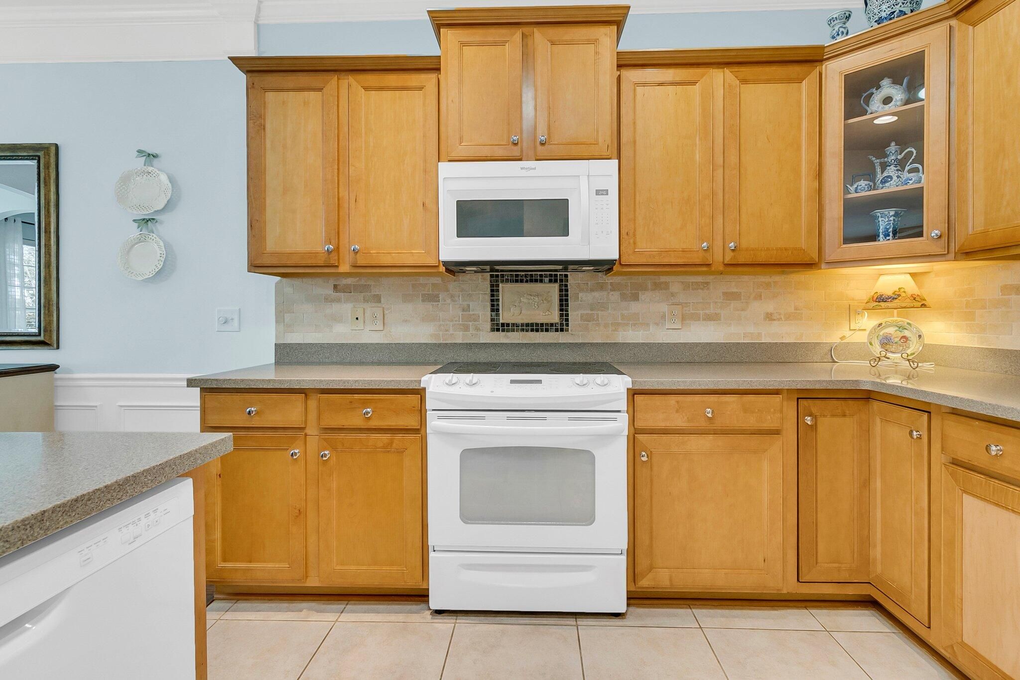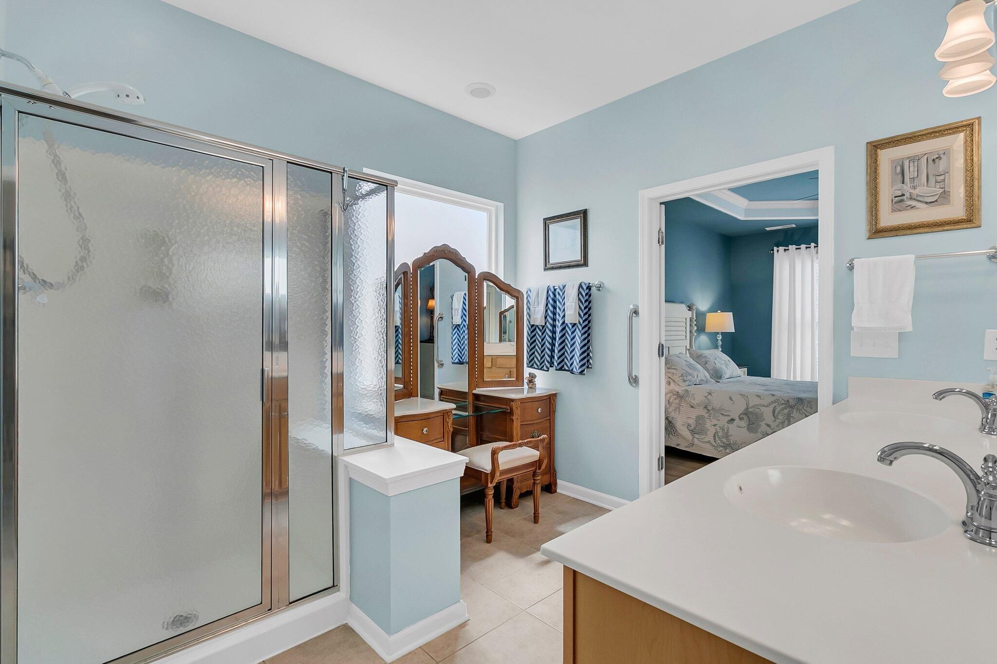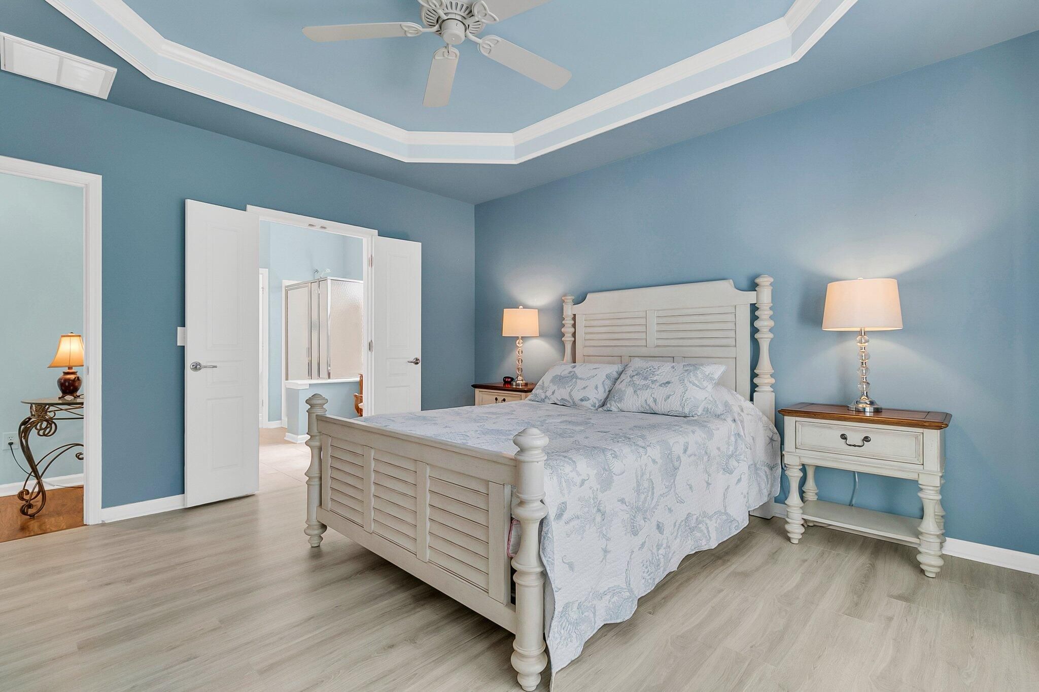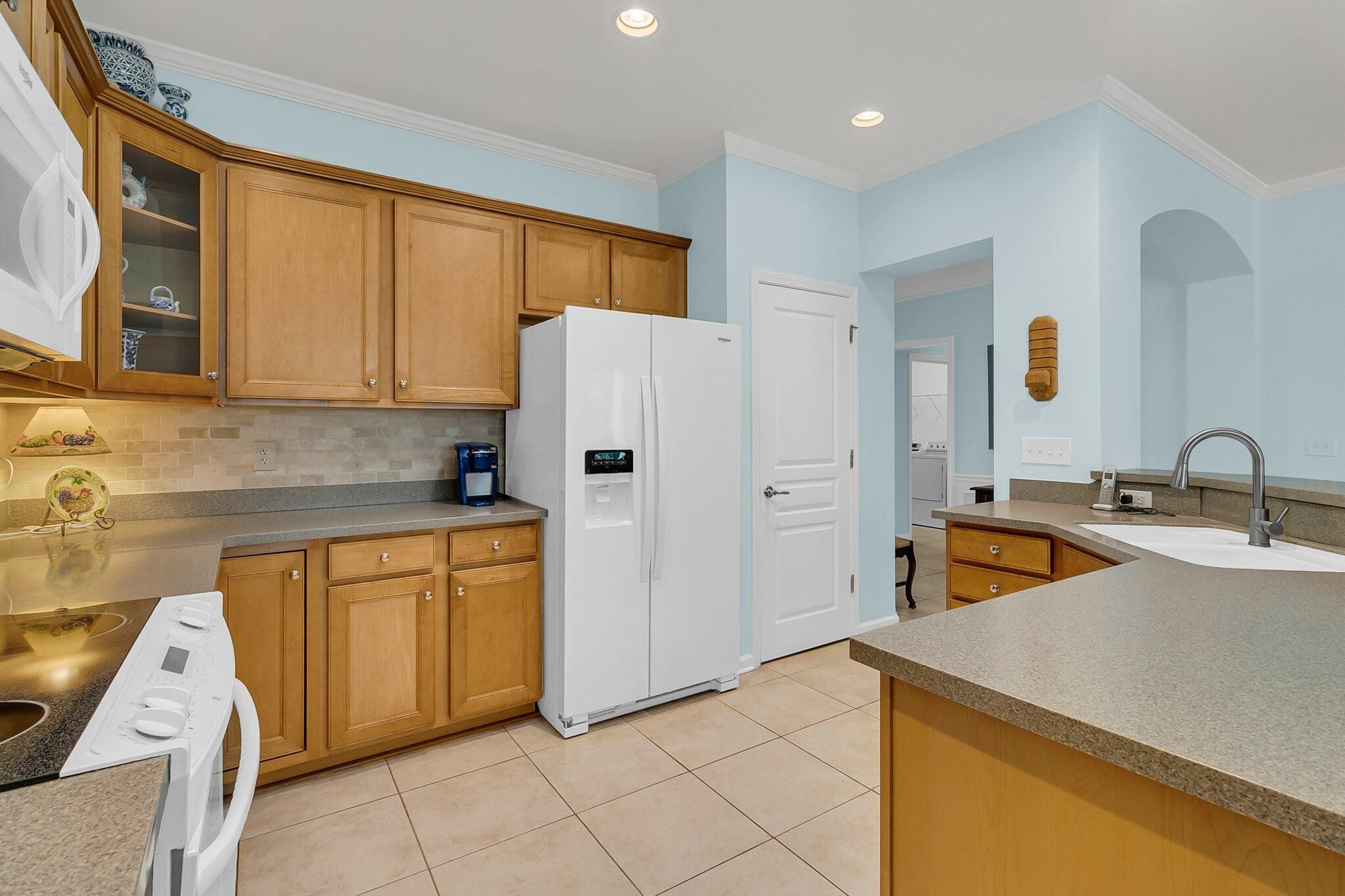 Del Webb Charleston's popular model, the Copper Ridge on a gorgeous oversized corner homesite in close proximity to the communities amenity center! This home features 2 bedrooms, 2 baths, office/den/flex room, sunroom, and covered porch. New roof installed in 2023. Beautiful curb appeal highlighted with mature landscaping and a front porch with plenty of room for seating. Step inside to a defined foyer with tiled flooring, wainscotting, and two piece crown molding. A charming archway leads you into open-concept living and a stunning view to the outside, it's no wonder this floorpan is so popular! A spacious kitchen looks directly into the living and dining rooms with a wraparound bar for informal eating. The kitchen is complete with 36'' Maple cabinets with crown molding, Corian.......countertops, and tile backsplash. The sunroom is located at the back of the home and includes tile flooring and ample windows. From the sunroom, you'll step onto a covered porch surrounded by beautiful scenery and privacy with a professionally landscaped berm, the feeling of relaxation is all around! Back inside the primary bedroom doesn't disappoint with laminate flooring, plenty of natural light and tray ceiling. From there, a primary bathroom with dual sink vanities, walk-in shower, tile flooring, linen closet, and giant walk-in closet! The guest bedroom is on the opposite side of the home offering your guests plenty of privacy. Finally, a den tucked down a short hallway complete with french doors that can be used as an office, extra TV room, hobby room, or third sleeping area for friends and family! The corner homesite surrounded by beautiful landscaping makes this one special. Please book your showing today to see this home and Charleston's premier active adult/55+ lifestyle community in full bloom!