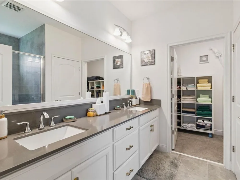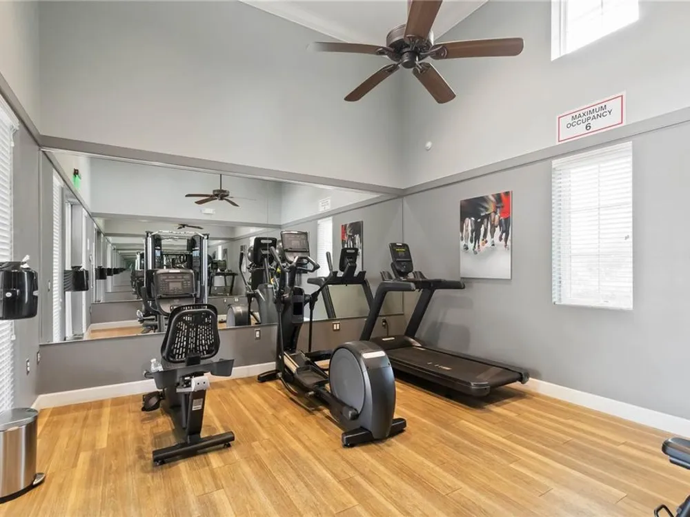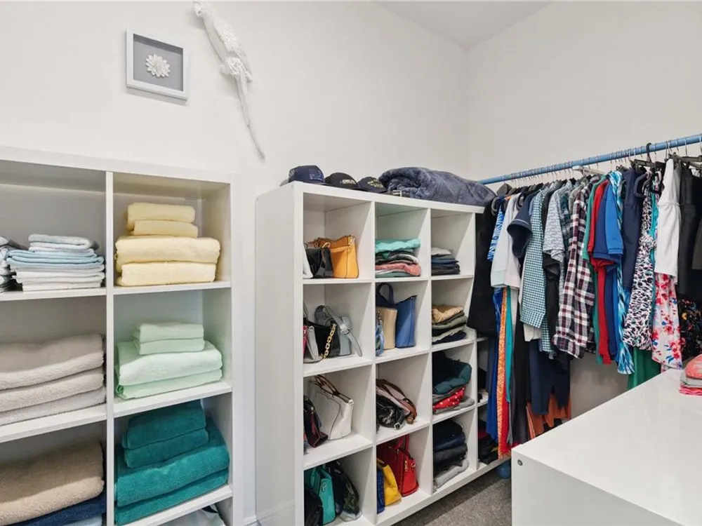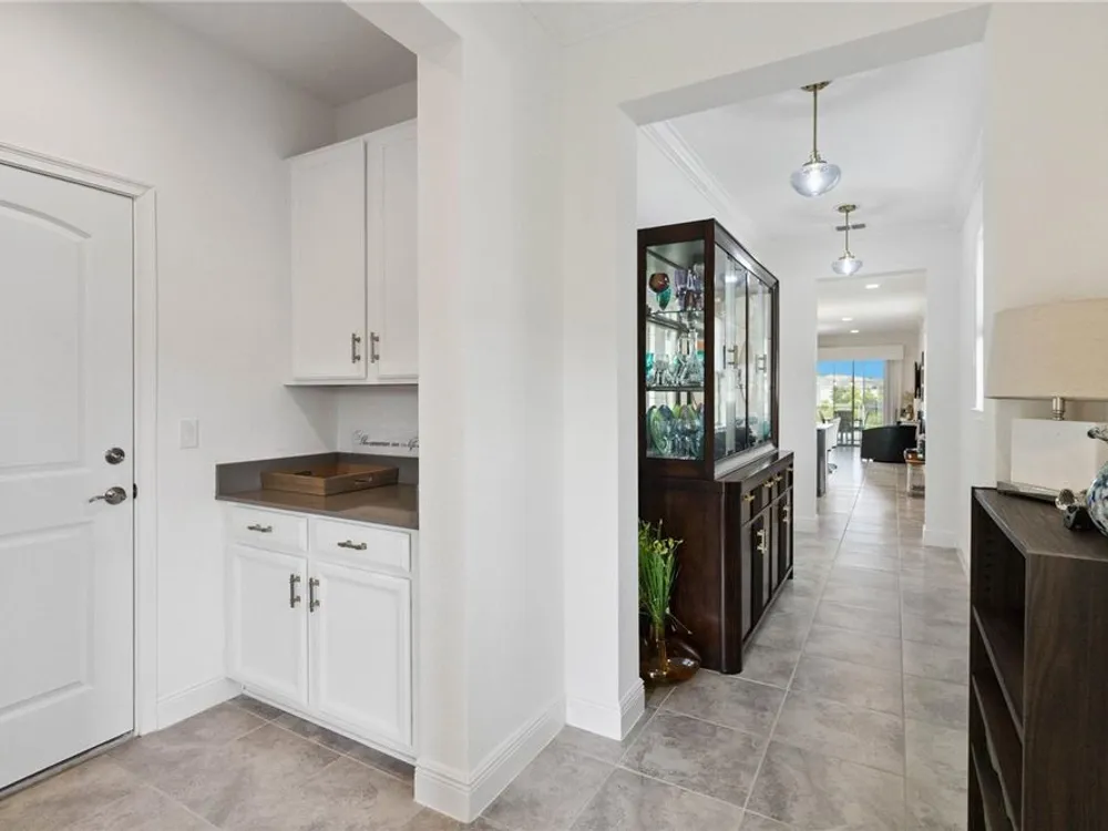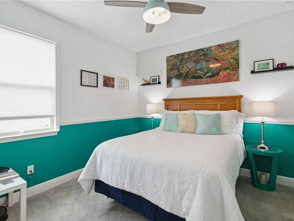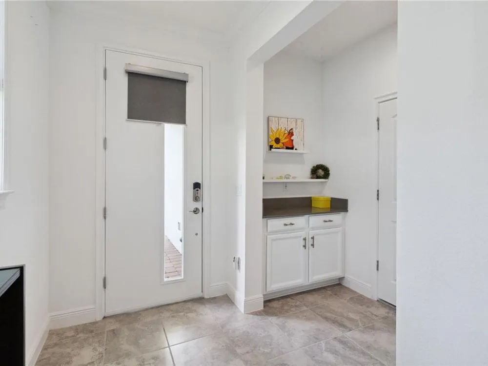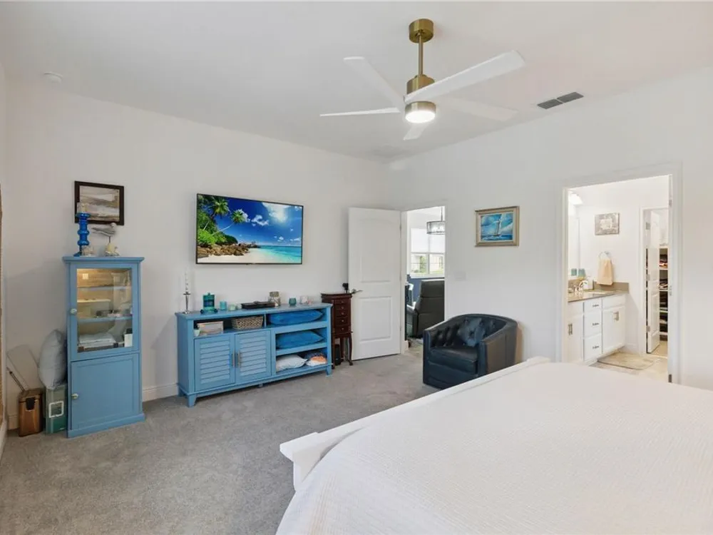 - Ceiling Fan(s), Crown Molding, Eat-in Kitchen, High Ceilings, Open Floorplan, Main Level Primary, Solid-Wood Cabinets, Split Bedrooms, Stone Counters, Walk-In Closet(s), Window Treatments