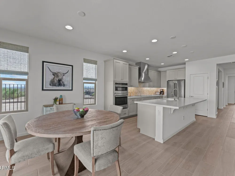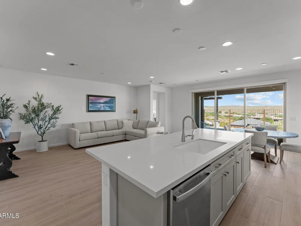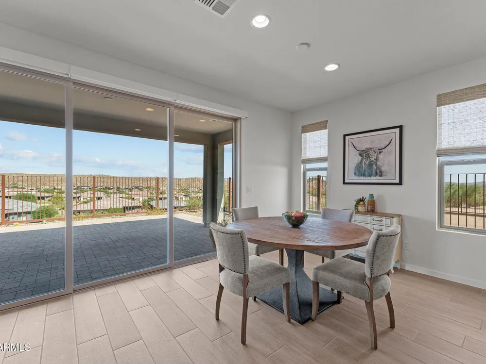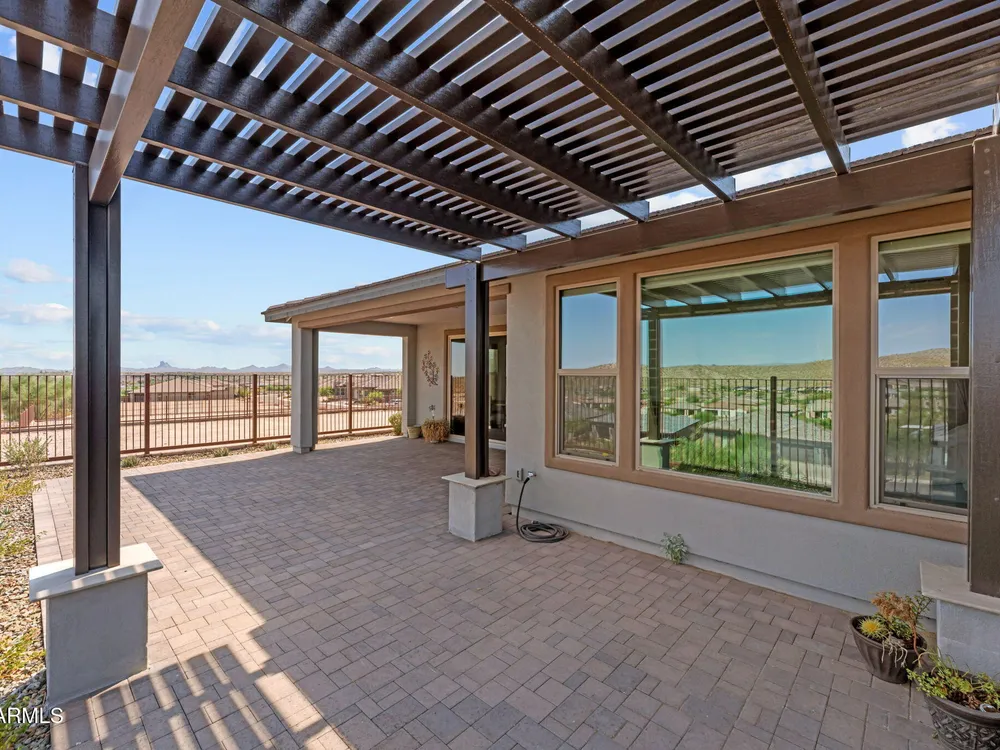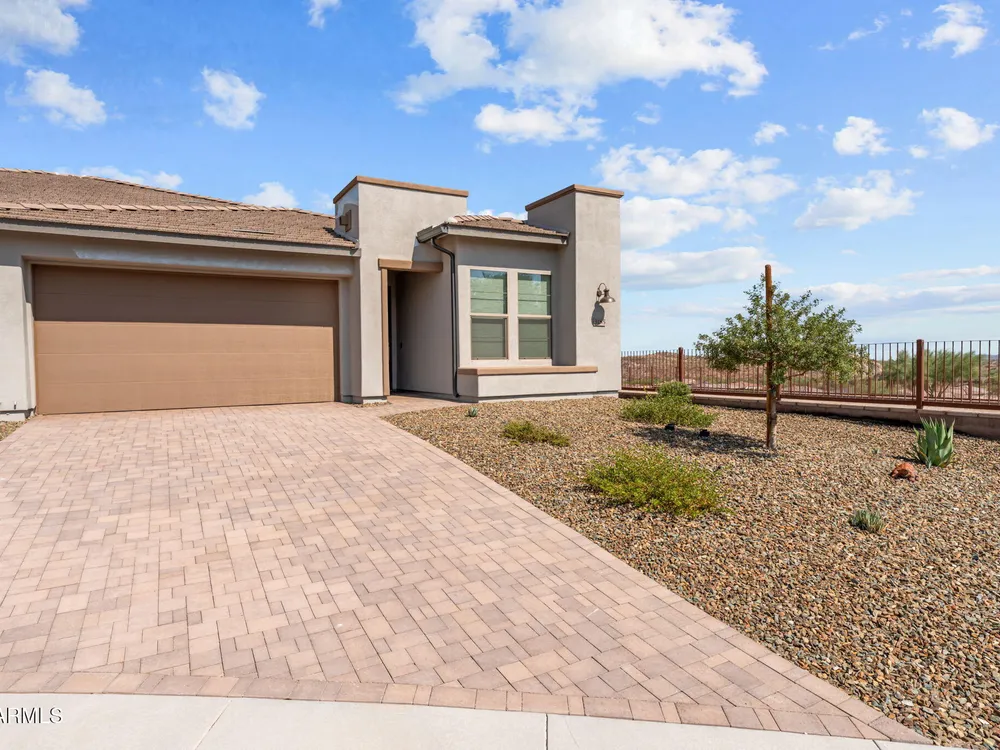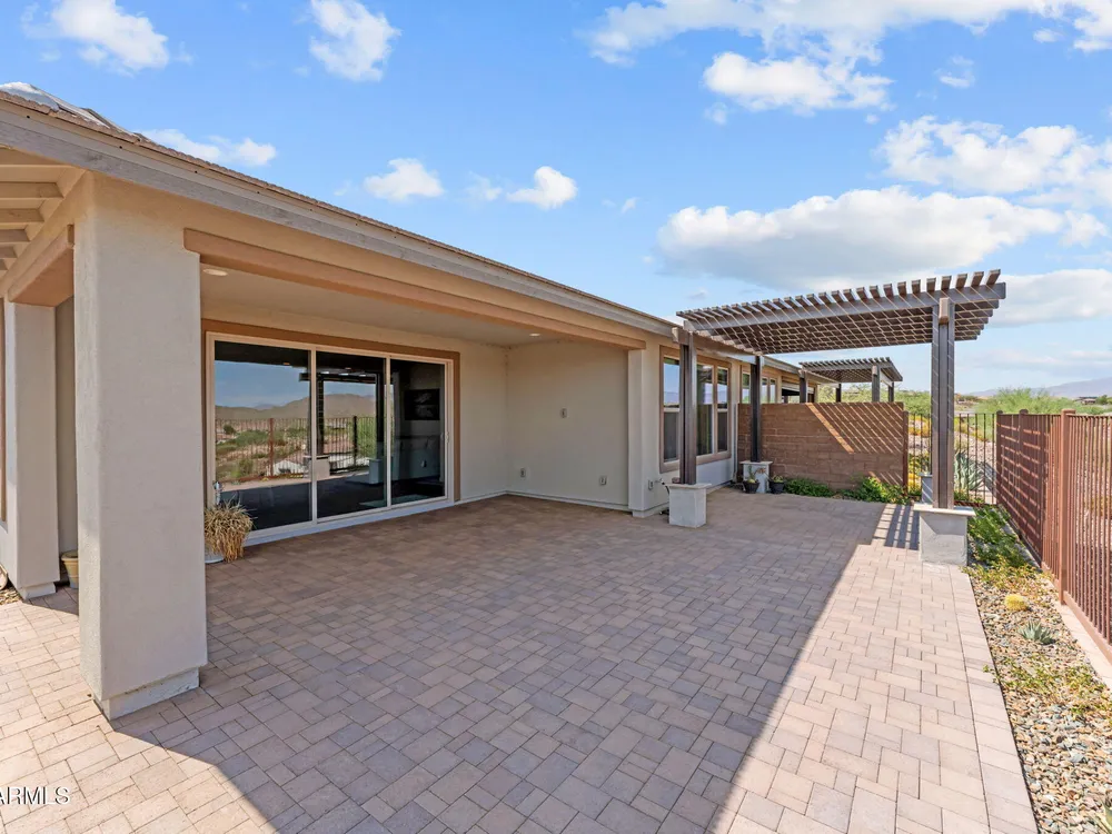 Discover this stunning duet home featuring 2 bedrooms and 2.5 bathrooms, located in the highly desirable Wickenburg Ranch community. Designed for modern living, this open floor plan showcases elegant wood-look tile and an airy, inviting atmosphere filled with natural light. The gourmet kitchen serves as the heart of the home, complete with a large island for dining and entertaining, sleek modern appliances, and high-end finishes that elevate the space. A dramatic wall of sliding glass doors frames sweeping views of the desert mountains, creating a picturesque backdrop for everyday living. Step outside to an expansive patio designed for year-round enjoyment. The partially covered area offers shade and comfort, while the charming pergola provides the perfect spot to dine al fresco or unwind while taking in the breathtaking scenery. Additional features include a 4' garage extension for added storage or workspace and the benefits of a duet property, offering a low-maintenance lifestyle without sacrificing privacy. With stunning mountain vistas and access to the incredible resort-style amenities Wickenburg Ranch is known for, this home captures the very best of desert living.