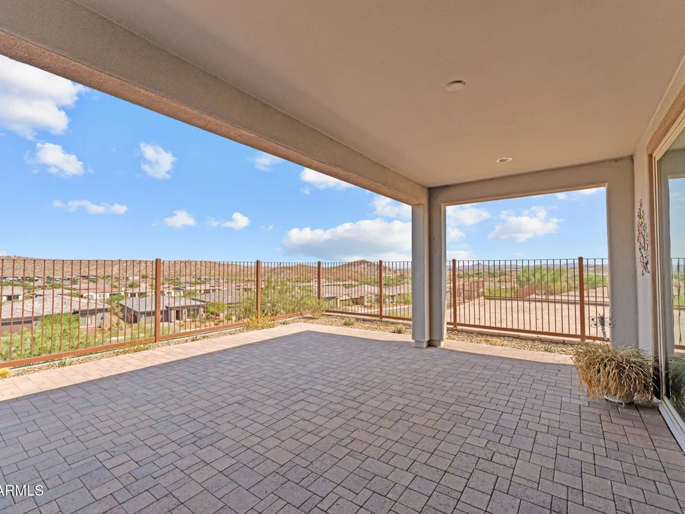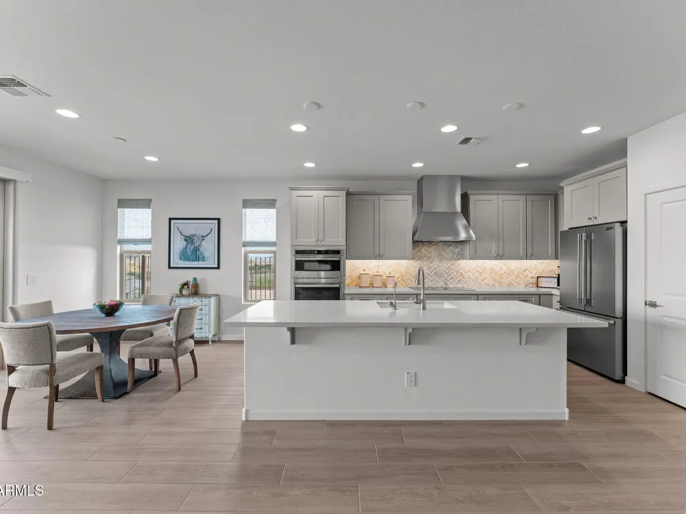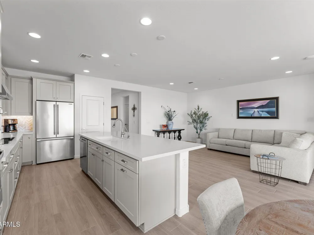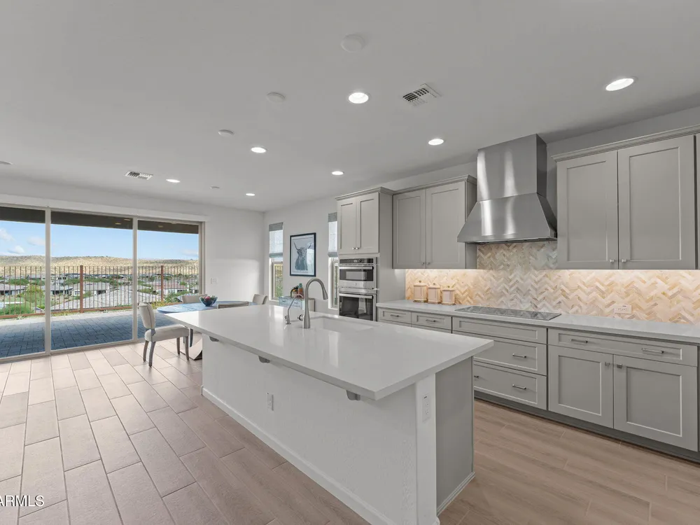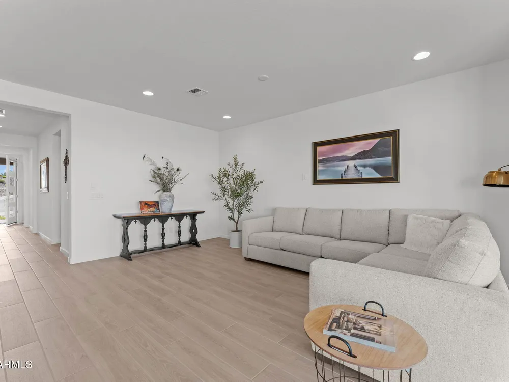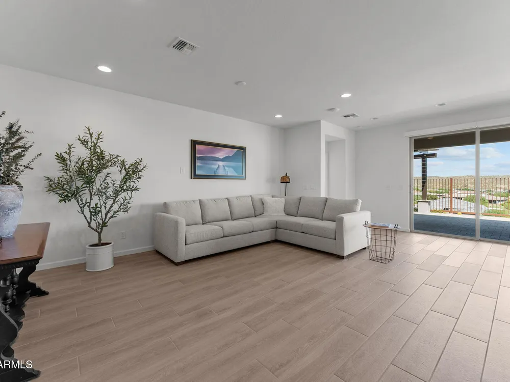 Discover this stunning duet home featuring 2 bedrooms and 2.5 bathrooms, located in the highly desirable Wickenburg Ranch community. Designed for modern living, this open floor plan showcases elegant wood-look tile and an airy, inviting atmosphere filled with natural light. The gourmet kitchen serves as the heart of the home, complete with a large island for dining and entertaining, sleek modern appliances, and high-end finishes that elevate the space. A dramatic wall of sliding glass doors frames sweeping views of the desert mountains, creating a picturesque backdrop for everyday living. Step outside to an expansive patio designed for year-round enjoyment. The partially covered area offers shade and comfort, while the charming pergola provides the perfect spot to dine al fresco or unwind while taking in the breathtaking scenery. Additional features include a 4' garage extension for added storage or workspace and the benefits of a duet property, offering a low-maintenance lifestyle without sacrificing privacy. With stunning mountain vistas and access to the incredible resort-style amenities Wickenburg Ranch is known for, this home captures the very best of desert living.