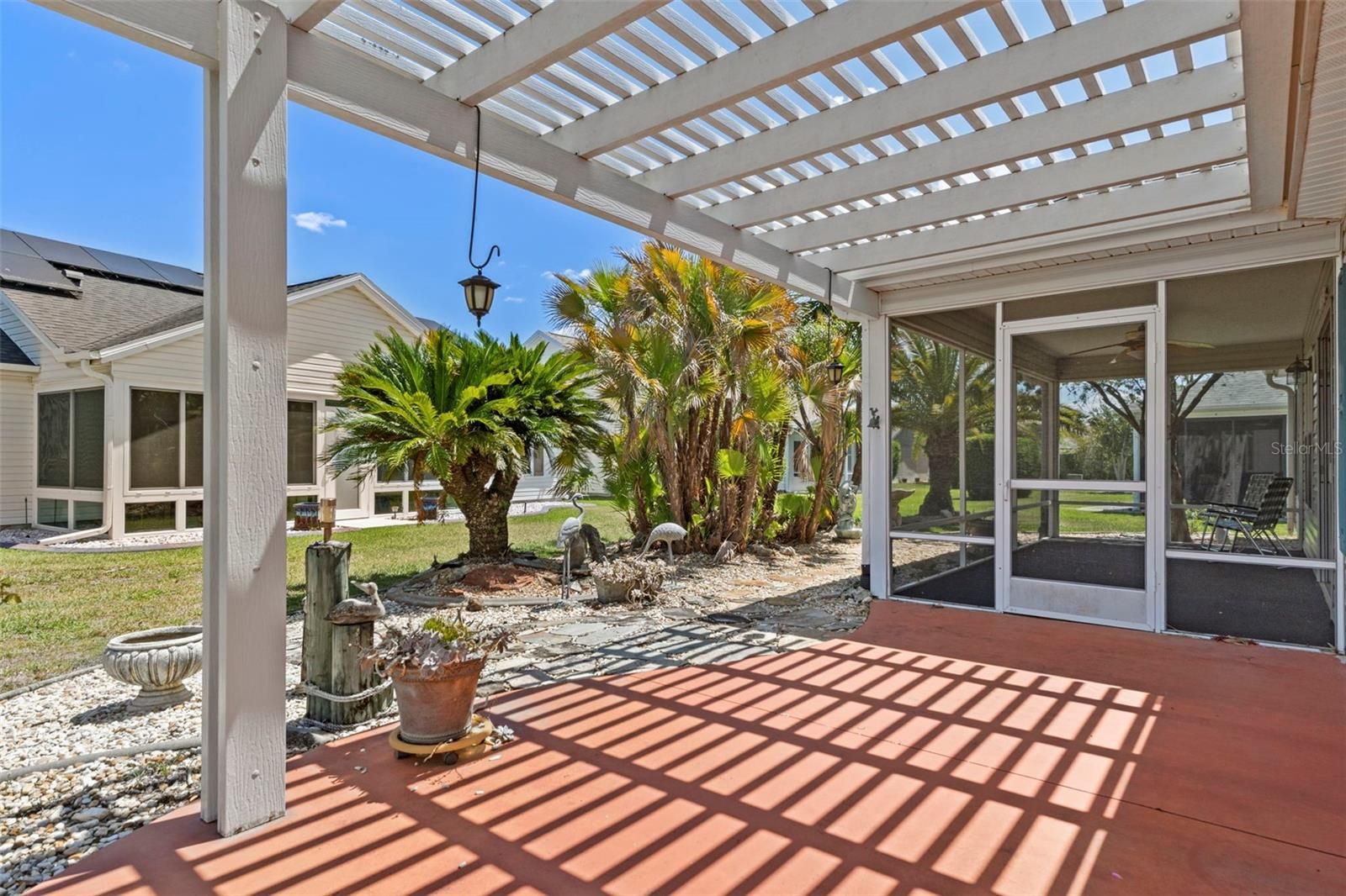 Move-in ready and beautifully refreshed, this 3-bedroom, 2-bath home with a 2-car garage offers comfort, style, and convenience. Enjoy peace of mind with brand-new interior paint and luxury vinyl flooring throughout. The spacious open great room features vaulted ceilings and sliding glass doors that lead to a screened lanai—perfect for relaxing or entertaining. The kitchen is well-appointed with abundant cabinet space and a cozy breakfast nook. The large primary suite includes a walk-in closet and an en-suite bath with dual vanities and a generous walk-in shower. A desirable split-bedroom floor plan provides privacy for guests, and the second bathroom has been upgraded with a brand-new Kohler $23,000 walk-in jetted tub and shower for ultimate comfort and accessibility. Additional highlights include ample storage cabinets in the 2-car garage, plus a screened lanai and adjoining patio ideal for outdoor cookouts and gatherings. Conveniently located near shopping, dining, and everyday essentials—with golf cart access to grocery stores, Walmart, multiple pools, recreation centers, and both executive and championship golf courses. You’re also just a short ride to Lake Sumter Landing and Spanish Springs Town Squares for entertainment, dining, and community events. Major updates include a roof approximately 3 years old, and the bond has been paid—adding even more value to this exceptional home.