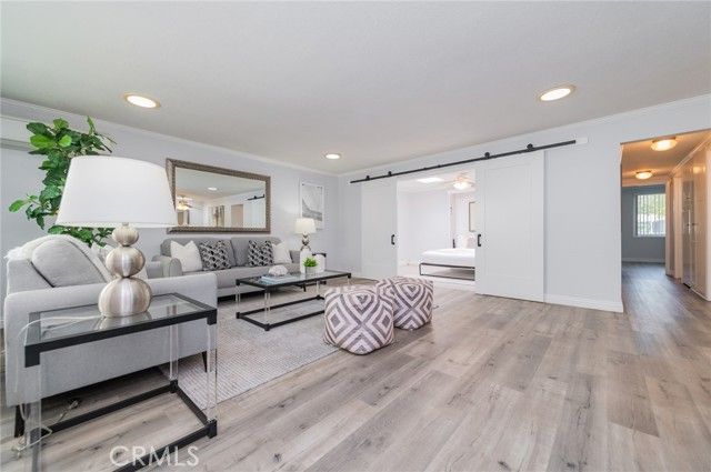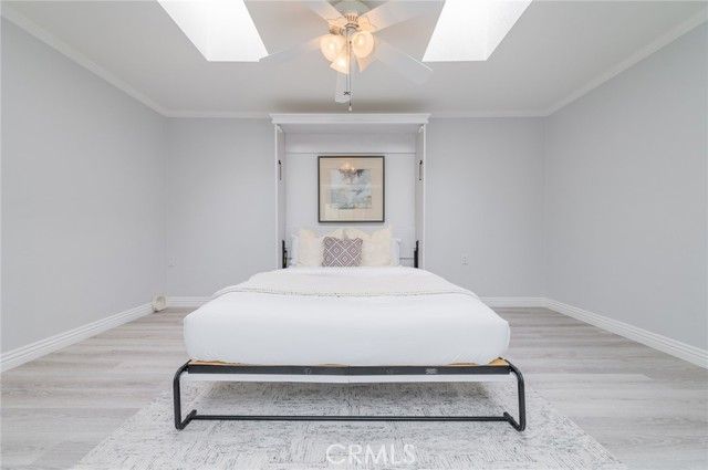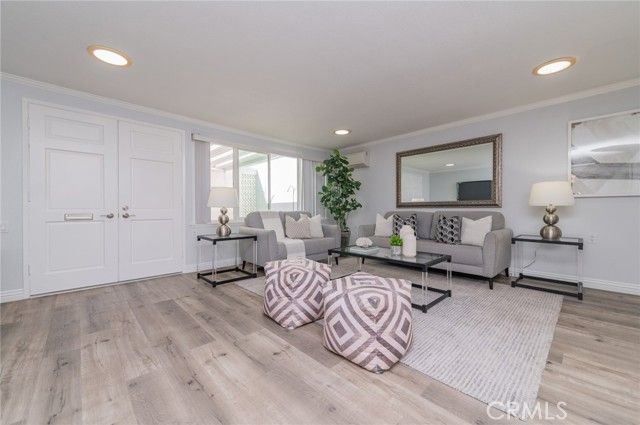 Highly coveted Cordoba model reimagined into a sophisticated, light-filled retreat in the heart of Laguna Woods. This impeccably remodeled single-level residence offers 2 bedrooms, 2 baths, and a thoughtfully enclosed atrium transformed into a flexible designer space-ideal as a private office, den, or elegant guest suite complete with a pull-out Murphy bed. Nestled within a tranquil enclave surrounded by mature trees and lush landscaping, this private cottage provides a peaceful setting with no one above or below. A spacious covered patio creates a welcoming entry and seamless indoor-outdoor lifestyle, while also conveniently housing a full-sized washer and dryer. Inside, double doors open to an expansive living room adorned with laminate flooring, crown molding, smooth ceilings, and four architectural porthole skylights that bathe the home in natural light. A mini-split system enhances year round comfort and efficiency. The gourmet kitchen showcases custom cabinetry, stunning quartz countertops, recessed lighting, and stainless-steel appliances, flowing effortlessly into an intimate dining area illuminated by a skylight. The enclosed atrium/den is a true showpiece - elevated by two large skylights, a built-in wall bed, and beautiful sliding barn doors for added privacy and versa