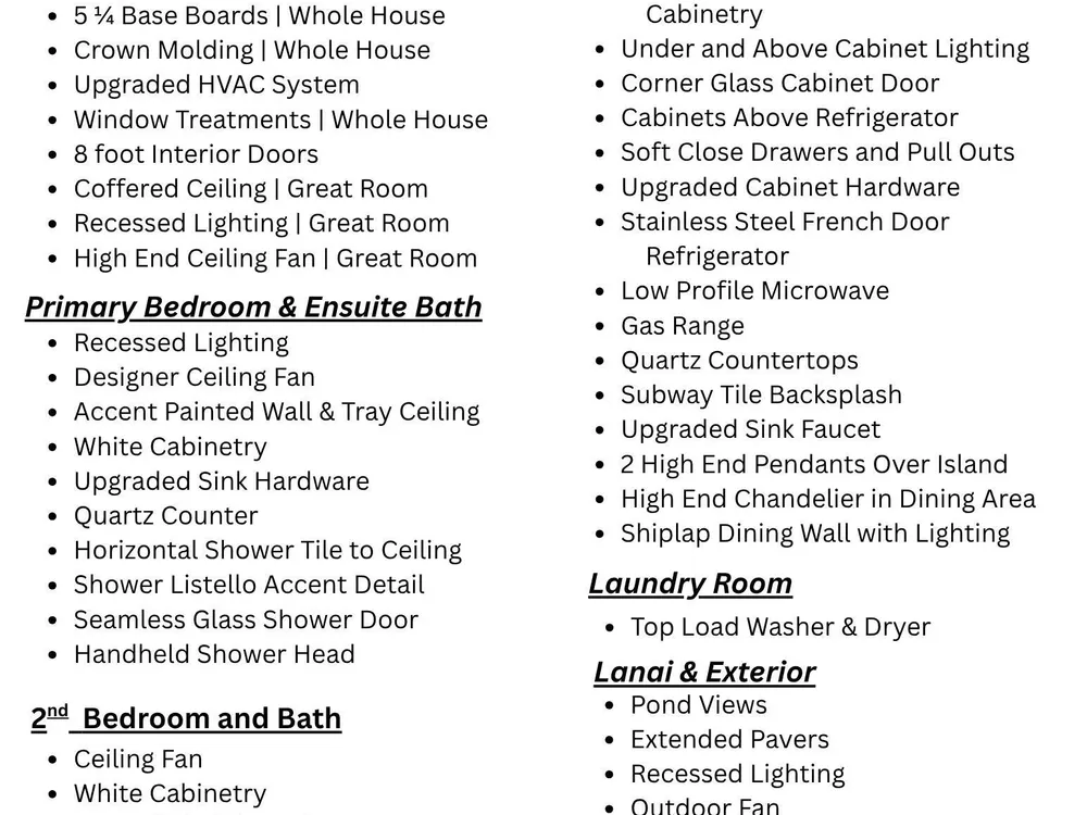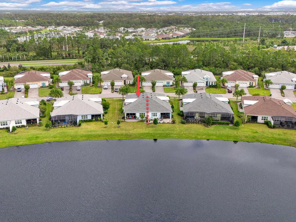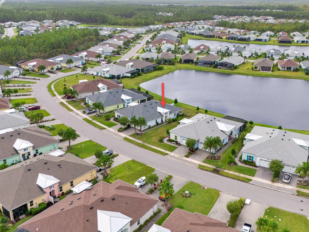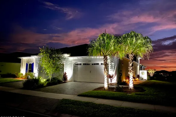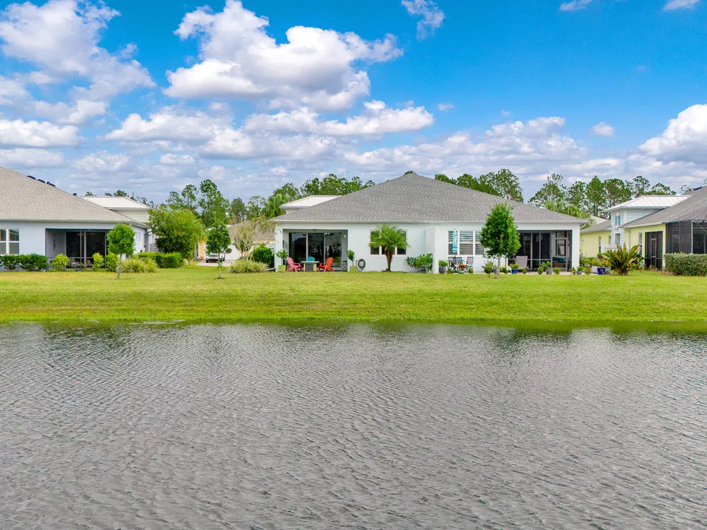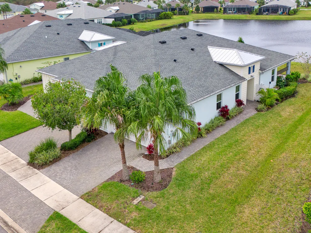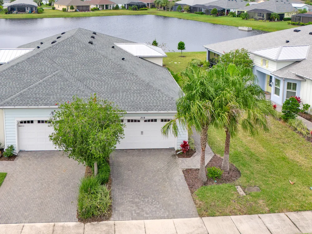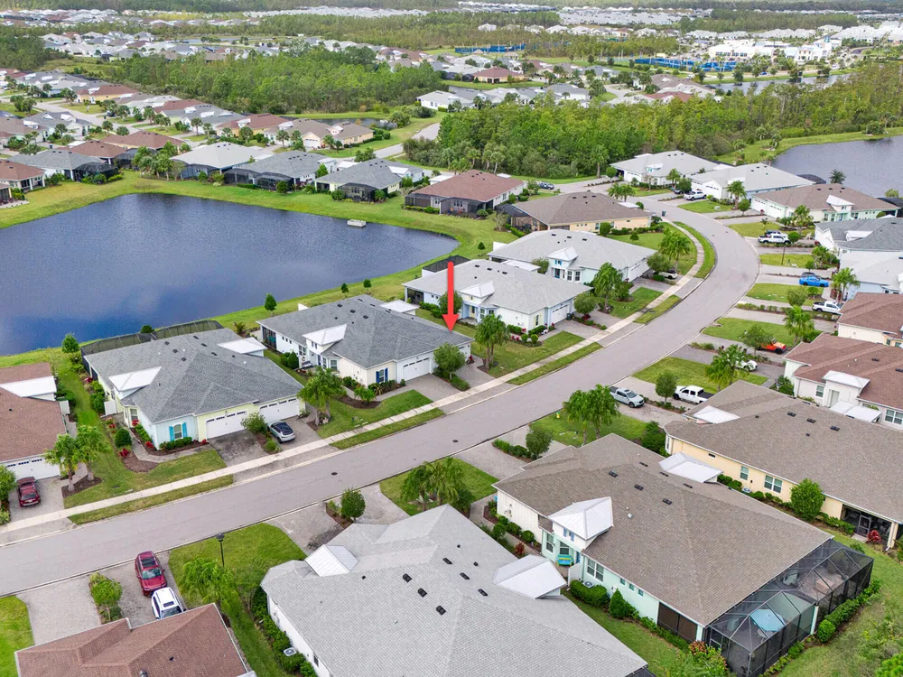 GORGEOUS POND VIEW ALONG WITH DESIGNER FINISHES IN THIS ANTIGUA VILLA IN Phase 1! PERFECTION! This stunning home sits gracefully on a quiet street, offering long serene water views & extra green space alongside for added privacy. Upgraded landscaping & professionally designed lighting elevate curb appeal. Inside,8 ft doors, coastal plank LVP & crown molding flow throughout, complemented by neutral light gray walls for a fresh, airy feel. Subtle details everywhere. Chef's kitchen features white crown-molded cabinetry, quartz counters, subway tile backsplash, upgraded hardware, high-end pendant lighting, gas range & low-profile microwave. A shiplap-accented dining area & coffered-ceiling great room w/ recessed lighting create inviting spaces to gather. The open den offers flexibility for work or relaxation. The primary suite boasts pond views, tray ceiling & accent wall w/ ensuite bath showcasing seamless glass walk-in shower, white cabinetry & striking tilework with listello detail. The Guest bath mirrors these upscale finishes and includes a tub. Step onto the extended paver lanai surrounded by upgraded palms and lush landscapingyour private oasis on the water. Upgraded HAVC . All this and a short golf cart ride away from amazing 5 star amenities, fitness center, pickleball courts, band shell with weekend live music, paradise pool and sports pool.