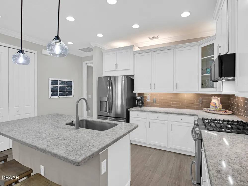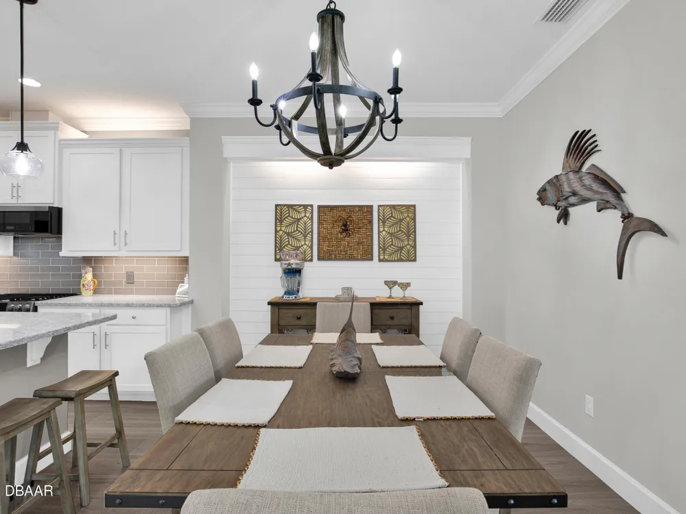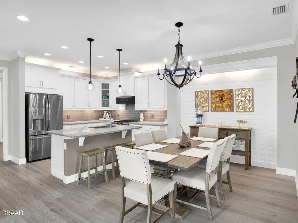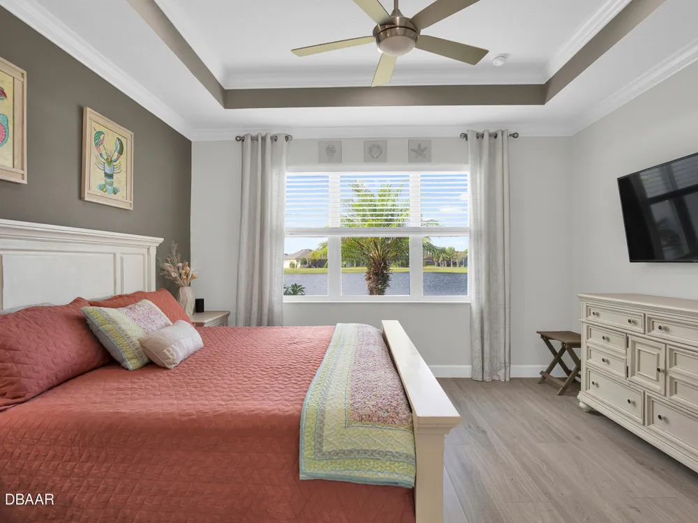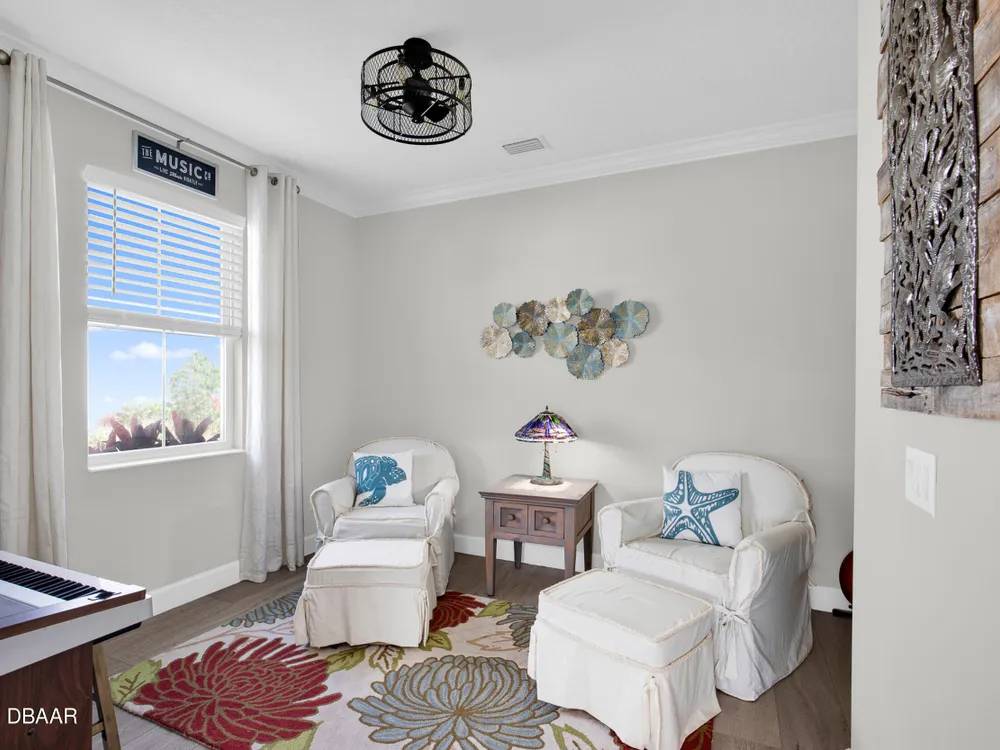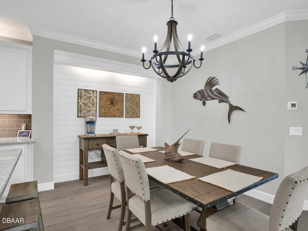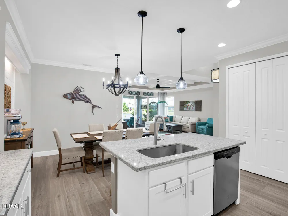 GORGEOUS POND VIEW ALONG WITH DESIGNER FINISHES IN THIS ANTIGUA VILLA IN Phase 1! PERFECTION! This stunning home sits gracefully on a quiet street, offering long serene water views & extra green space alongside for added privacy. Upgraded landscaping & professionally designed lighting elevate curb appeal. Inside,8 ft doors, coastal plank LVP & crown molding flow throughout, complemented by neutral light gray walls for a fresh, airy feel. Subtle details everywhere. Chef's kitchen features white crown-molded cabinetry, quartz counters, subway tile backsplash, upgraded hardware, high-end pendant lighting, gas range & low-profile microwave. A shiplap-accented dining area & coffered-ceiling great room w/ recessed lighting create inviting spaces to gather. The open den offers flexibility for work or relaxation. The primary suite boasts pond views, tray ceiling & accent wall w/ ensuite bath showcasing seamless glass walk-in shower, white cabinetry & striking tilework with listello detail. The Guest bath mirrors these upscale finishes and includes a tub. Step onto the extended paver lanai surrounded by upgraded palms and lush landscapingyour private oasis on the water. Upgraded HAVC . All this and a short golf cart ride away from amazing 5 star amenities, fitness center, pickleball courts, band shell with weekend live music, paradise pool and sports pool.