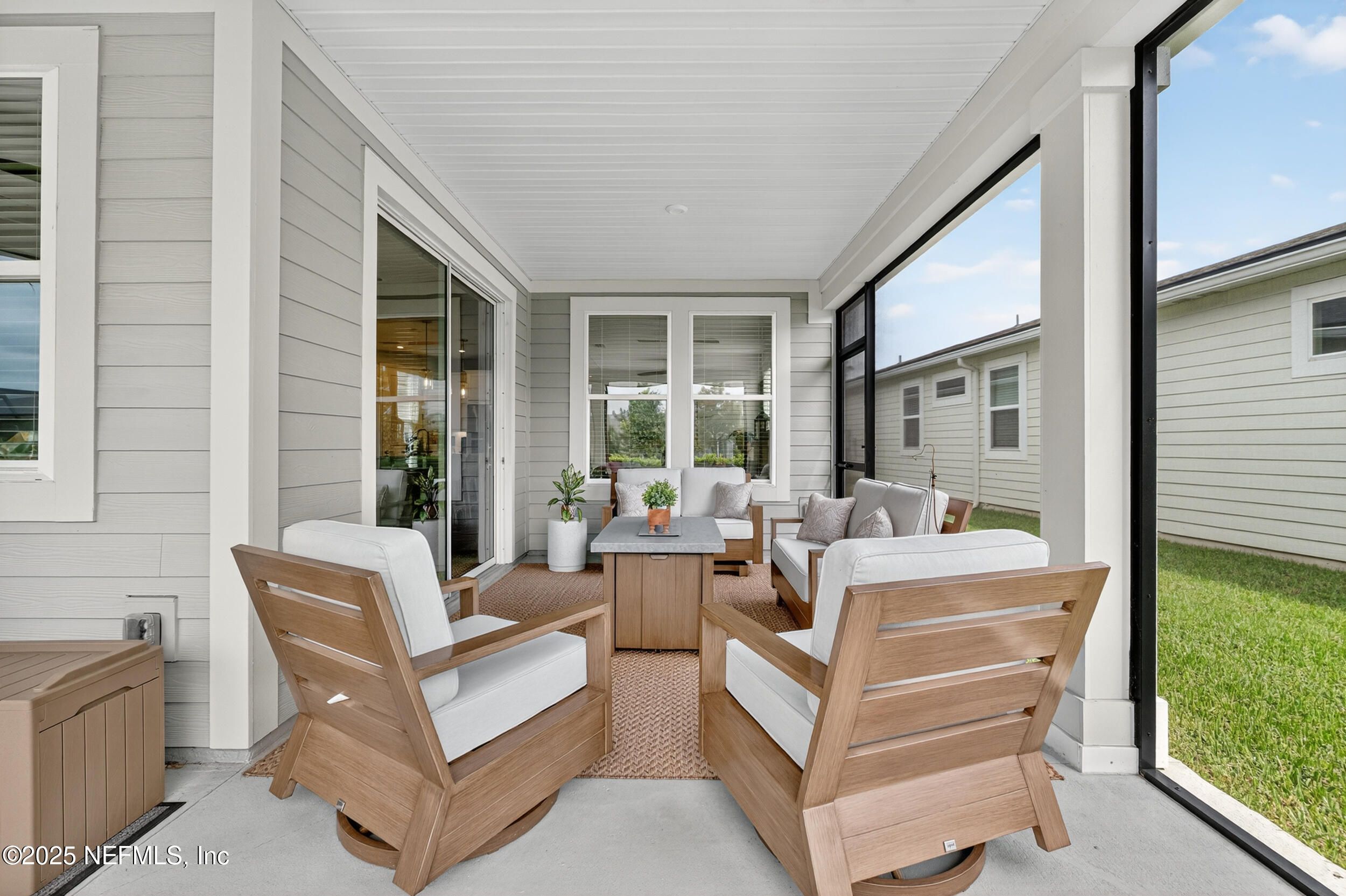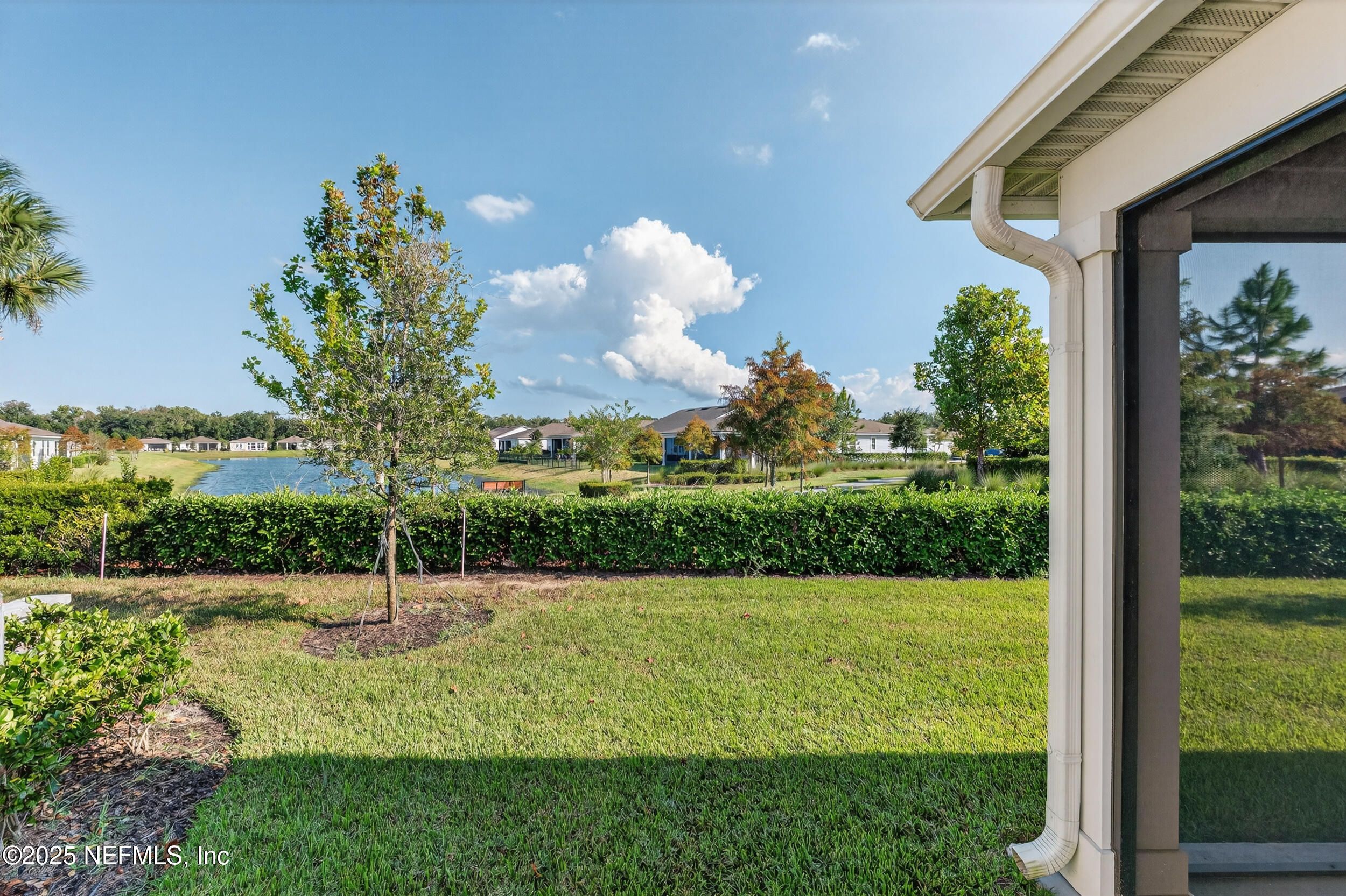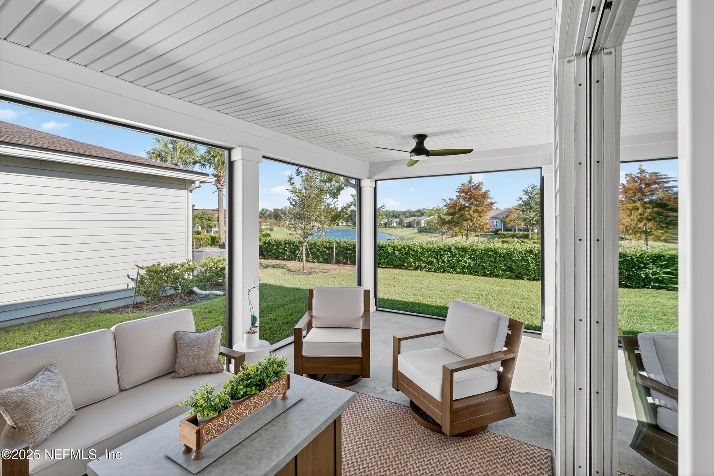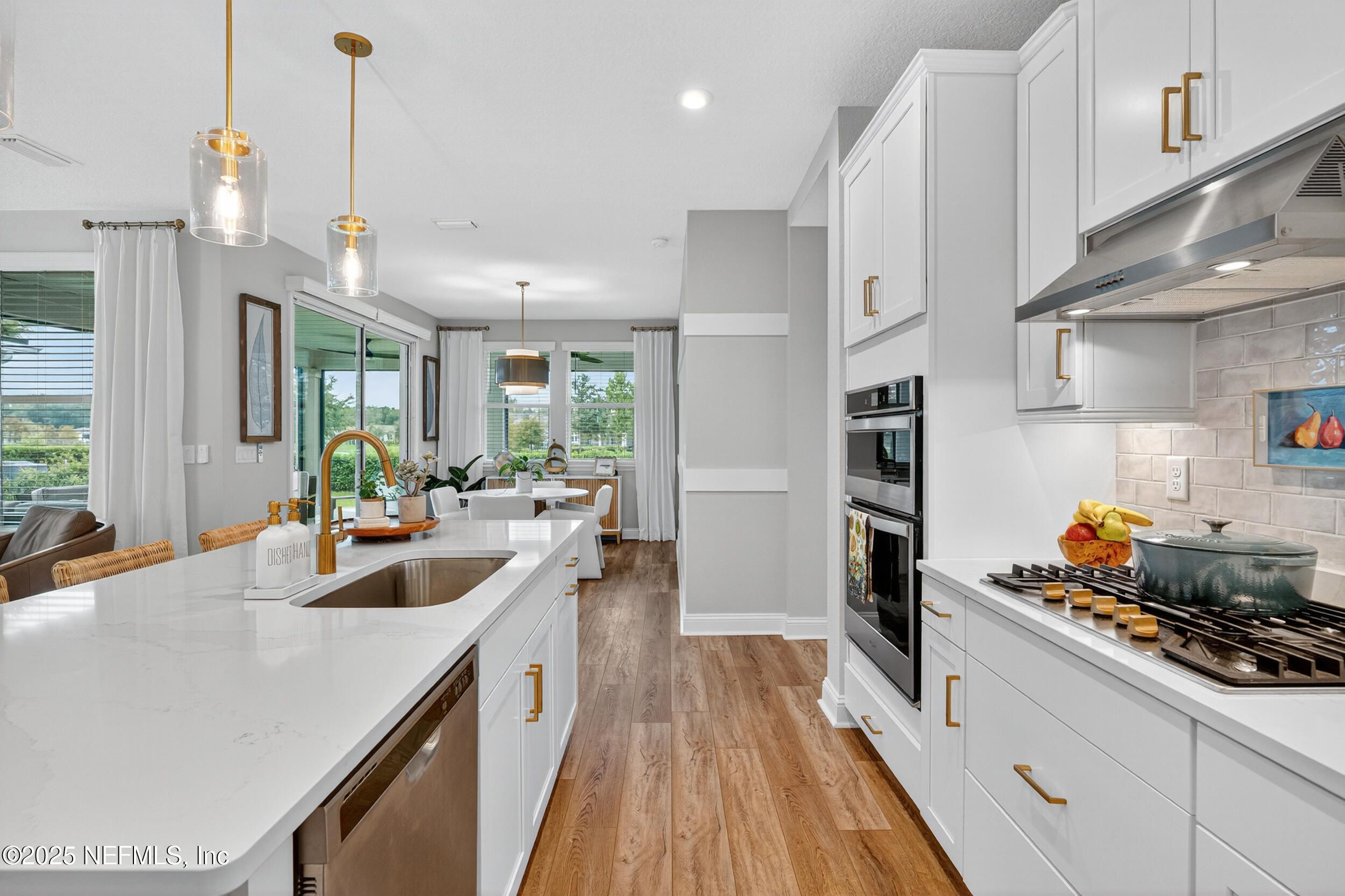 Designer-Inspired Court Model in WaterSong at RiverTown. Built in 2022, this 1712 sq ft, 2-bedroom + office/den, 2-bath home is filled with designer details and modern upgrades that set it apart. From the moment you step inside, the board and batten foyer walls, updated lighting, and warm wood luxury vinyl plank flooring set the tone for the sophisticated style that flows throughout. The great room features a custom linear fireplace with a wood surround and mantle, accented by a propeller-blade ceiling fan. In the dining area, custom trim work adds charm, while the chef's kitchen impresses with quartz countertops, brass hardware, stainless steel Whirlpool appliances, a glazed whitewashed brick-look backsplash, and a gas cooktop with brass accents. A large dining island with panel detailing is the perfect centerpiece for entertaining. Retreat to the primary suite, complete with chandelier lighting, a spacious walk-in closet with built-in luggage racks, and a spa-like bath boasting a zero-entry shower with a river rock accent wall, shiplap vanity backdrop, circular mirrors, and waterfall faucets. The second bedroom also features custom wall detail, and the secondary bath showcases European tile floors and modern finishes. Additional highlights include a barn-door flex room/den, well-appointed laundry room with cabinets and shelving, smart Clare security system, tankless water heater, epoxy-coated garage flooring, and a screened lanai overlooking a walking path and tranquil pond views. Step outside your door and enjoy WaterSong's exclusive 55+ amenities, plus all of RiverTown's resort-style offeringsfrom multiple pools (including lazy river and riverfront zero-entry), to pickleball, tennis, fitness centers, nature trails, riverfront dining, and a full calendar of community events. This home blends luxury finishes, thoughtful design, and a lifestyle that feels like a year-round vacation.