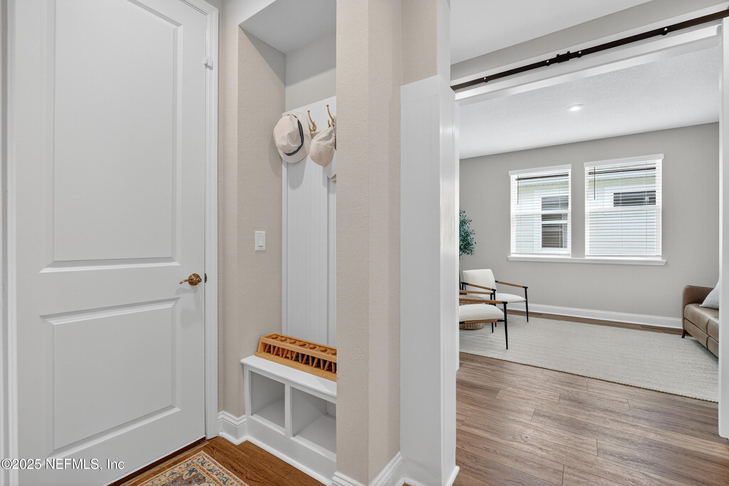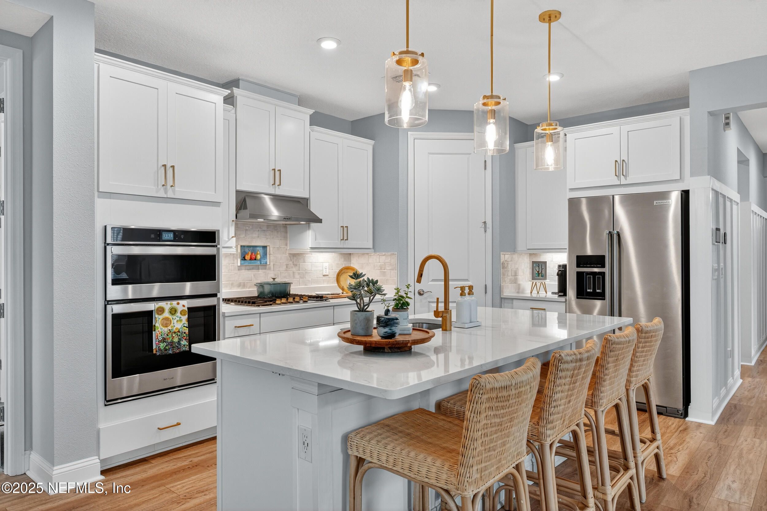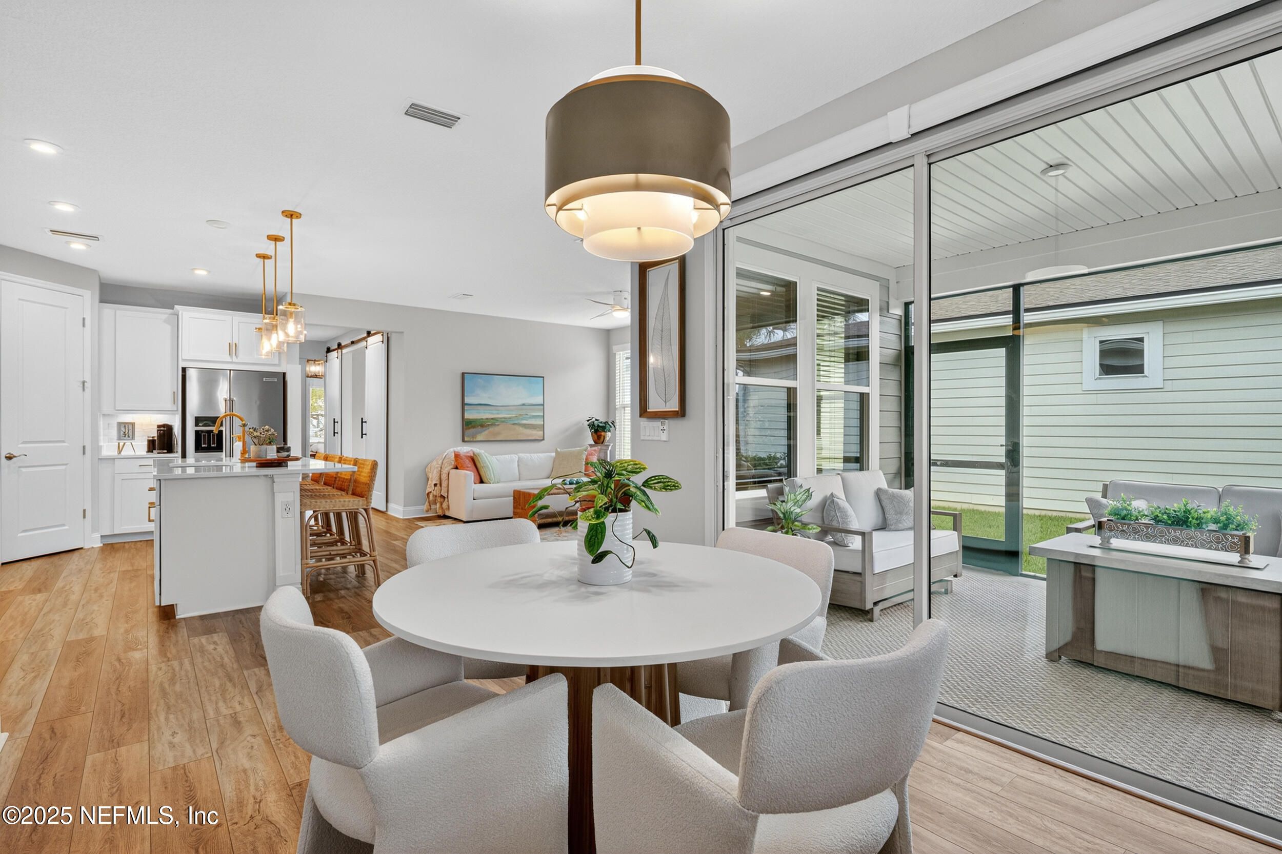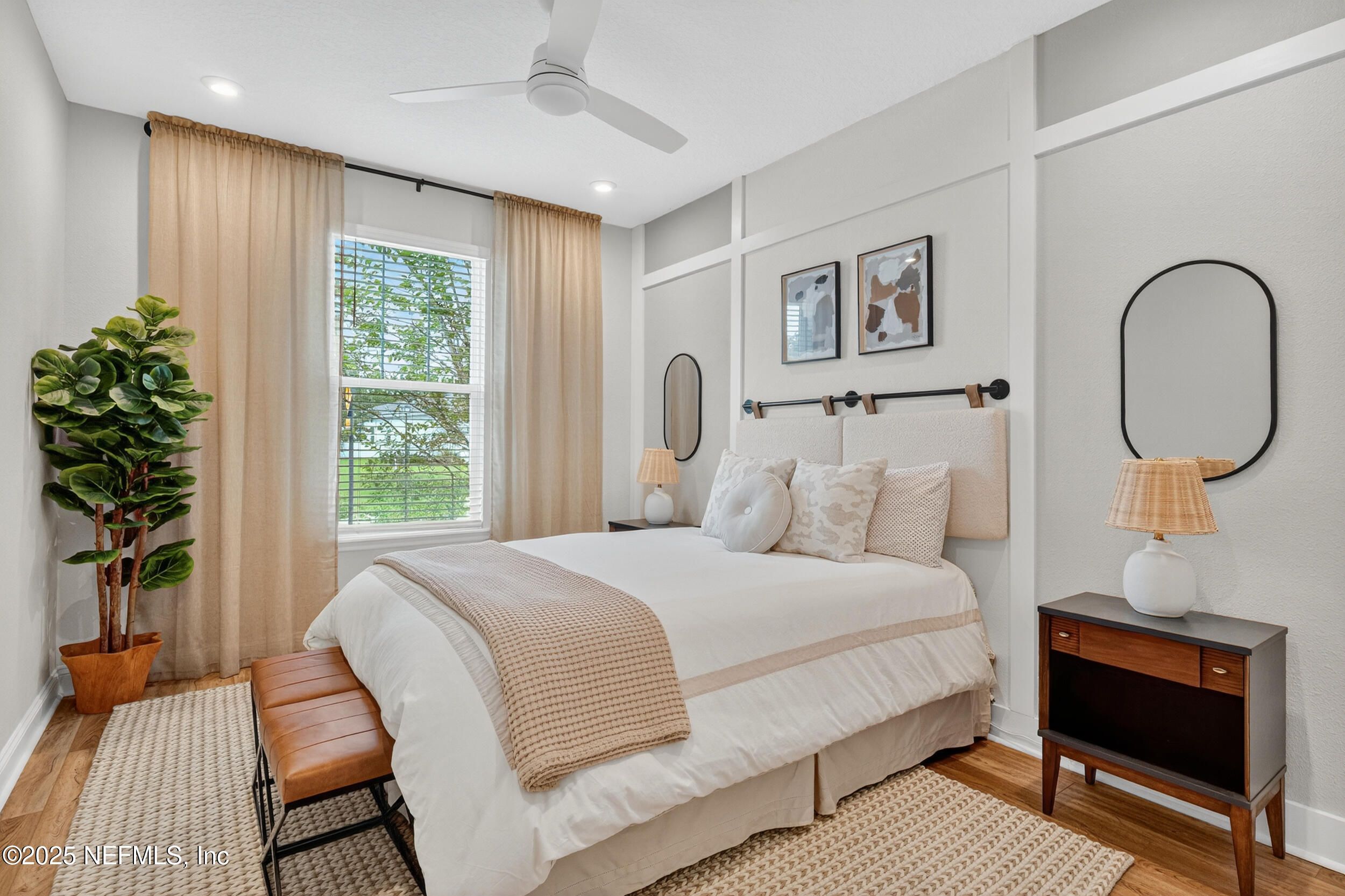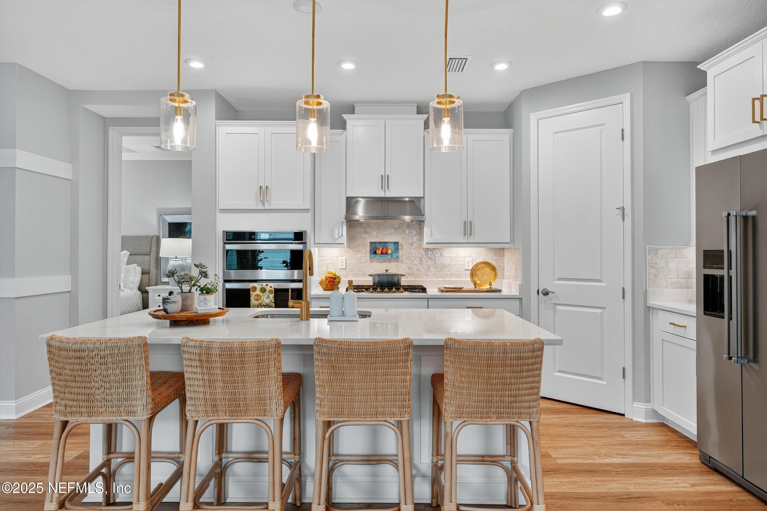 Designer-Inspired Court Model in WaterSong at RiverTown. Built in 2022, this 1712 sq ft, 2-bedroom + office/den, 2-bath home is filled with designer details and modern upgrades that set it apart. From the moment you step inside, the board and batten foyer walls, updated lighting, and warm wood luxury vinyl plank flooring set the tone for the sophisticated style that flows throughout. The great room features a custom linear fireplace with a wood surround and mantle, accented by a propeller-blade ceiling fan. In the dining area, custom trim work adds charm, while the chef's kitchen impresses with quartz countertops, brass hardware, stainless steel Whirlpool appliances, a glazed whitewashed brick-look backsplash, and a gas cooktop with brass accents. A large dining island with panel detailing is the perfect centerpiece for entertaining. Retreat to the primary suite, complete with chandelier lighting, a spacious walk-in closet with built-in luggage racks, and a spa-like bath boasting a zero-entry shower with a river rock accent wall, shiplap vanity backdrop, circular mirrors, and waterfall faucets. The second bedroom also features custom wall detail, and the secondary bath showcases European tile floors and modern finishes. Additional highlights include a barn-door flex room/den, well-appointed laundry room with cabinets and shelving, smart Clare security system, tankless water heater, epoxy-coated garage flooring, and a screened lanai overlooking a walking path and tranquil pond views. Step outside your door and enjoy WaterSong's exclusive 55+ amenities, plus all of RiverTown's resort-style offeringsfrom multiple pools (including lazy river and riverfront zero-entry), to pickleball, tennis, fitness centers, nature trails, riverfront dining, and a full calendar of community events. This home blends luxury finishes, thoughtful design, and a lifestyle that feels like a year-round vacation.