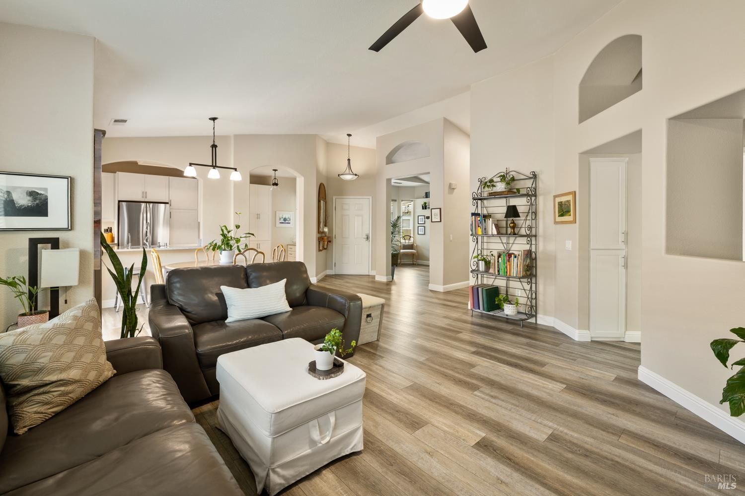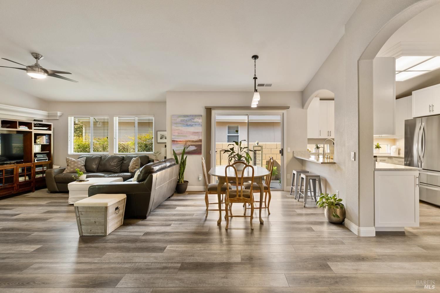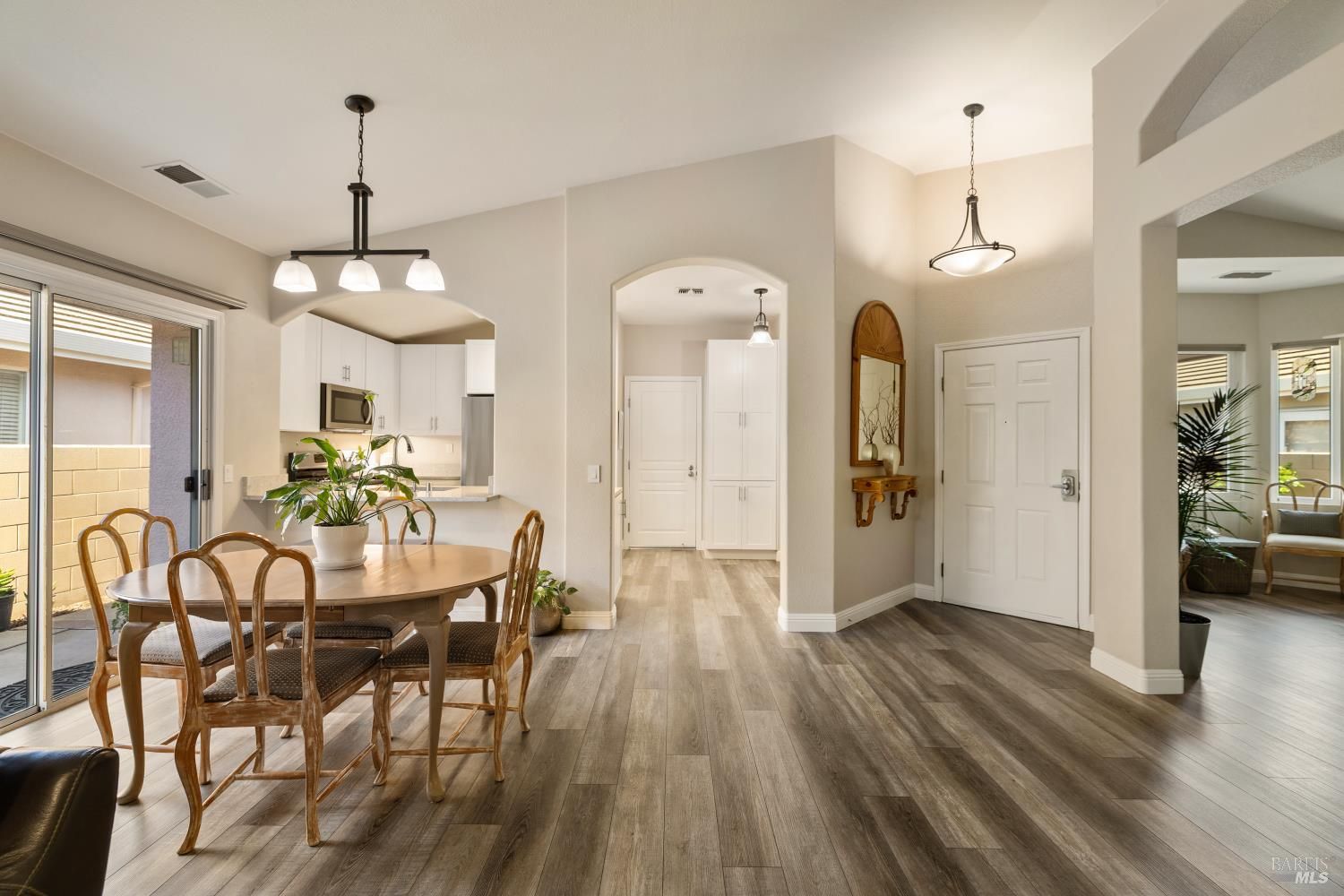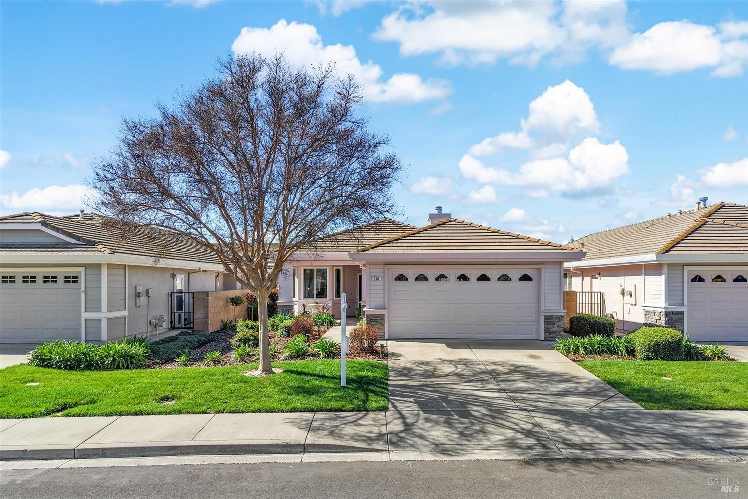 Carefree, relaxed living is yours in distinguished and beautiful Diamond Grove; this HOA covers exterior painting, roof, gutters, front yard landscape maintenance, as well as a large swimming pool, patio, clubhouse, and social activities! Inside, discover newly installed luxury vinyl plank flooring throughout, enhanced baseboards, soaring ceilings, and natural light that creates an open, inviting atmosphere. The fully remodeled kitchen is designed for both everyday living and entertaining, showcasing elegant white cabinetry with soft-close doors, glass accents, rollout shelves and pantry cabinets, built-in wine storage, and a convenient electronic charging station, stunning quartz countertops, stainless-steel deep sink, stainless-steel dishwasher, microwave and gas range, decorative rain glass windows, and a custom dining bar. The thoughtfully designed floorplan features a welcoming den with a charming bay window and a spacious great room where the dining area flows seamlessly into the family room with sliding glass door access to the backyard. The primary suite offers exterior access, high ceilings, a large walk-in closet with shelving, and a spa-inspired bathroom complete with dual sink quartz vanity, tiled shower with rainfall shower doors, updated lighting, fixtures, tilting mirrors, bidet, and elegant chandelier. Interior laundry is conveniently located next to the secondary full bathroom which features an updated vanity, fixtures, and a walk-in tub. Additional upgrades include fresh exterior paint, matching white cabinetry and quartz surfaces throughout, high-end dual pane windows with TruScene screens, ceiling fans and added lighting in bedrooms and living room, chandeliers in the entry and dining room, front and rear see-through security screen doors, and keyless front door entry. The 2-car garage offers a workbench space and plumbing for a water softener and reverse osmosis system. The professionally landscaped backyard is a private retreat, designed with a fountain that complement the stone accented retaining wall, low voltage lighting, timed irrigation, raised garden beds, turf grass, patio area and decorative edibles including pomegranate, navel orange, Satsuma mandarin, fig, Eureka lemon, Meyer lemon, grape, and raspberry plants. With countless upgrades, an HOA offering expansive amenities, and a convenient location near shopping, dining, and easy freeway access, this home is one not to miss.