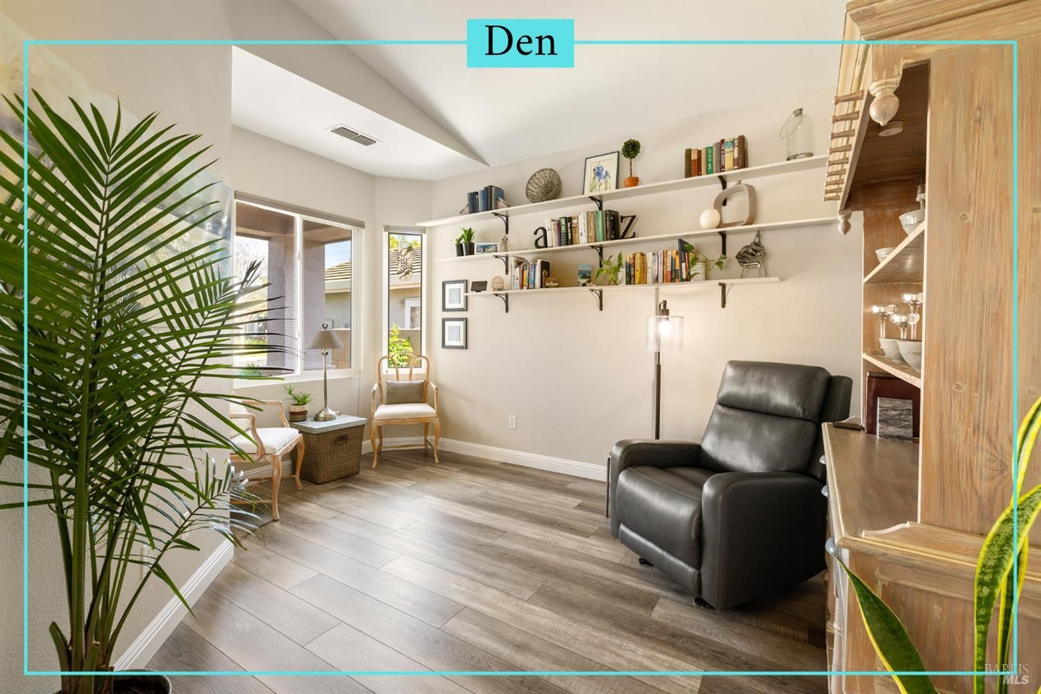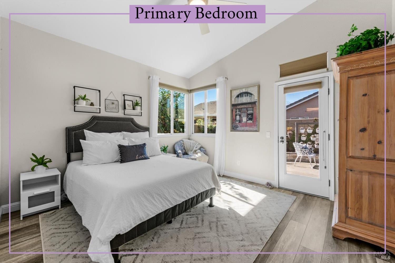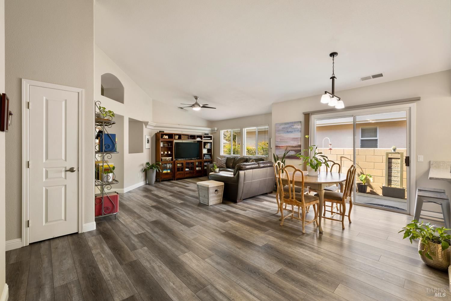 Carefree, relaxed living is yours in distinguished and beautiful Diamond Grove; this HOA covers exterior painting, roof, gutters, front yard landscape maintenance, as well as a large swimming pool, patio, clubhouse, and social activities! Inside, discover newly installed luxury vinyl plank flooring throughout, enhanced baseboards, soaring ceilings, and natural light that creates an open, inviting atmosphere. The fully remodeled kitchen is designed for both everyday living and entertaining, showcasing elegant white cabinetry with soft-close doors, glass accents, rollout shelves and pantry cabinets, built-in wine storage, and a convenient electronic charging station, stunning quartz countertops, stainless-steel deep sink, stainless-steel dishwasher, microwave and gas range, decorative rain glass windows, and a custom dining bar. The thoughtfully designed floorplan features a welcoming den with a charming bay window and a spacious great room where the dining area flows seamlessly into the family room with sliding glass door access to the backyard. The primary suite offers exterior access, high ceilings, a large walk-in closet with shelving, and a spa-inspired bathroom complete with dual sink quartz vanity, tiled shower with rainfall shower doors, updated lighting, fixtures, tilting mirrors, bidet, and elegant chandelier. Interior laundry is conveniently located next to the secondary full bathroom which features an updated vanity, fixtures, and a walk-in tub. Additional upgrades include fresh exterior paint, matching white cabinetry and quartz surfaces throughout, high-end dual pane windows with TruScene screens, ceiling fans and added lighting in bedrooms and living room, chandeliers in the entry and dining room, front and rear see-through security screen doors, and keyless front door entry. The 2-car garage offers a workbench space and plumbing for a water softener and reverse osmosis system. The professionally landscaped backyard is a private retreat, designed with a fountain that complement the stone accented retaining wall, low voltage lighting, timed irrigation, raised garden beds, turf grass, patio area and decorative edibles including pomegranate, navel orange, Satsuma mandarin, fig, Eureka lemon, Meyer lemon, grape, and raspberry plants. With countless upgrades, an HOA offering expansive amenities, and a convenient location near shopping, dining, and easy freeway access, this home is one not to miss.