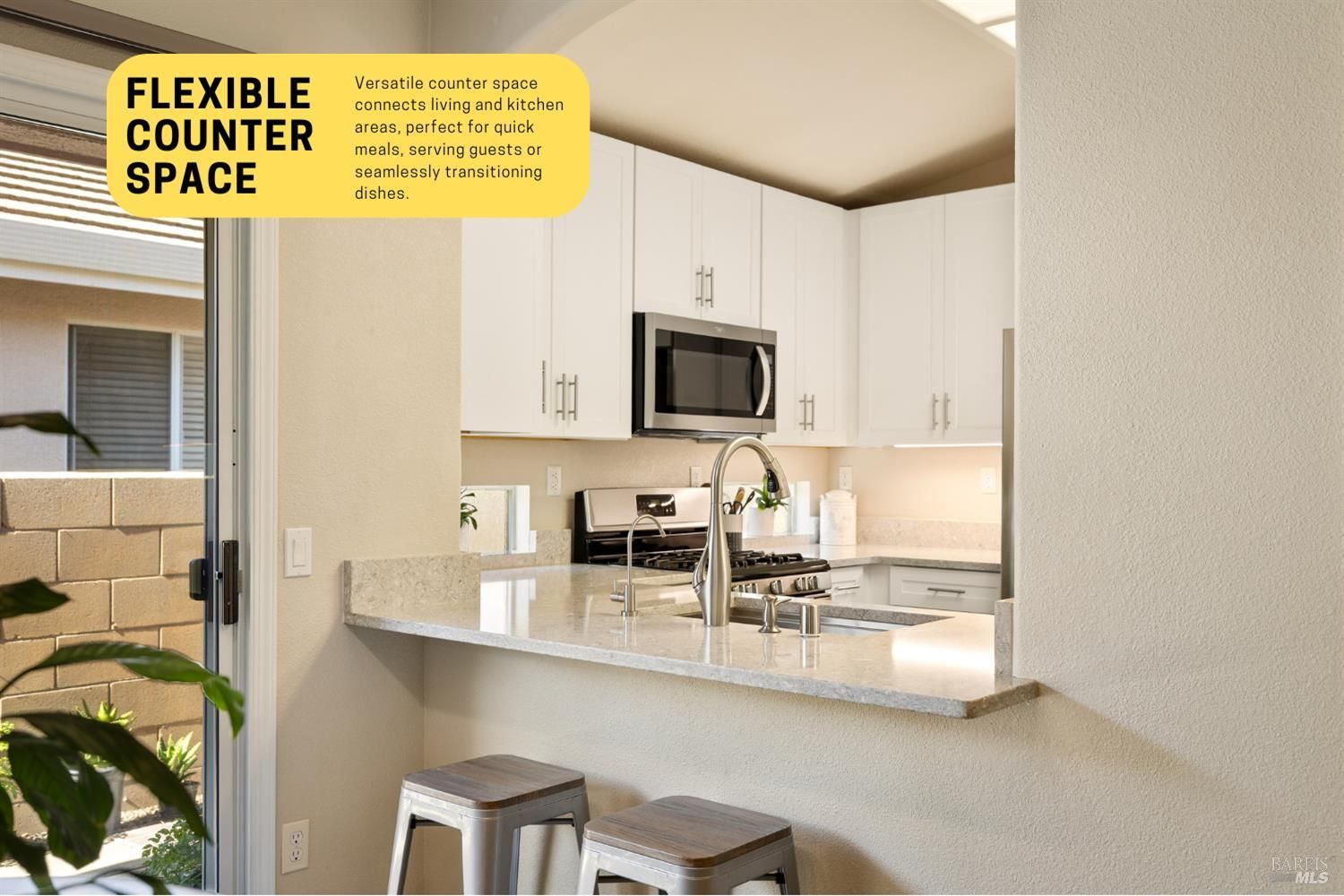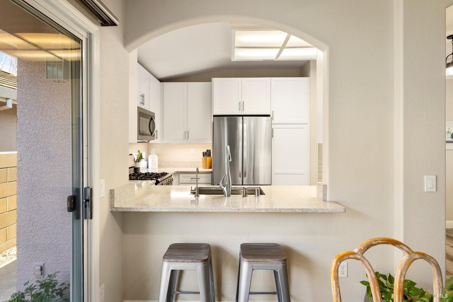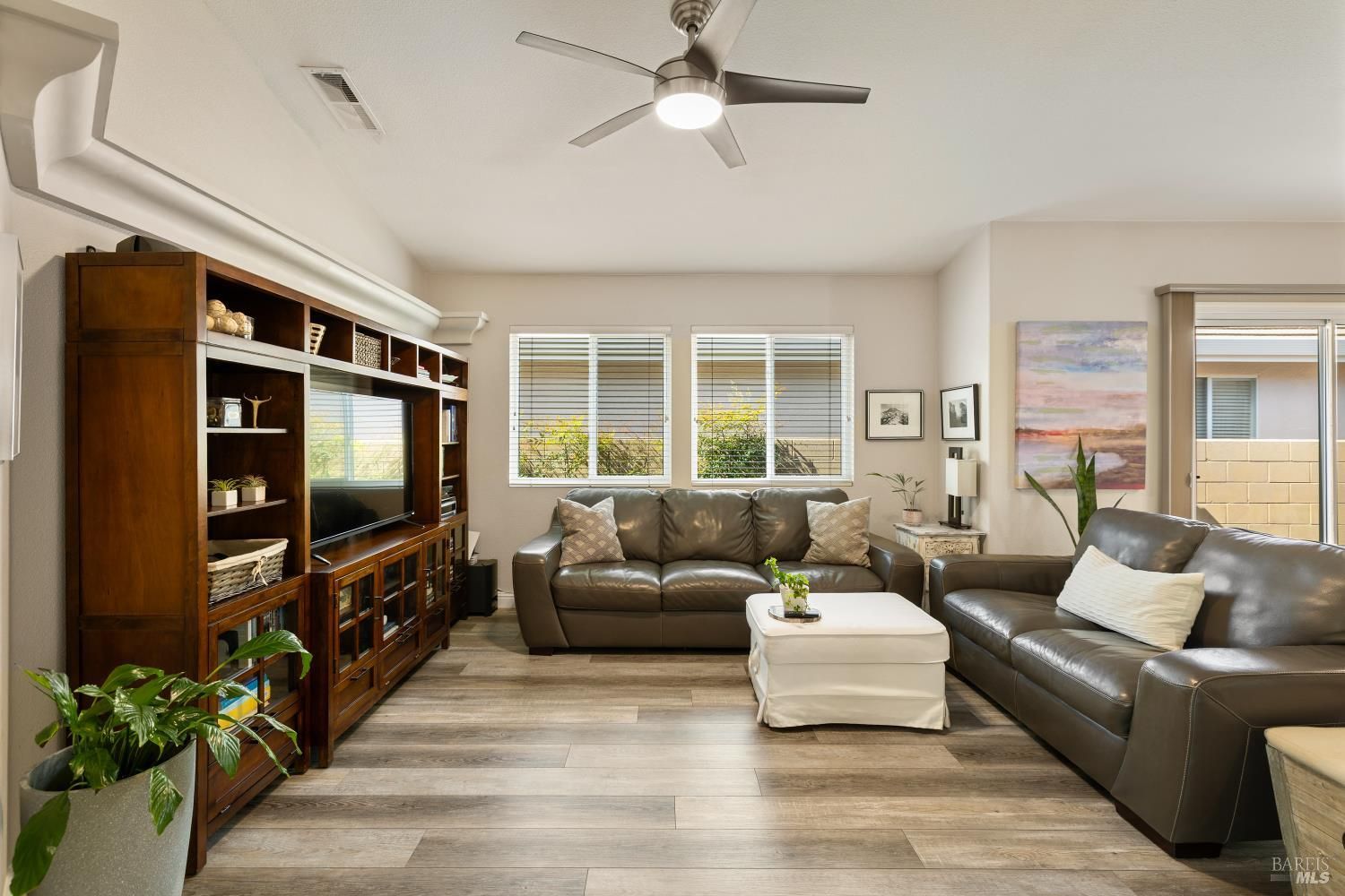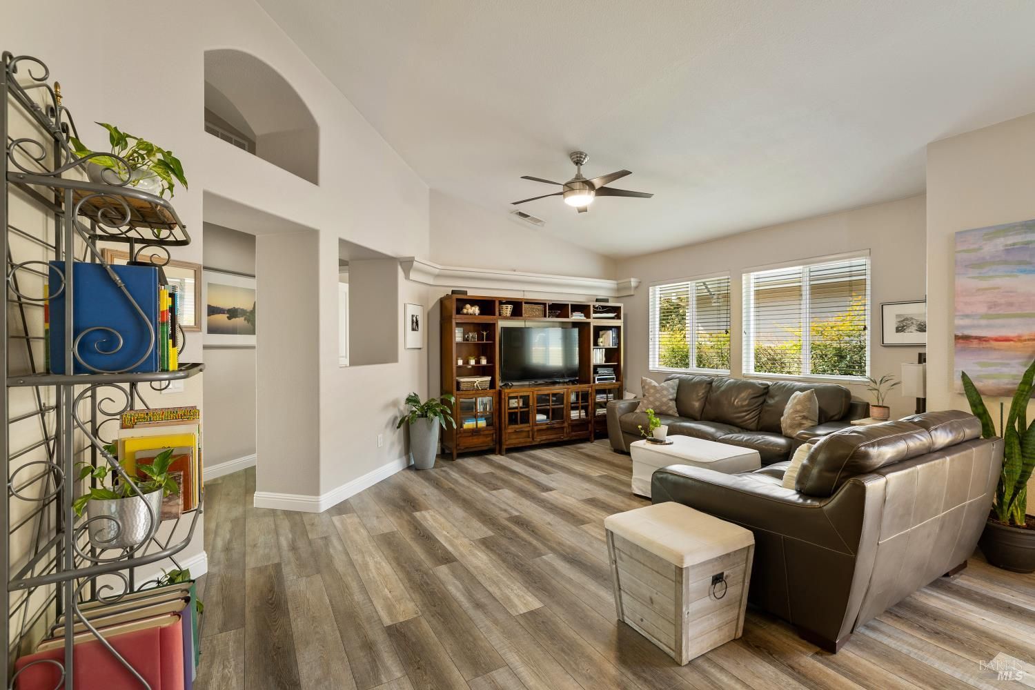 Carefree, relaxed living is yours in distinguished and beautiful Diamond Grove; this HOA covers exterior painting, roof, gutters, front yard landscape maintenance, as well as a large swimming pool, patio, clubhouse, and social activities! Inside, discover newly installed luxury vinyl plank flooring throughout, enhanced baseboards, soaring ceilings, and natural light that creates an open, inviting atmosphere. The fully remodeled kitchen is designed for both everyday living and entertaining, showcasing elegant white cabinetry with soft-close doors, glass accents, rollout shelves and pantry cabinets, built-in wine storage, and a convenient electronic charging station, stunning quartz countertops, stainless-steel deep sink, stainless-steel dishwasher, microwave and gas range, decorative rain glass windows, and a custom dining bar. The thoughtfully designed floorplan features a welcoming den with a charming bay window and a spacious great room where the dining area flows seamlessly into the family room with sliding glass door access to the backyard. The primary suite offers exterior access, high ceilings, a large walk-in closet with shelving, and a spa-inspired bathroom complete with dual sink quartz vanity, tiled shower with rainfall shower doors, updated lighting, fixtures, tilting mirrors, bidet, and elegant chandelier. Interior laundry is conveniently located next to the secondary full bathroom which features an updated vanity, fixtures, and a walk-in tub. Additional upgrades include fresh exterior paint, matching white cabinetry and quartz surfaces throughout, high-end dual pane windows with TruScene screens, ceiling fans and added lighting in bedrooms and living room, chandeliers in the entry and dining room, front and rear see-through security screen doors, and keyless front door entry. The 2-car garage offers a workbench space and plumbing for a water softener and reverse osmosis system. The professionally landscaped backyard is a private retreat, designed with a fountain that complement the stone accented retaining wall, low voltage lighting, timed irrigation, raised garden beds, turf grass, patio area and decorative edibles including pomegranate, navel orange, Satsuma mandarin, fig, Eureka lemon, Meyer lemon, grape, and raspberry plants. With countless upgrades, an HOA offering expansive amenities, and a convenient location near shopping, dining, and easy freeway access, this home is one not to miss.