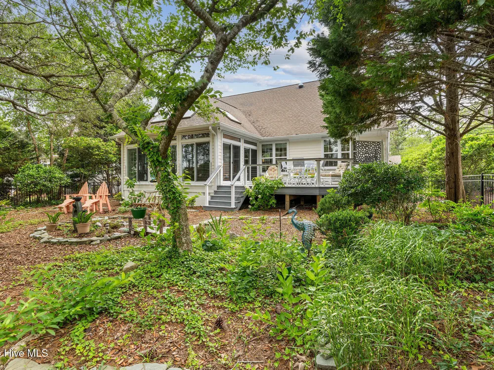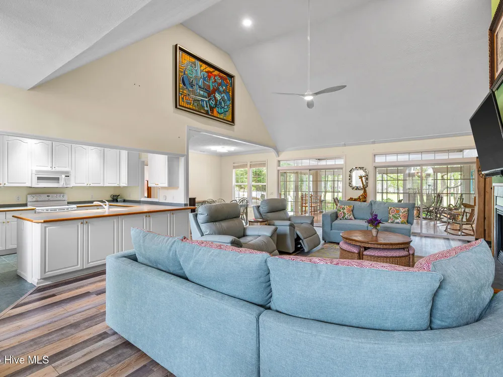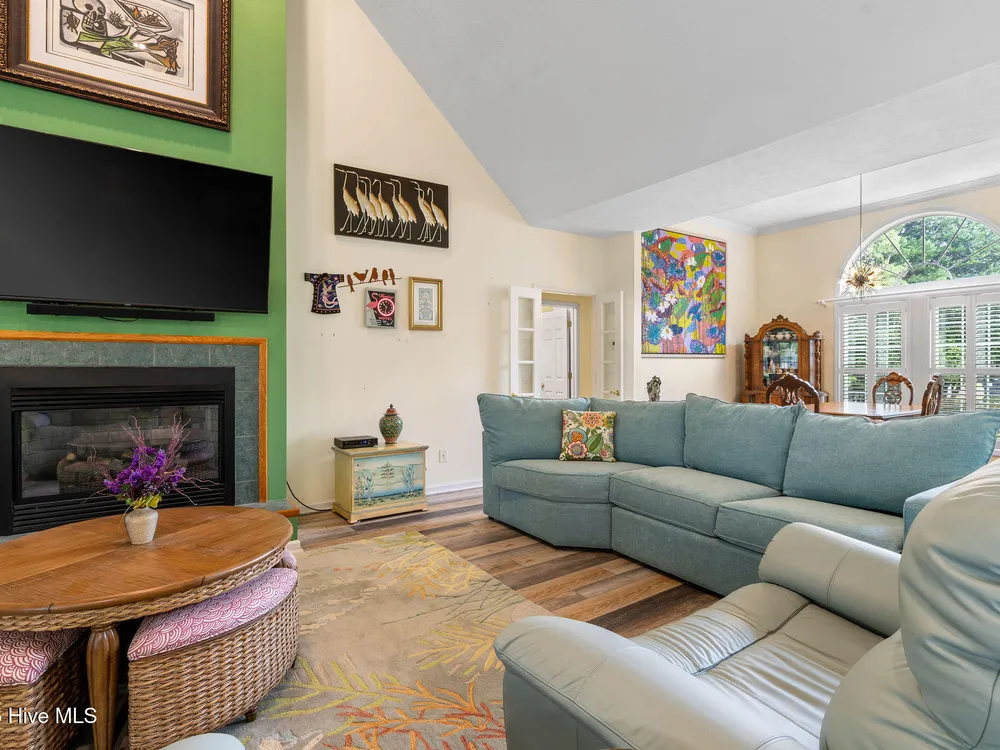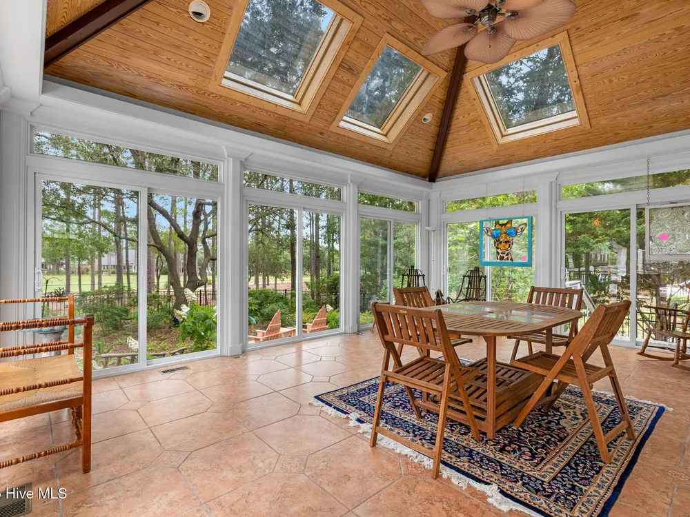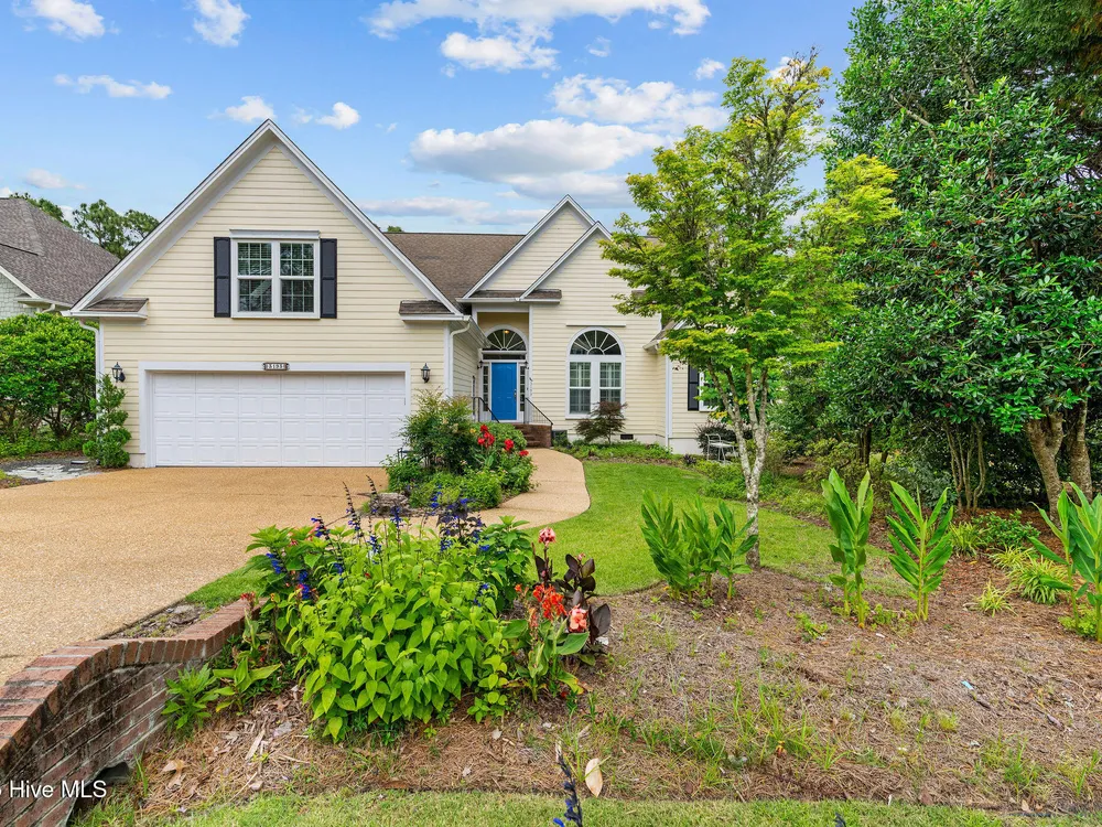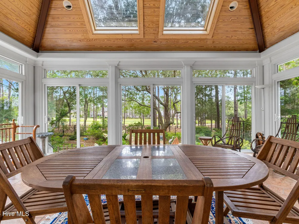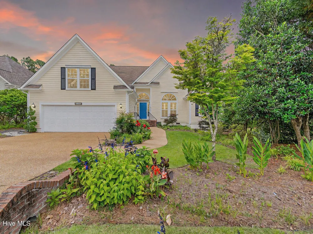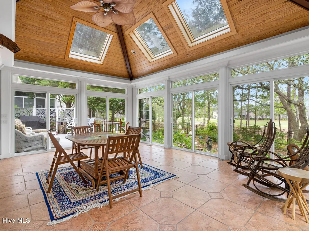 Welcome to 3193 Wexford Way, a delightful 3-bedroom, 2-bathroom home that exudes charm from the moment you arrive. The property boasts eye-catching curb appeal with vibrant, well-maintained landscaping that adds a burst of color and warmth to the front yard. An exposed aggregate driveway and matching walkway lead to the inviting front entrance, where classic brick steps provide a graceful transition into the home. This welcoming exterior sets the stage for a residence that combines comfort, style, and a sense of home. Step inside the welcoming foyer, where natural light pours in through the sidelights and arched transom window framing the front door, illuminating the coastal blue tiled flooring. From here, the home opens into a spacious, open-concept living room featuring a soaring vaulted ceiling and stylish LVP flooring. A gas fireplace, elegantly trimmed in tile and wood and set within a striking floor-to-ceiling surround, serves as the focal point of the room. Large sliding glass doors usher in even more natural light and lead to the stunning sunroom, where a tongue and groove ceiling with detailed beams and skylights enhances the airy, serene atmosphere. Here, panoramic views stretch across the lush, garden-like backyard landscaping to the golf course just beyond the fenced yard, offering a peaceful and picturesque retreat.Perfect for entertaining, the home offers a formal dining room that flows seamlessly into the open living space, ideal for hosting large gatherings. A casual dining area, complete with a convenient pass-through to the kitchen, provides a more relaxed setting for everyday meals. The kitchen is both functional and inviting, featuring pristine white cabinetry and appliances, ample storage and counter space, and a dedicated pantry. For outdoor dining and summer barbecues, a large open patio offers the ideal grilling spot, while a closed-in porch--accessible from both the backyard and the living room--invites quiet moments of relaxation