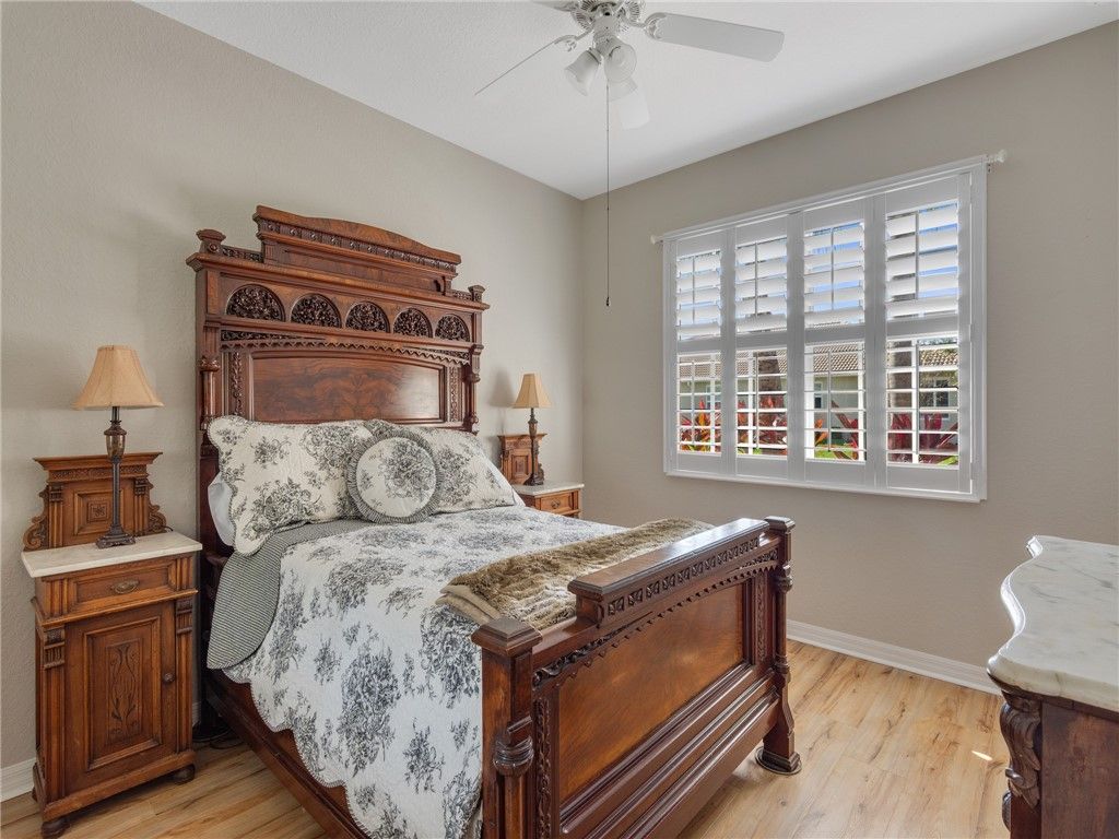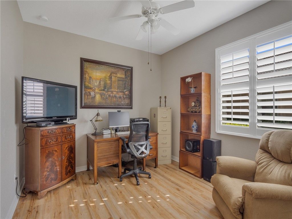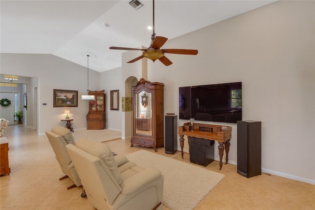 This sturdy and stunning home is an outstanding value w/impact glass, a beautiful & open floor plan w/cathedral ceilings, granite counters, crown molding, plantation shutters, tile floors, whole house water filtration w/tons of additional upgrades you'll appreciate. Woodfield is a popular & active 55+ neighborhood where neighbors love to socialize, play tennis & pickleball, take excursions, plan dinners, walk their dogs, & love on friends & neighbors. So nice! This home is a short walk to the clubhouse. 5 min to town! This home has lowest HOA dues/clubhouse due to total assessment is paid off.