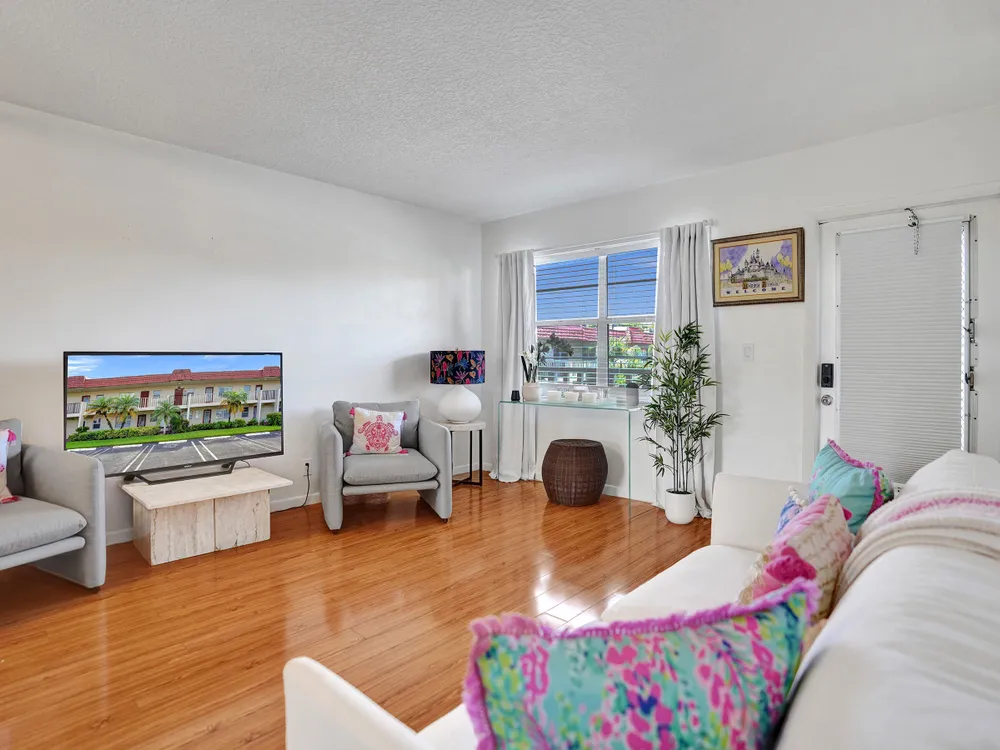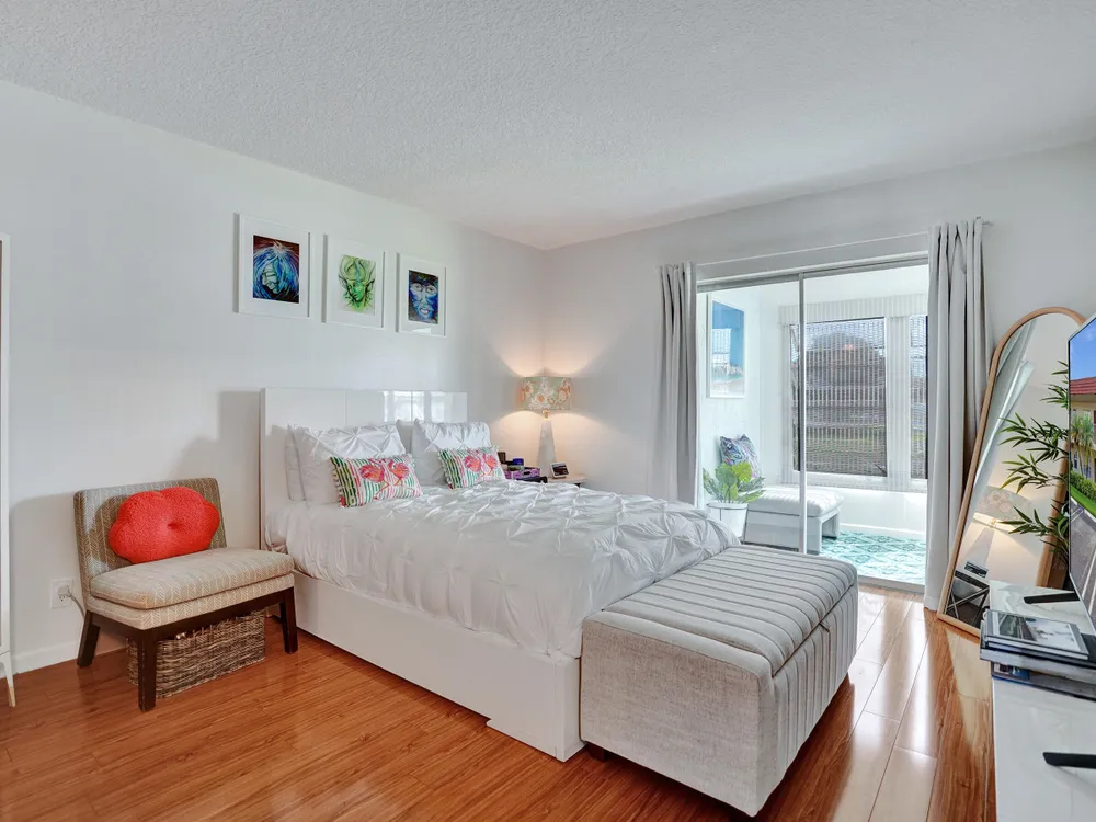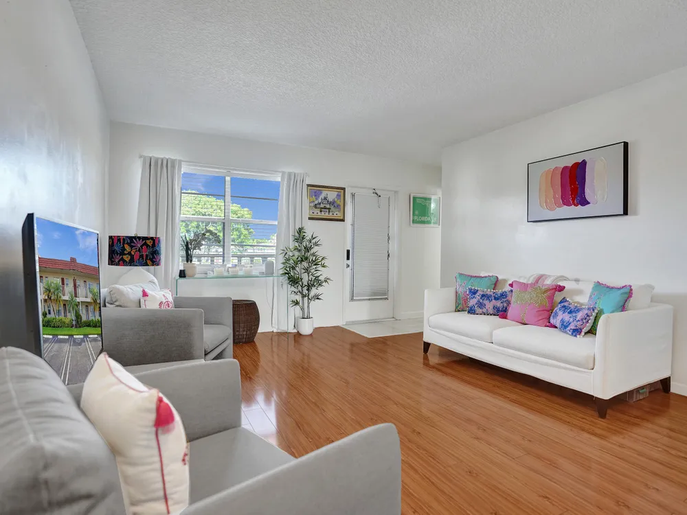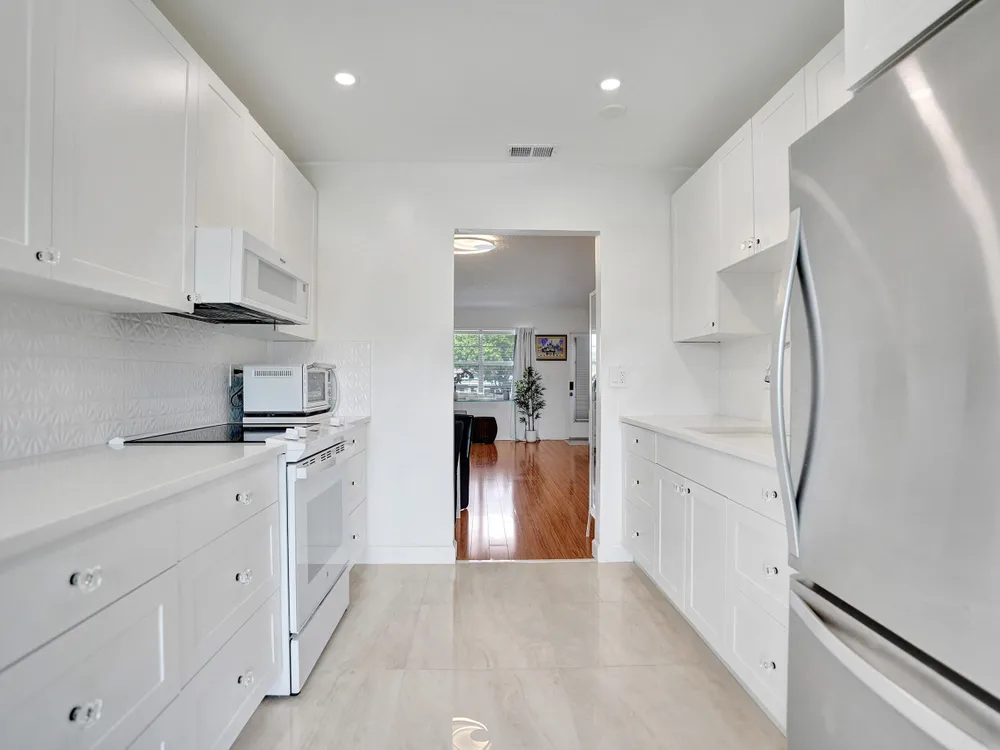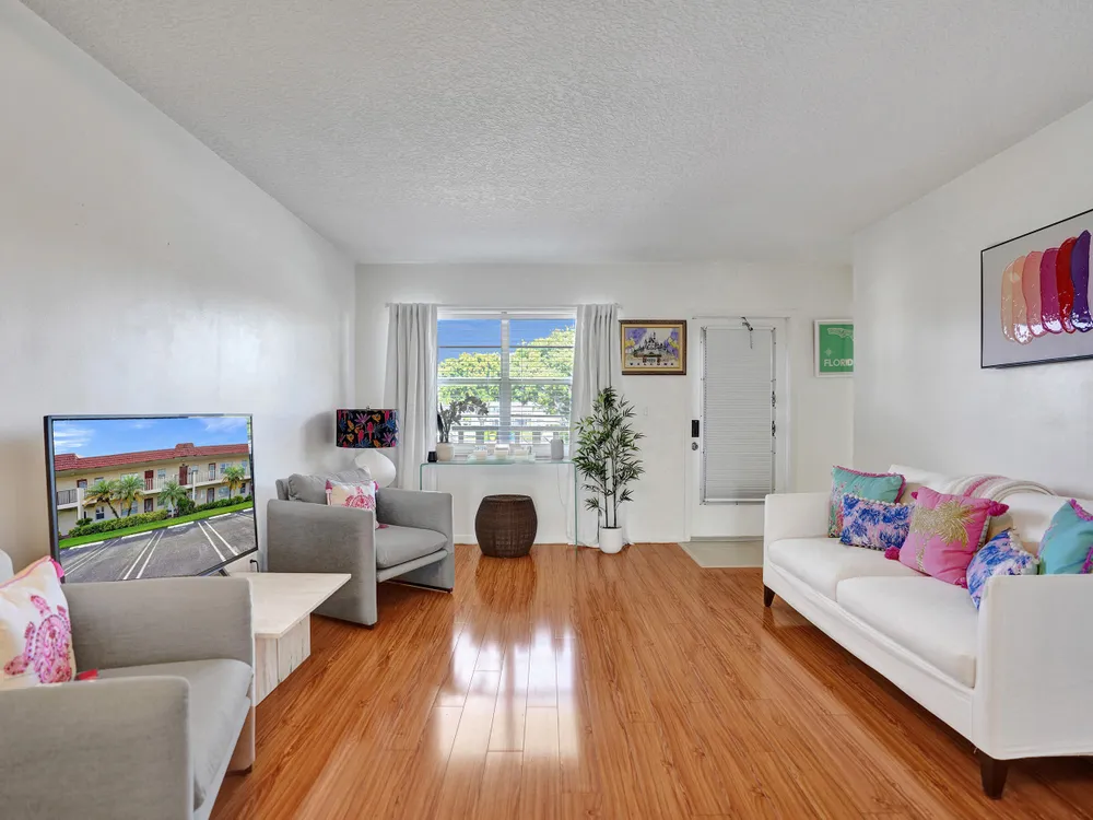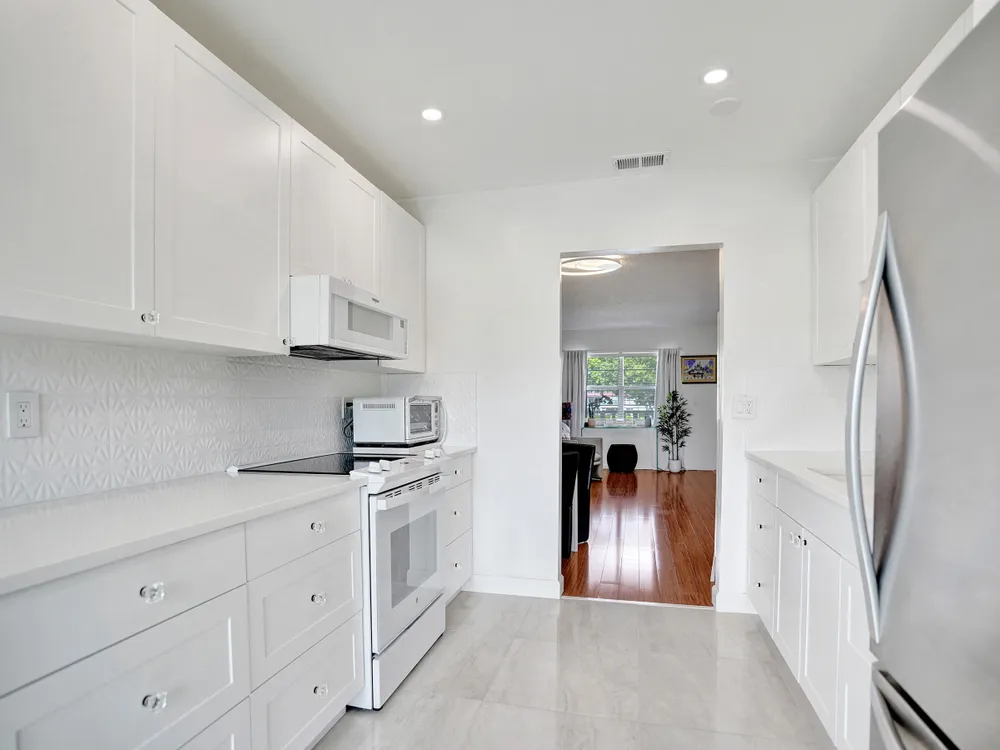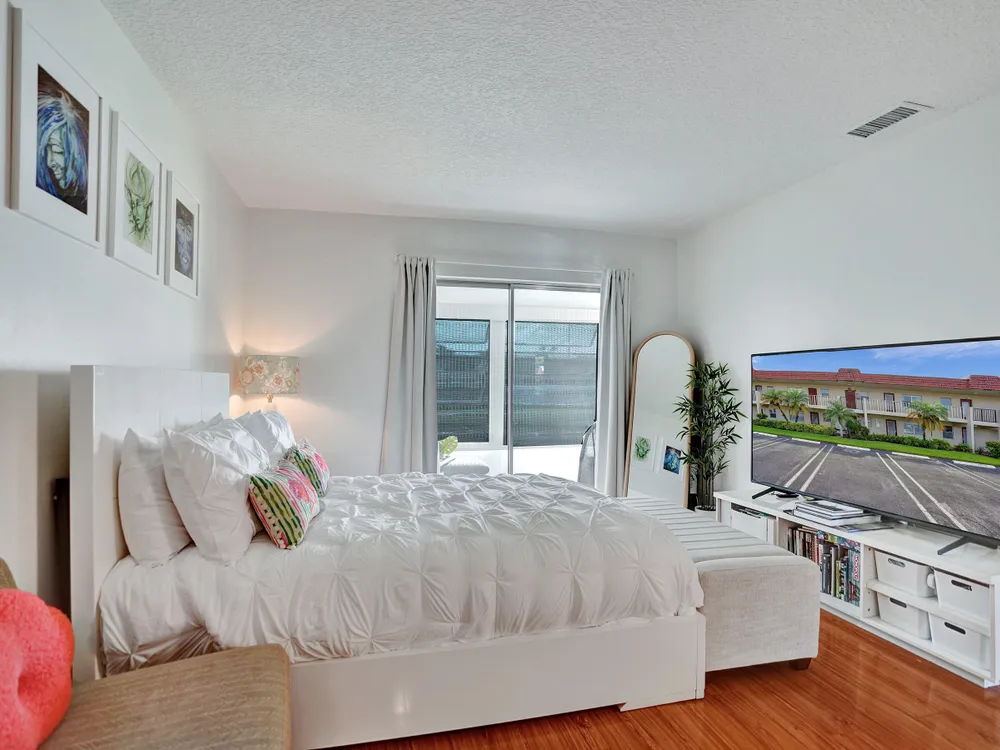 Fully renovated in 2023, this pristine 1-bedroom, 1.5-bath condo in Delray Beach's top-rated 55+ community offers stunning water views from the enclosed Florida room with double balconies. The modern galley kitchen features quartz countertops, stacked drawers, a designer backsplash, garbage disposal, and top-of-the-line stainless steel appliancesa"including a stove that's barely been used. Porcelain flooring flows throughout, complemented by custom LED lighting, crystal knobs, and high-end doors. Both bathrooms are completely updated with frameless glass doors and elegant finishes. The spacious bedroom includes a custom walk-in closet. Enjoy peace of mind with a 2023 roof, A/C (2018), water heater (2019), and upgraded outlets and switches. HOA covers internet, cable, water, lawn care,
