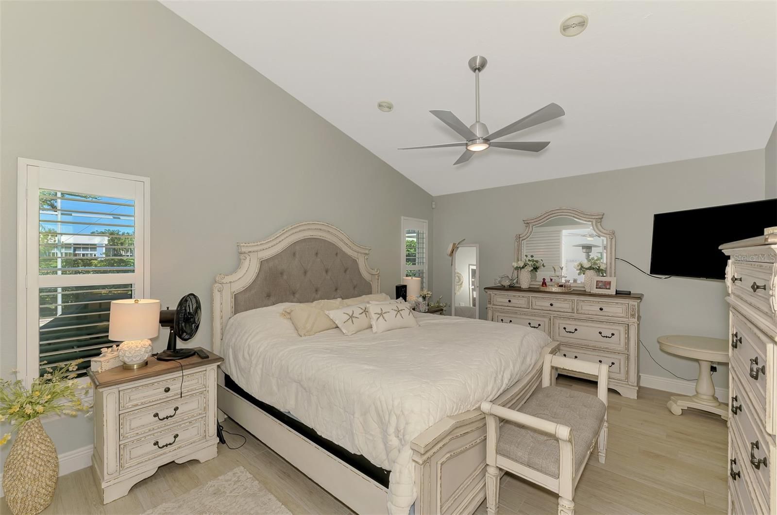 - Ceiling Fan(s), Eat-in Kitchen, Open Floorplan, Main Level Primary, Split Bedrooms, Stone Counters, Thermostat, Vaulted Ceiling(s), Walk-In Closet(s), Window Treatments