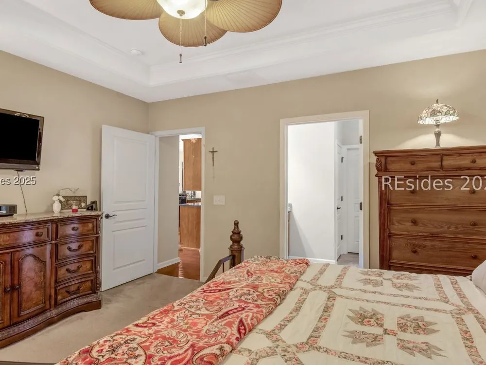 - Tray Ceiling(s), Ceiling Fan(s), Main Level Primary, Pull Down Attic Stairs, Window Treatments, Entrance Foyer