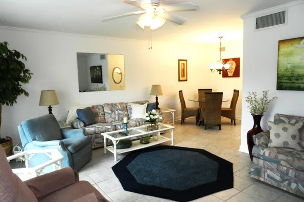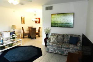 Pet Friendly! This 1 bedroom/1 bath condo is located in a secluded area of the community. New roof installed in summer of 2024. Master bedroom has 2 walk-in closets. Very spacious living room and enclosed Florida room off of bedroom. Lots of storage, nice utility closet. Very active community with clubhouse and pool located within a short walk. Enjoy privacy from the front of unit facing a hedge, no other units in sight. Close to shopping, dining, I95 and the beach.