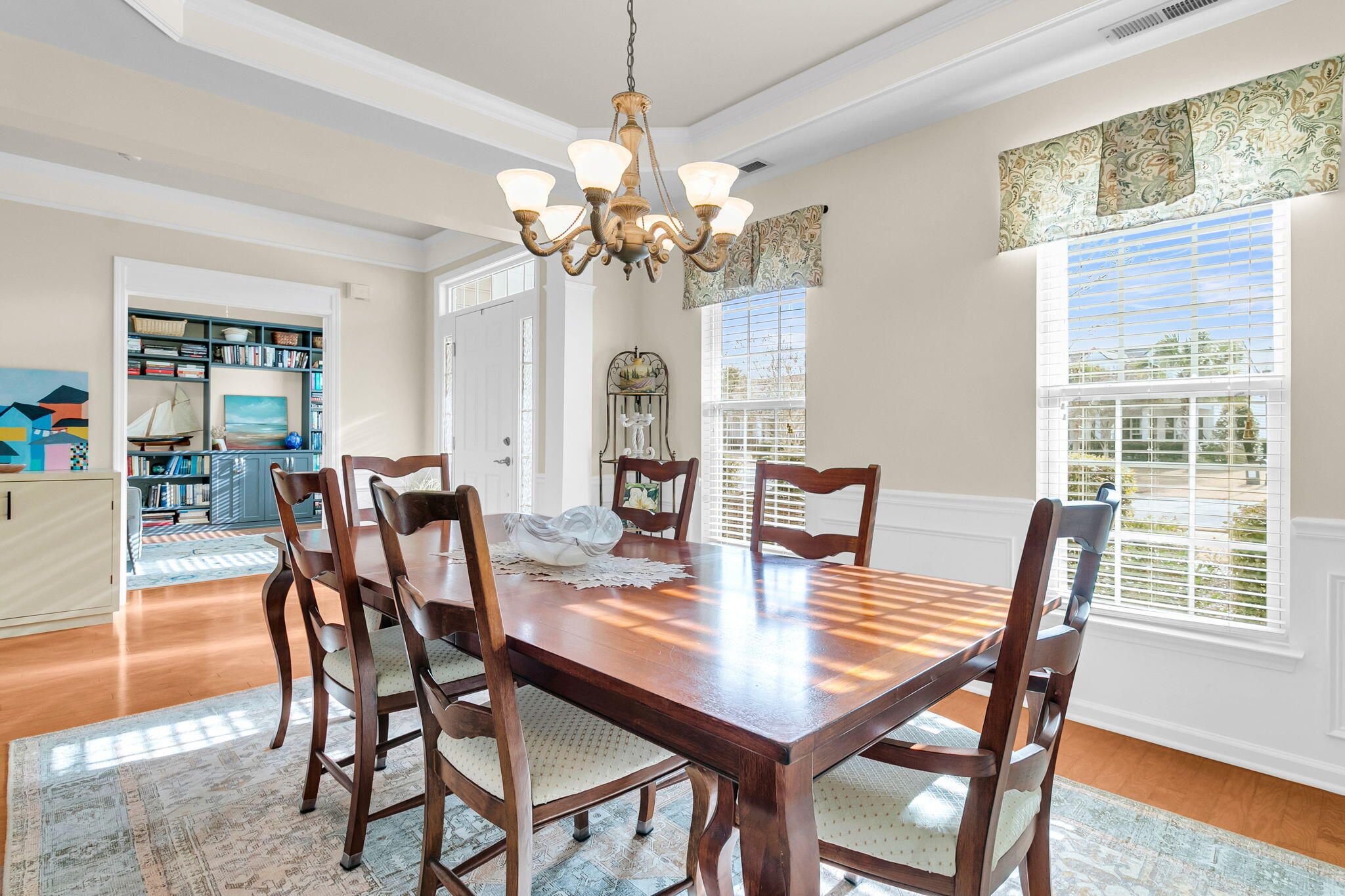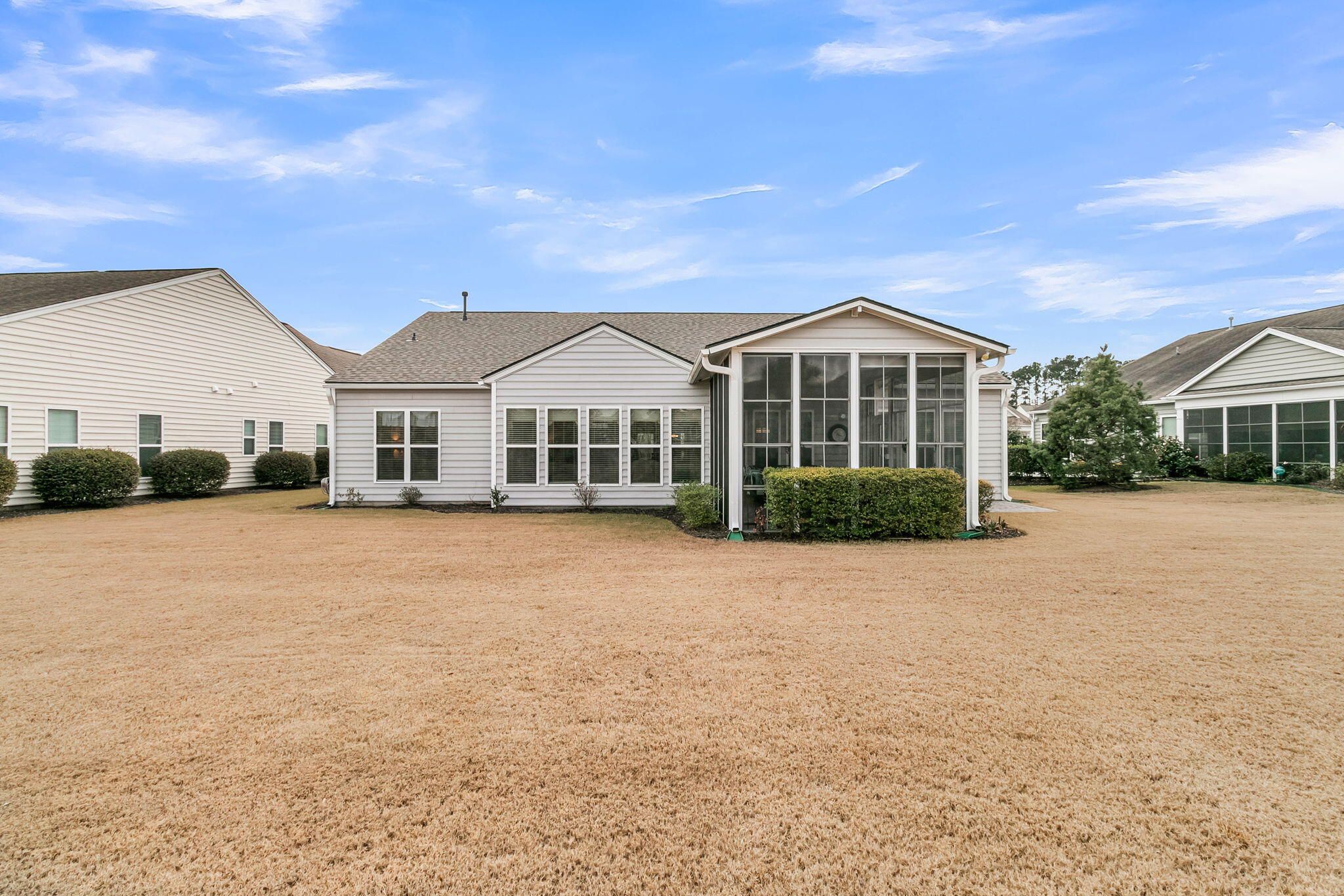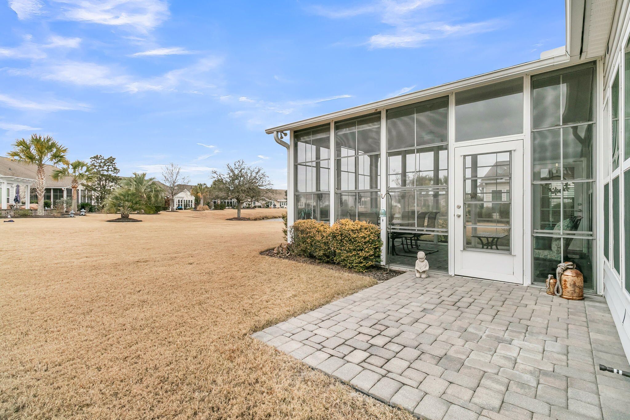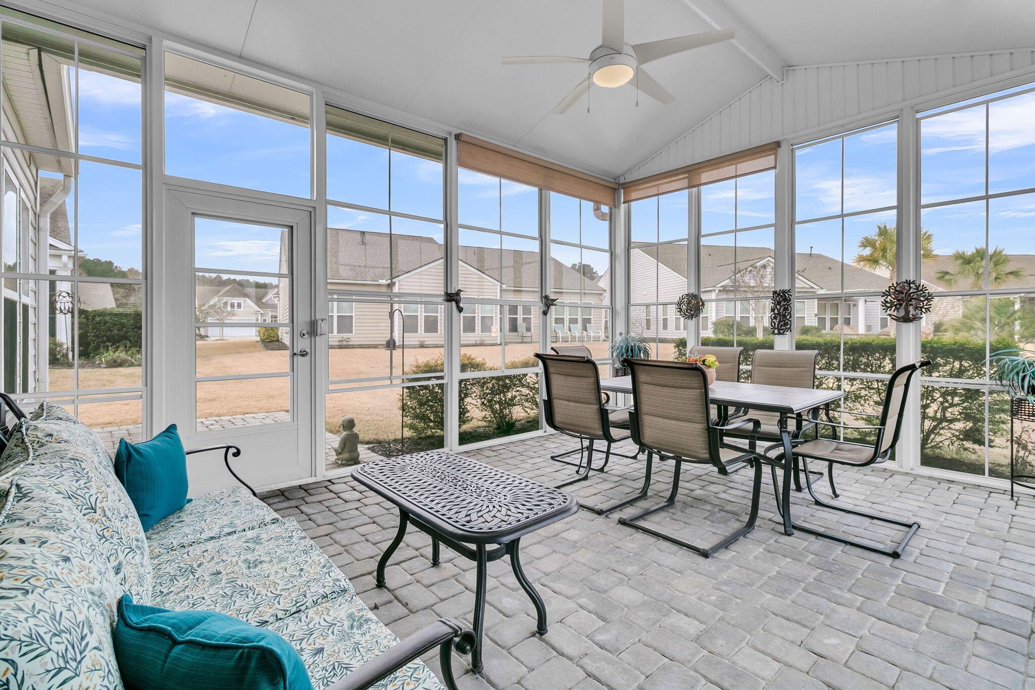 A true outdoor Oasis, this oversized homesite overlooking tons of green space with a landscaped berm on one side of the home and lagoon view, you'll find this beautiful Bluffton Cottage home in Charleston's Premier 55 plus community Del Webb Cane Bay! Featuring 3 bedrooms, 2 baths, sunroom, and large screened lanai with vinyl windows. This home is the perfect combination of renovated interior finishes and incredible location. The welcoming elongated front porch with stone pavers is the perfect place to enjoy a morning cup of coffee. As you walk inside, you're greeted by hardwood floors extending from the foyer into the dining room, great room, sunroom, bedrooms and hallways. The dining room is highlighted with a tray ceiling and wainscoting, creating an elegant dining space. A French....door office with custom built-in shelving to the right of the foyer is the perfect flex room that could be used as a third sleeping area for guests. The kitchen offers many upgrades, including granite countertops, subway tile backsplash, staggered painted Maple cabinets with crown molding, recessed can lighting, stainless steel built-in wall oven and microwave, 5 burner gas cooktop, and refrigerator. The kitchen overlooks a great room perfect for entertaining friends and family. At the back of the home is a light-filled sunroom leads to you onto the large screened-in lanai with lagoon view, vaulted ceiling, stone pavers and vinyl windows, making it a Four Seasons room to be enjoyed most of the year. From there, an exterior stone paver patio for outdoor enjoyment. The backyard setting is tranquil, the way this homesite is situation offers the owners plenty of privacy while also enjoying the beautiful landscaping surrounding the home and peaceful lagoon view. Back inside you'll find the Primary bedroom which includes a tray ceiling and beautifully renovated primary bathroom suite featuring double sink vanity, framed mirrors, walk-in tiled shower, and large walk-in closet with custom built-ins. The second bedroom is 11' x 18' and has an attached bathroom making it the perfect second primary bedroom or guest suite. The laundry room is outfitted with upper storage cabinets above the washer and dryer and floor to ceiling cabinets on the other side. From there, a two car garage with epoxy floor complete with additional storage cabinets and wall storage systems in place. New roof and outdoor condenser unit installed in 2023 and whole house generator included. Don't miss this incredible move-in ready home and active adult community with a full-time lifestyle director, over 100 chartered clubs and activity groups for an opportunity to meet new friends and enjoy the retired life you have always imagined. You will not be disappointed, please book your showing today!