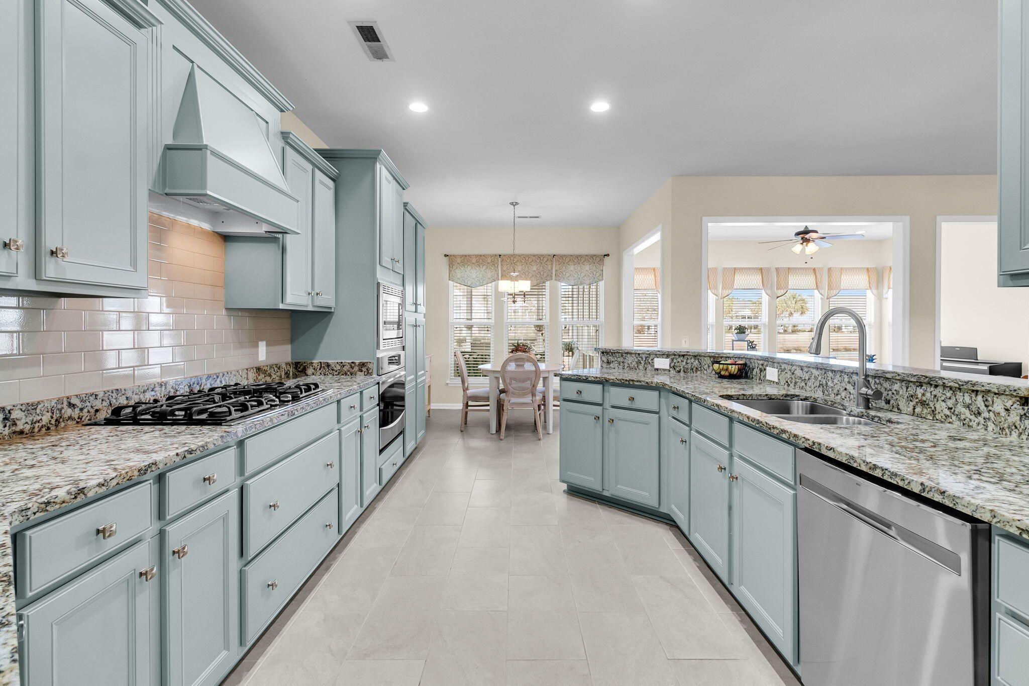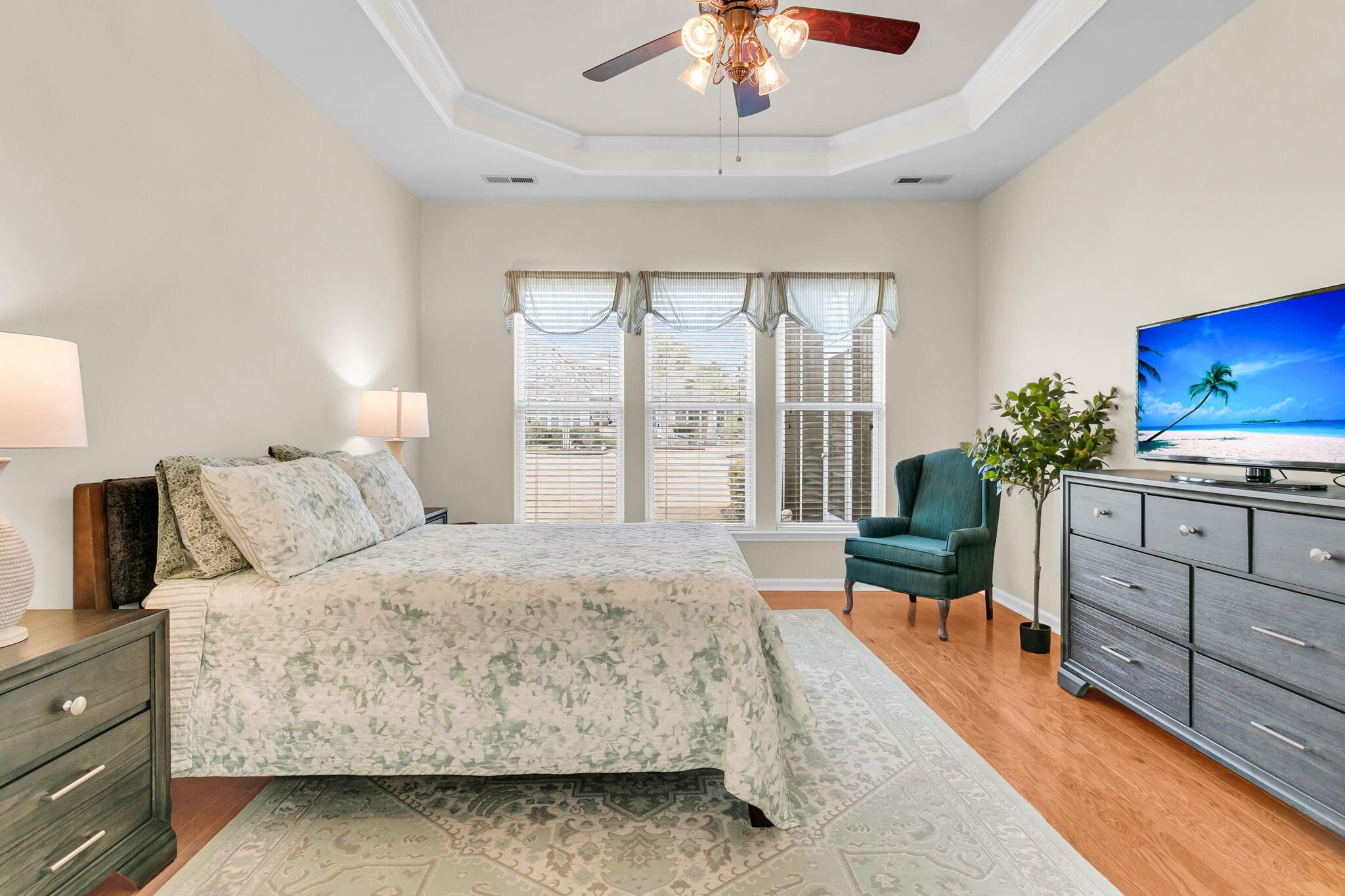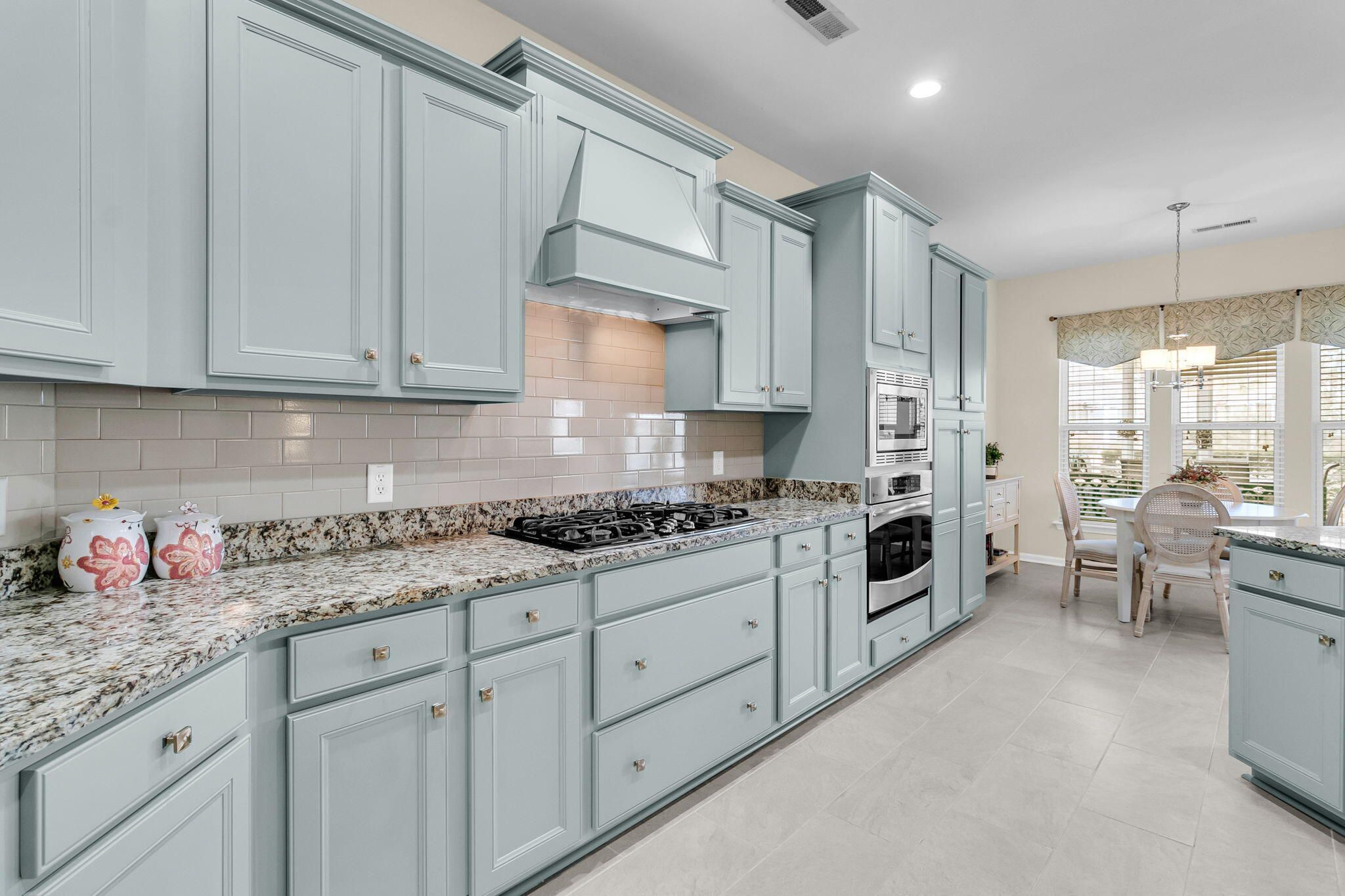 A true outdoor Oasis, this oversized homesite overlooking tons of green space with a landscaped berm on one side of the home and lagoon view, you'll find this beautiful Bluffton Cottage home in Charleston's Premier 55 plus community Del Webb Cane Bay! Featuring 3 bedrooms, 2 baths, sunroom, and large screened lanai with vinyl windows. This home is the perfect combination of renovated interior finishes and incredible location. The welcoming elongated front porch with stone pavers is the perfect place to enjoy a morning cup of coffee. As you walk inside, you're greeted by hardwood floors extending from the foyer into the dining room, great room, sunroom, bedrooms and hallways. The dining room is highlighted with a tray ceiling and wainscoting, creating an elegant dining space. A French....door office with custom built-in shelving to the right of the foyer is the perfect flex room that could be used as a third sleeping area for guests. The kitchen offers many upgrades, including granite countertops, subway tile backsplash, staggered painted Maple cabinets with crown molding, recessed can lighting, stainless steel built-in wall oven and microwave, 5 burner gas cooktop, and refrigerator. The kitchen overlooks a great room perfect for entertaining friends and family. At the back of the home is a light-filled sunroom leads to you onto the large screened-in lanai with lagoon view, vaulted ceiling, stone pavers and vinyl windows, making it a Four Seasons room to be enjoyed most of the year. From there, an exterior stone paver patio for outdoor enjoyment. The backyard setting is tranquil, the way this homesite is situation offers the owners plenty of privacy while also enjoying the beautiful landscaping surrounding the home and peaceful lagoon view. Back inside you'll find the Primary bedroom which includes a tray ceiling and beautifully renovated primary bathroom suite featuring double sink vanity, framed mirrors, walk-in tiled shower, and large walk-in closet with custom built-ins. The second bedroom is 11' x 18' and has an attached bathroom making it the perfect second primary bedroom or guest suite. The laundry room is outfitted with upper storage cabinets above the washer and dryer and floor to ceiling cabinets on the other side. From there, a two car garage with epoxy floor complete with additional storage cabinets and wall storage systems in place. New roof and outdoor condenser unit installed in 2023 and whole house generator included. Don't miss this incredible move-in ready home and active adult community with a full-time lifestyle director, over 100 chartered clubs and activity groups for an opportunity to meet new friends and enjoy the retired life you have always imagined. You will not be disappointed, please book your showing today!