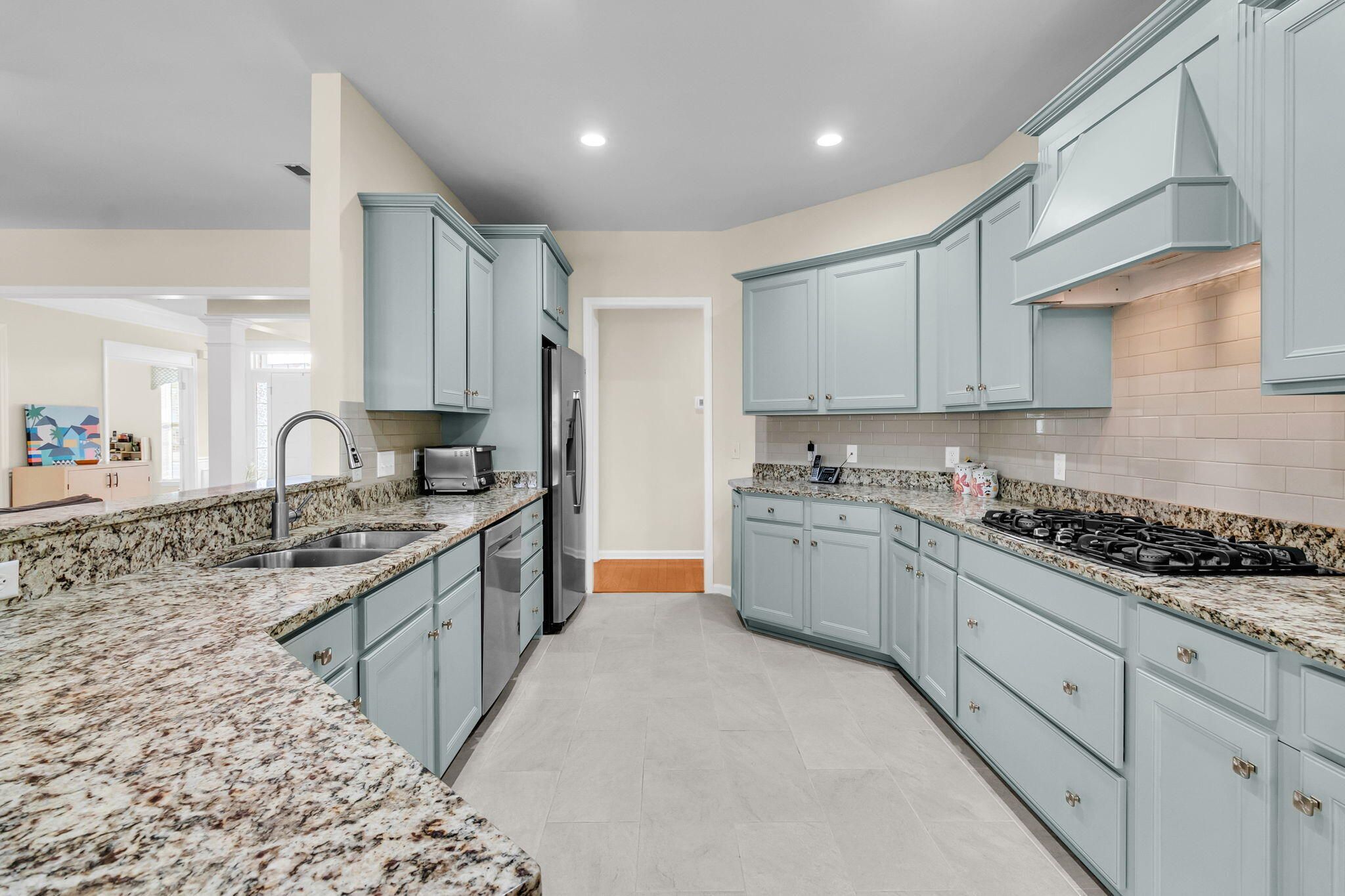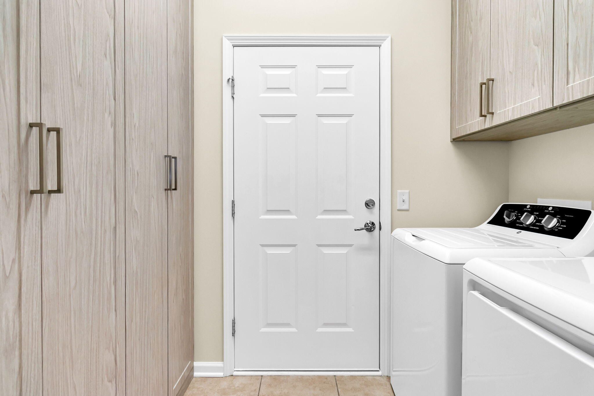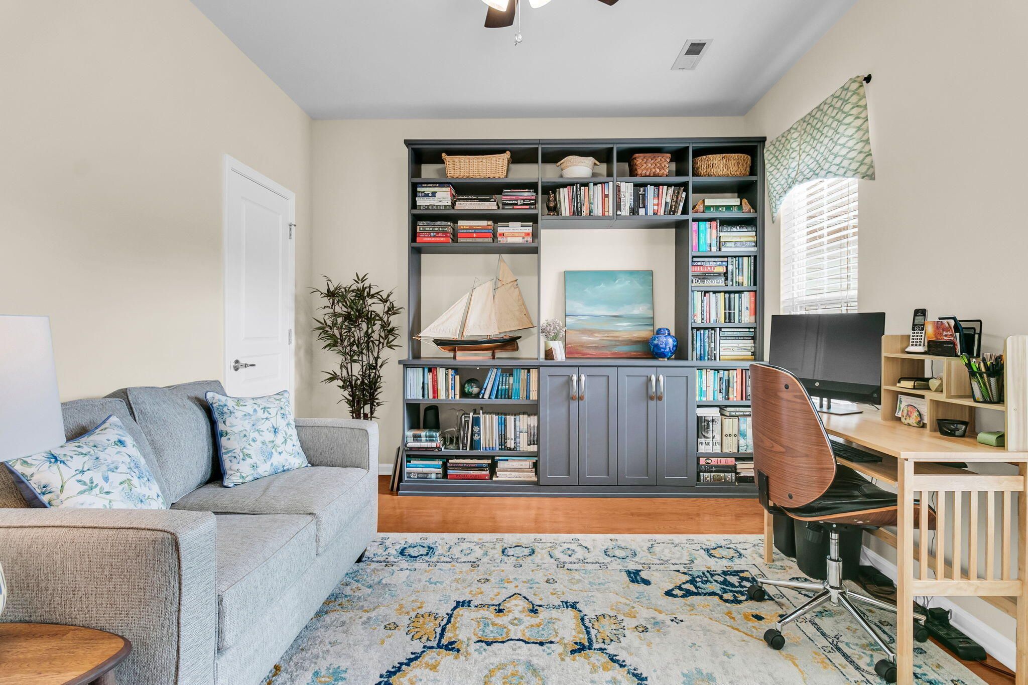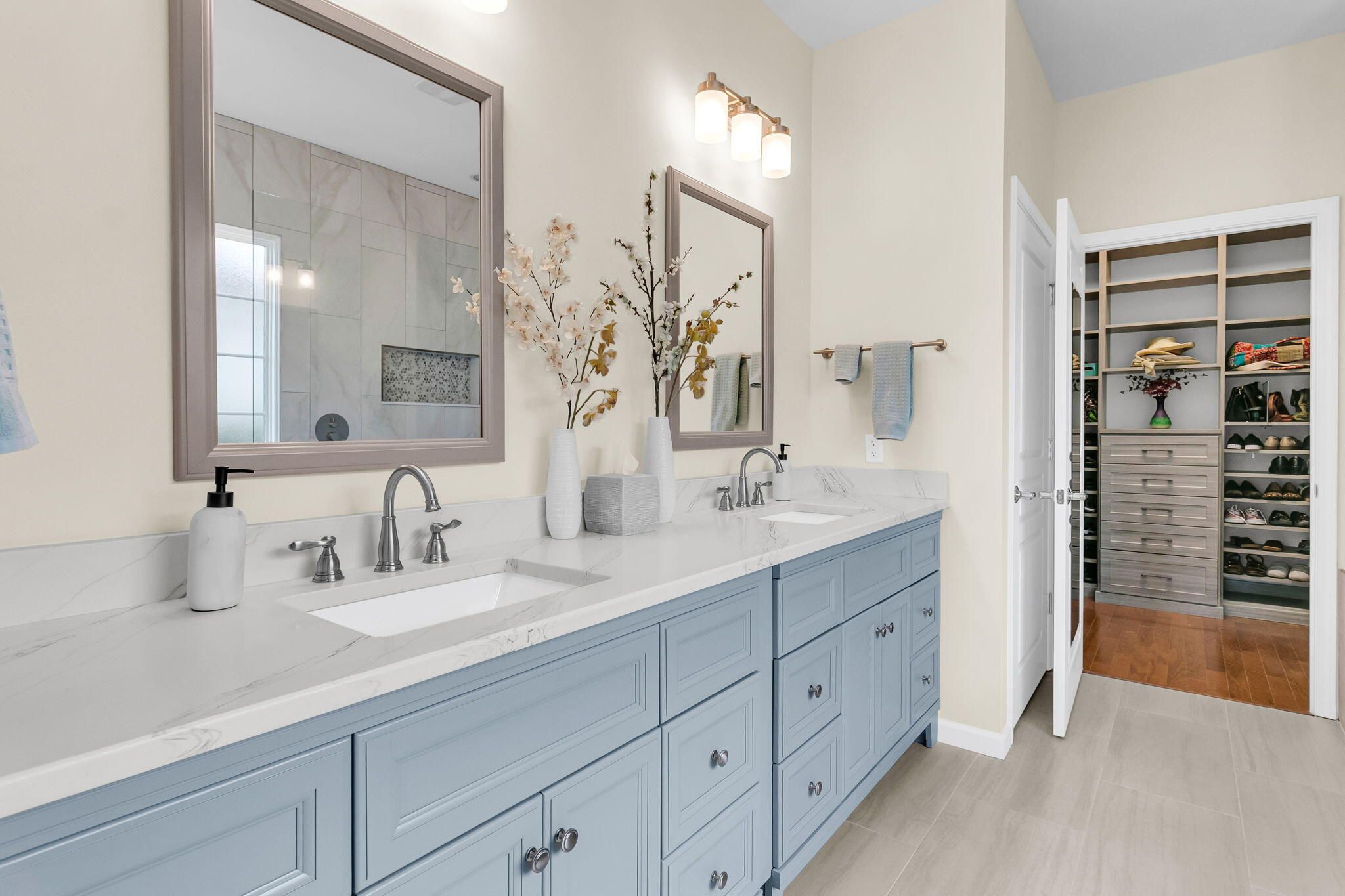 A true outdoor Oasis, this oversized homesite overlooking tons of green space with a landscaped berm on one side of the home and lagoon view, you'll find this beautiful Bluffton Cottage home in Charleston's Premier 55 plus community Del Webb Cane Bay! Featuring 3 bedrooms, 2 baths, sunroom, and large screened lanai with vinyl windows. This home is the perfect combination of renovated interior finishes and incredible location. The welcoming elongated front porch with stone pavers is the perfect place to enjoy a morning cup of coffee. As you walk inside, you're greeted by hardwood floors extending from the foyer into the dining room, great room, sunroom, bedrooms and hallways. The dining room is highlighted with a tray ceiling and wainscoting, creating an elegant dining space. A French....door office with custom built-in shelving to the right of the foyer is the perfect flex room that could be used as a third sleeping area for guests. The kitchen offers many upgrades, including granite countertops, subway tile backsplash, staggered painted Maple cabinets with crown molding, recessed can lighting, stainless steel built-in wall oven and microwave, 5 burner gas cooktop, and refrigerator. The kitchen overlooks a great room perfect for entertaining friends and family. At the back of the home is a light-filled sunroom leads to you onto the large screened-in lanai with lagoon view, vaulted ceiling, stone pavers and vinyl windows, making it a Four Seasons room to be enjoyed most of the year. From there, an exterior stone paver patio for outdoor enjoyment. The backyard setting is tranquil, the way this homesite is situation offers the owners plenty of privacy while also enjoying the beautiful landscaping surrounding the home and peaceful lagoon view. Back inside you'll find the Primary bedroom which includes a tray ceiling and beautifully renovated primary bathroom suite featuring double sink vanity, framed mirrors, walk-in tiled shower, and large walk-in closet with custom built-ins. The second bedroom is 11' x 18' and has an attached bathroom making it the perfect second primary bedroom or guest suite. The laundry room is outfitted with upper storage cabinets above the washer and dryer and floor to ceiling cabinets on the other side. From there, a two car garage with epoxy floor complete with additional storage cabinets and wall storage systems in place. New roof and outdoor condenser unit installed in 2023 and whole house generator included. Don't miss this incredible move-in ready home and active adult community with a full-time lifestyle director, over 100 chartered clubs and activity groups for an opportunity to meet new friends and enjoy the retired life you have always imagined. You will not be disappointed, please book your showing today!
