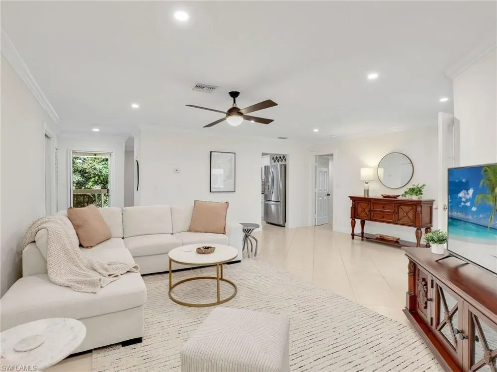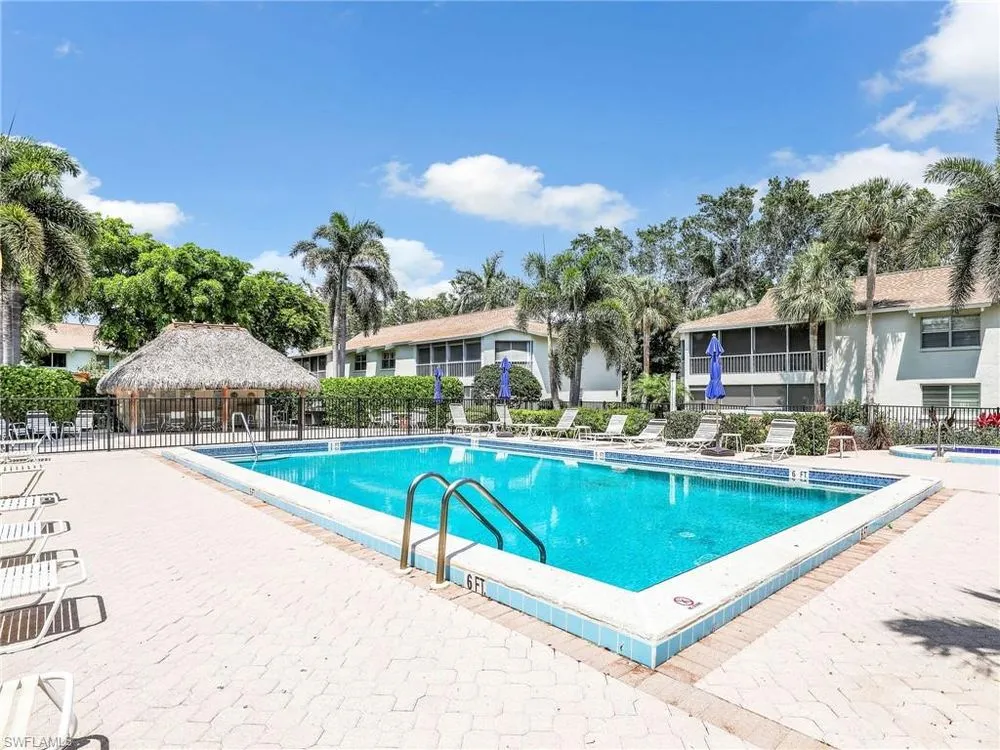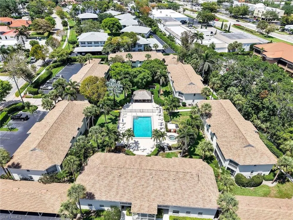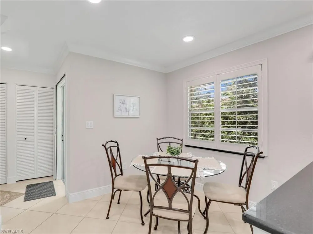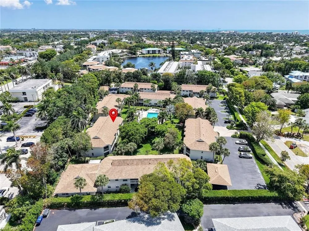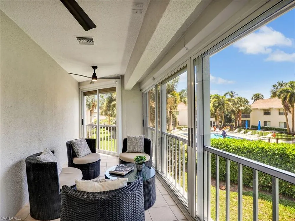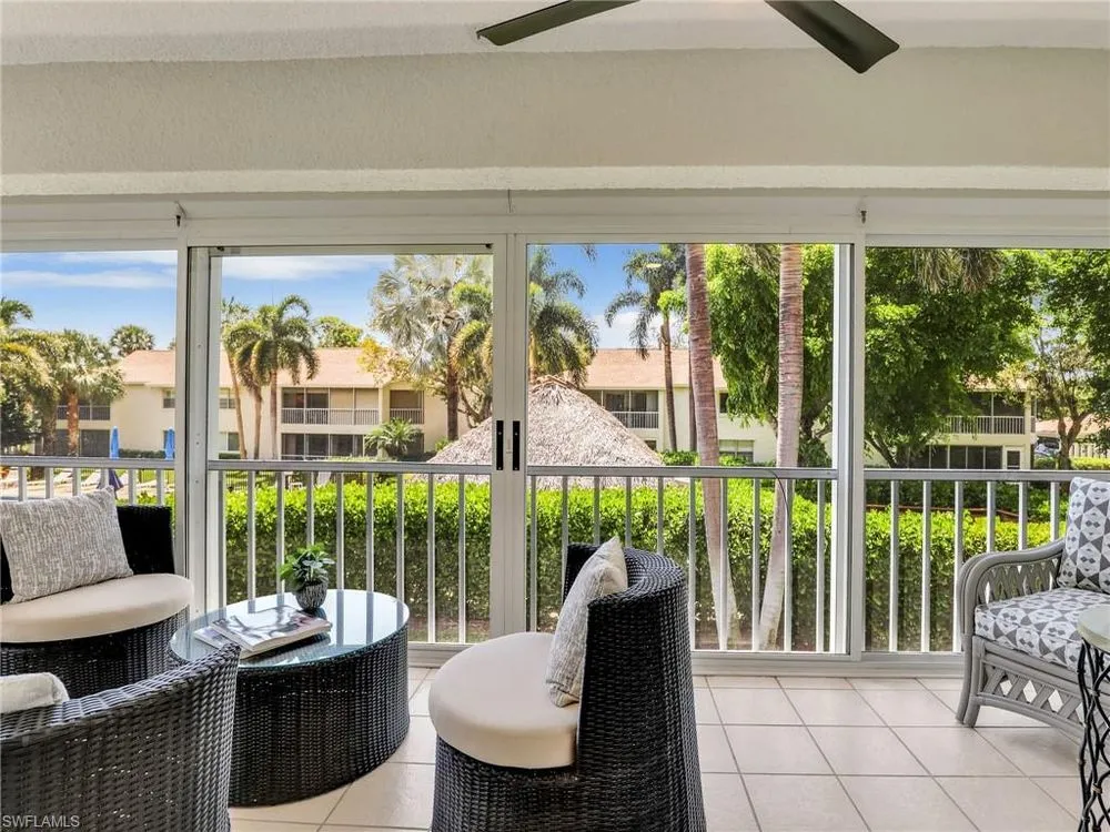 Located in the Navarra Club just minutes from Naples beaches and Fifth Avenue South, this fully furnished second-floor 2 bedroom, 2 bathroom condo is leased from October 1 through May 31, generating $30,100 in net seasonal income. Ideal for seasonal owners looking to offset costs or enjoy future rental income. The unit has been freshly painted and features tile flooring, crown molding, new recessed lighting, ceiling fans, and plantation shutters throughout. The kitchen includes granite countertops, classic white cabinetry, an eat-in area, and all new LG stainless appliances installed in May. Both bathrooms also feature granite and matching cabinetry. The primary suite includes two closets, one walk-in, and an en-suite bath with frameless walk-in shower. The guest room is adjacent to a full bath with tub/shower combo. The enclosed lanai adds usable year-round space with its own air vent. Water heater replaced in 2022. Community amenities include a pool, spa, grilling area, cabana, and private beach access with parking and bathrooms amenities for a small fee.