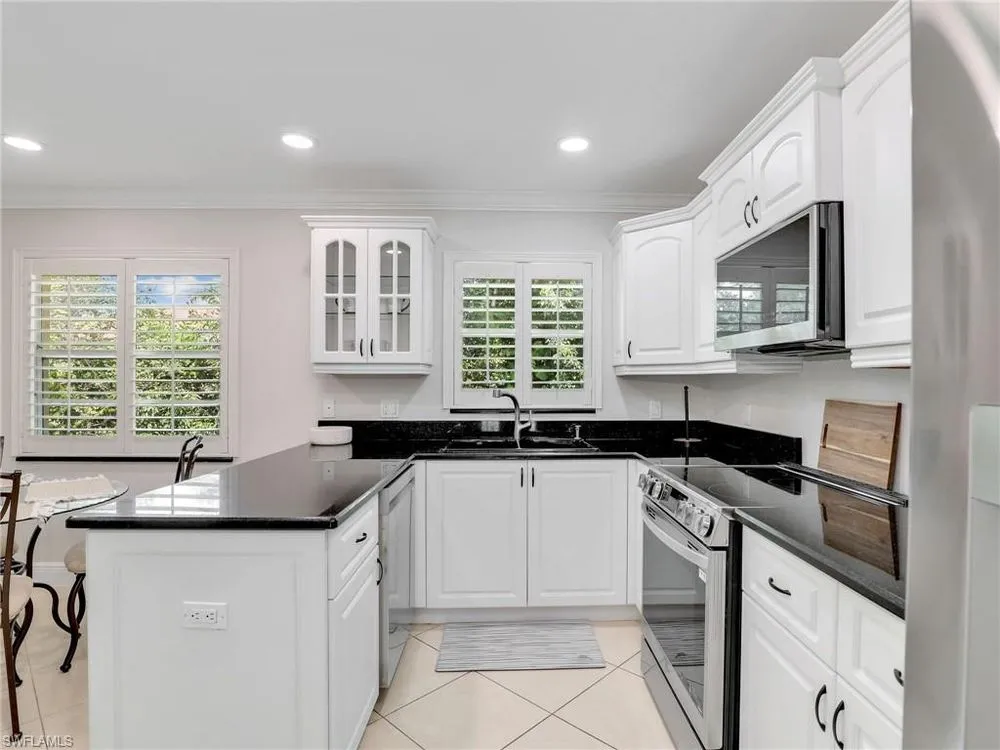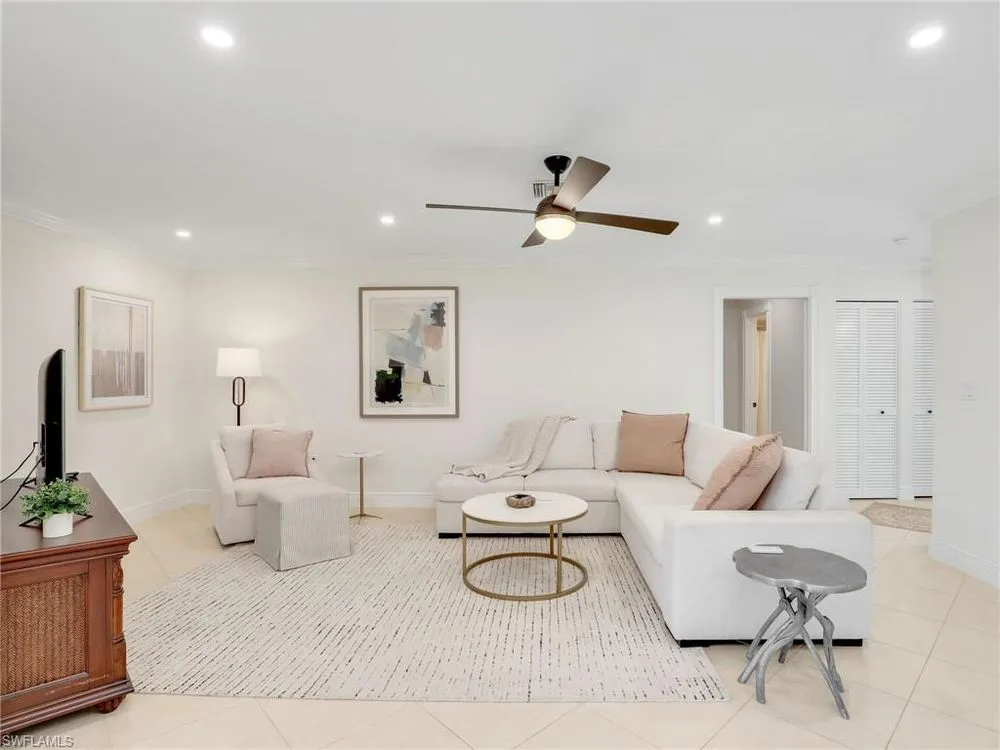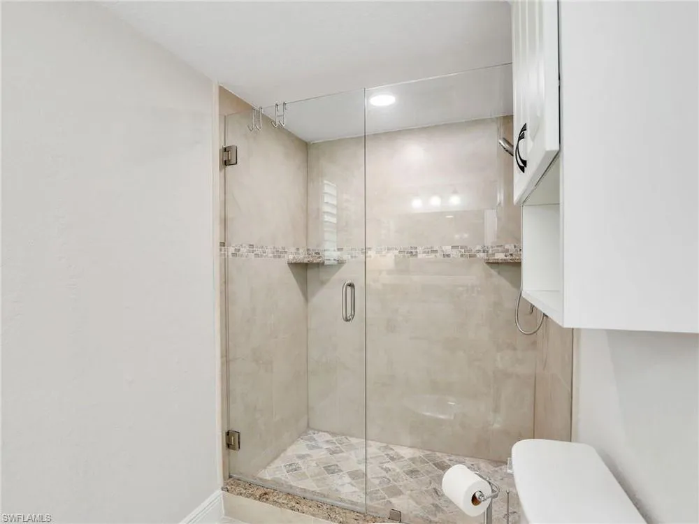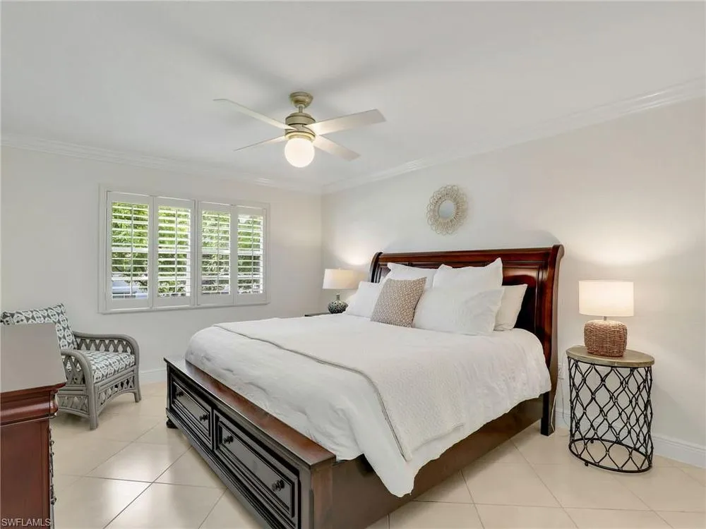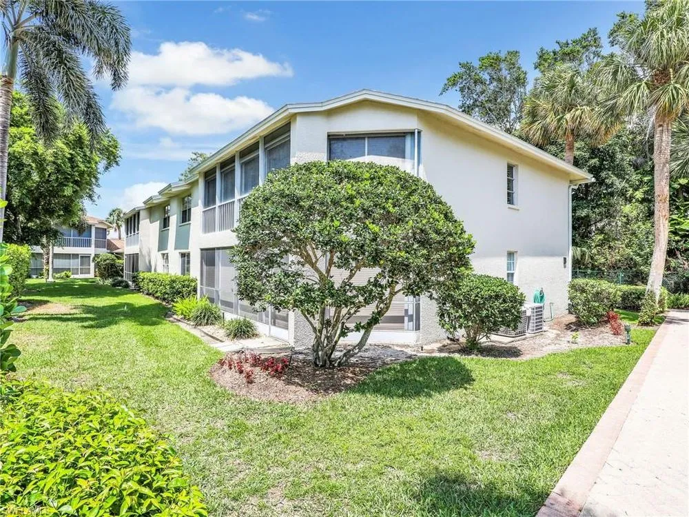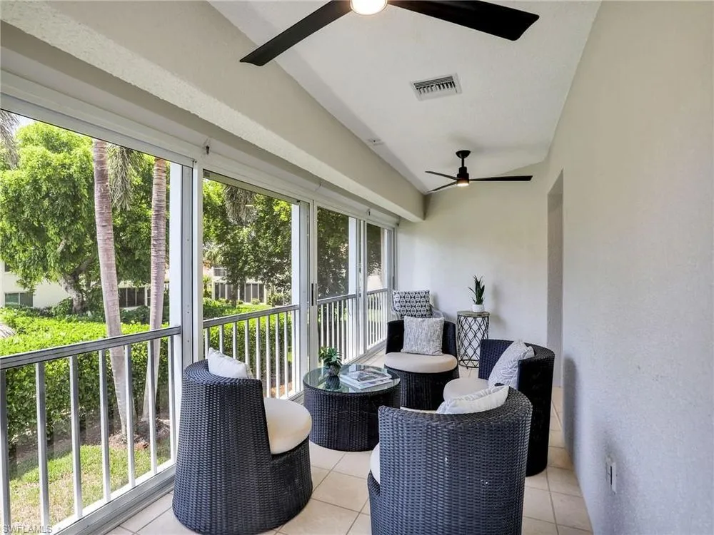 Located in the Navarra Club just minutes from Naples beaches and Fifth Avenue South, this fully furnished second-floor 2 bedroom, 2 bathroom condo is leased from October 1 through May 31, generating $30,100 in net seasonal income. Ideal for seasonal owners looking to offset costs or enjoy future rental income. The unit has been freshly painted and features tile flooring, crown molding, new recessed lighting, ceiling fans, and plantation shutters throughout. The kitchen includes granite countertops, classic white cabinetry, an eat-in area, and all new LG stainless appliances installed in May. Both bathrooms also feature granite and matching cabinetry. The primary suite includes two closets, one walk-in, and an en-suite bath with frameless walk-in shower. The guest room is adjacent to a full bath with tub/shower combo. The enclosed lanai adds usable year-round space with its own air vent. Water heater replaced in 2022. Community amenities include a pool, spa, grilling area, cabana, and private beach access with parking and bathrooms amenities for a small fee.