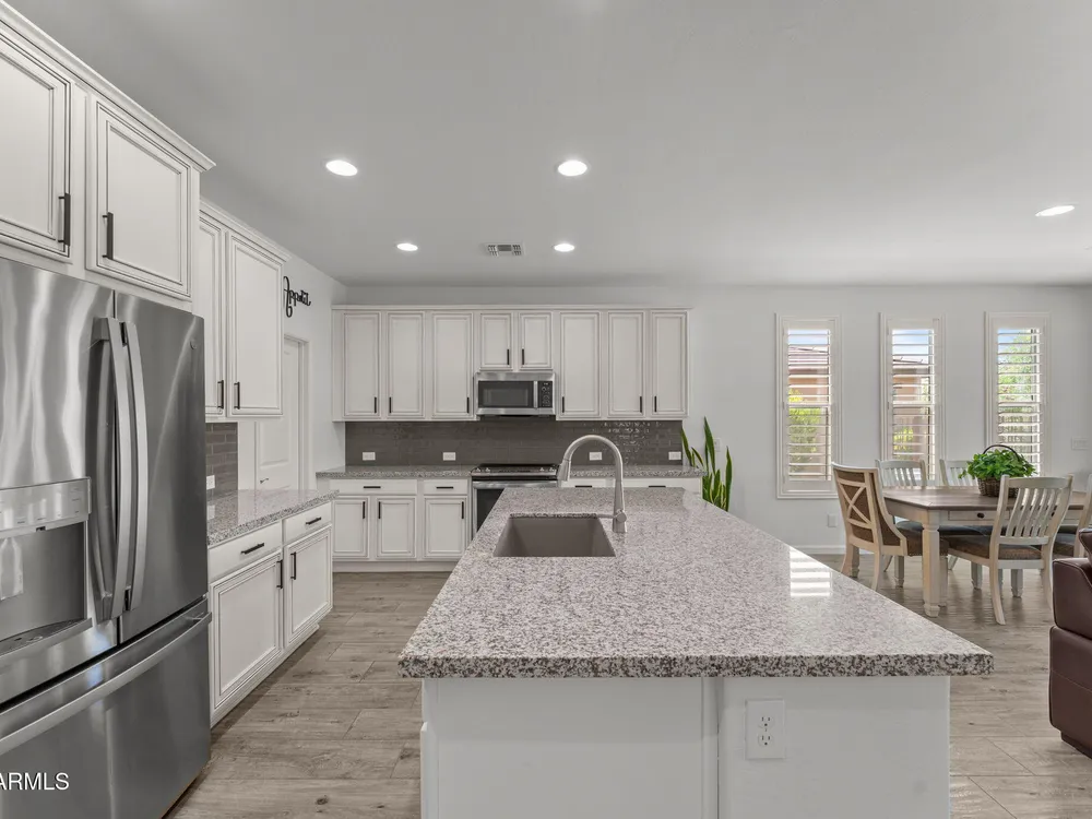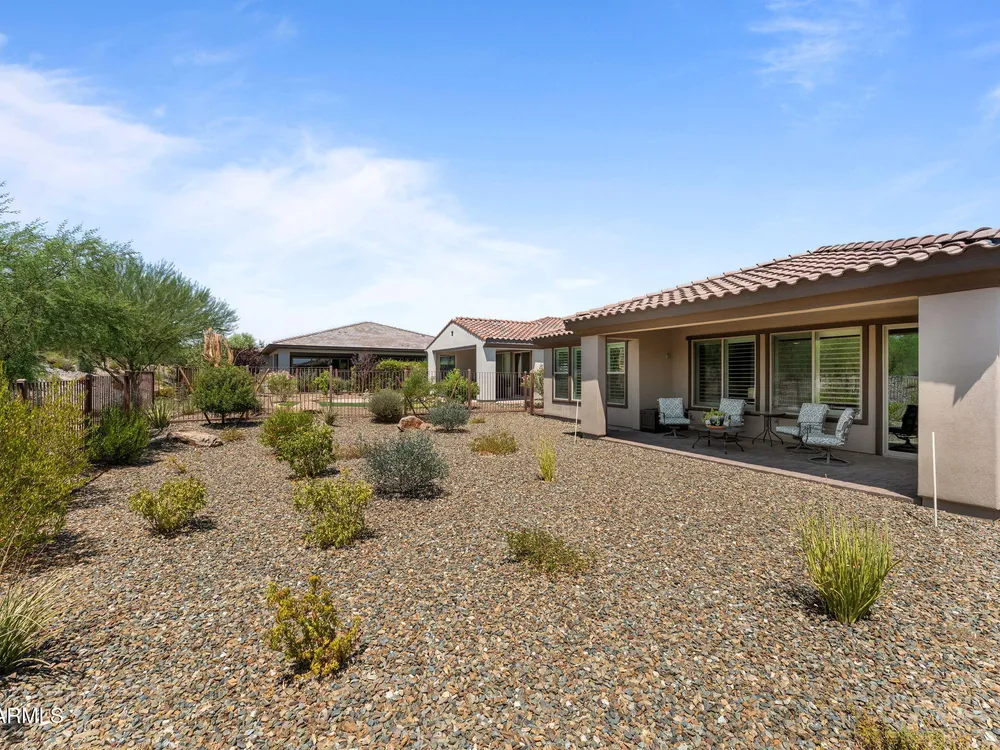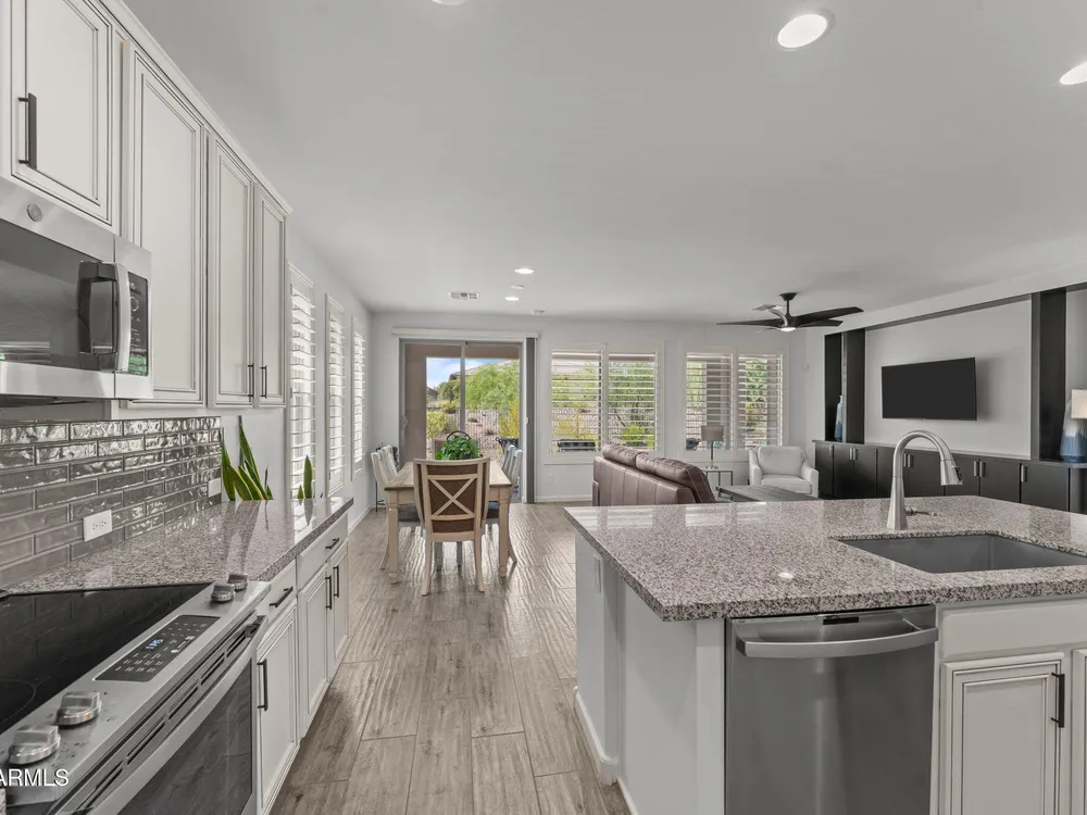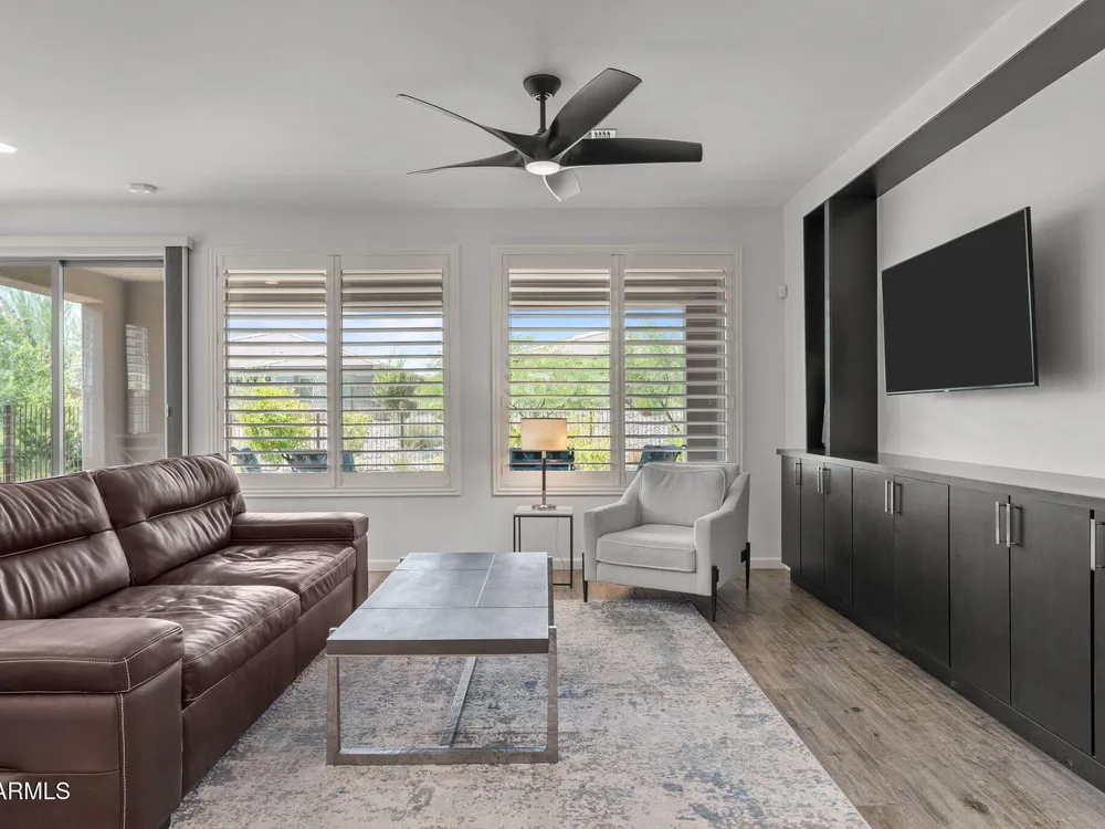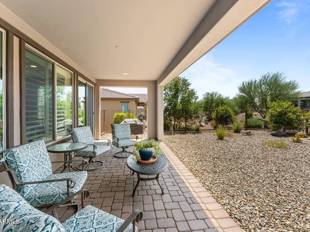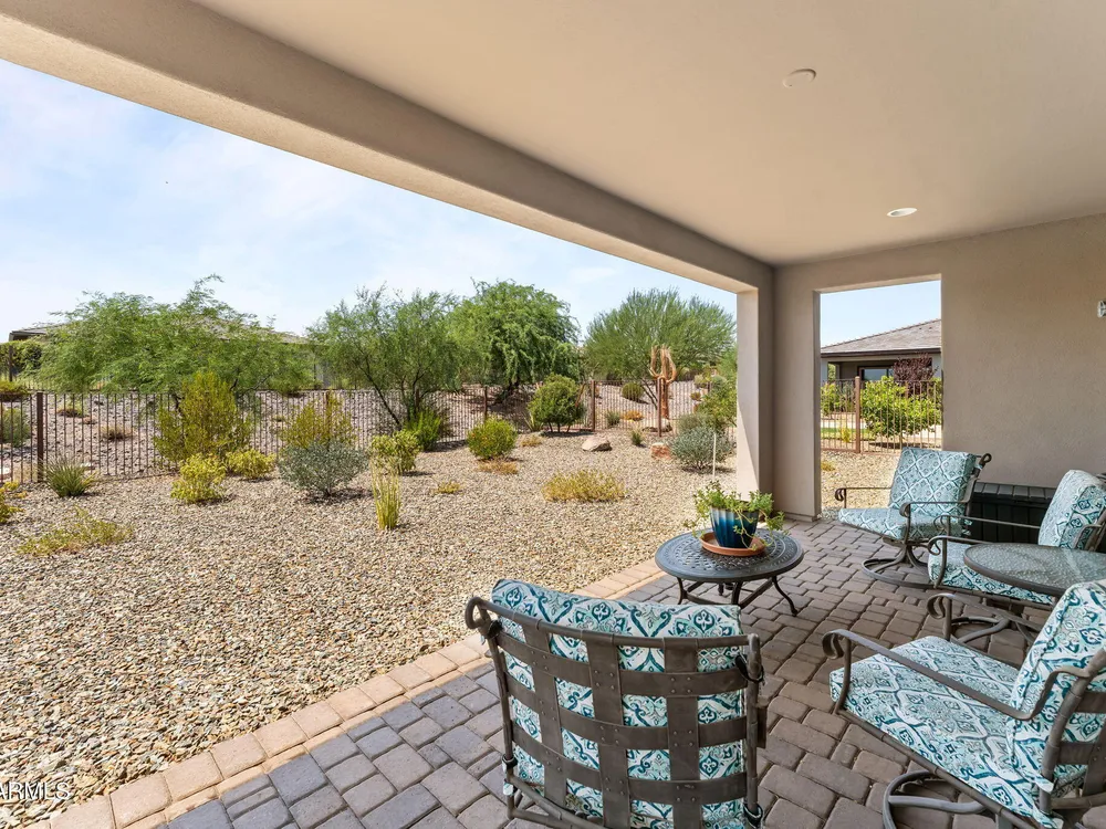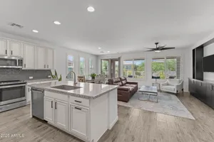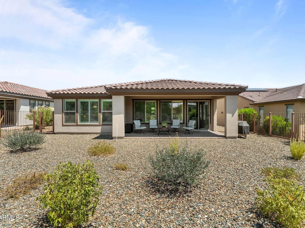 Welcome to this beautifully designed 2-bedroom, 2-bathroom home offering a perfect blend of style, comfort, and functionality. Step inside and experience the open floor plan that creates a seamless flow between the living, dining, and kitchen areas—ideal for both everyday living and entertaining guests. The gourmet kitchen is a true centerpiece, featuring stainless steel appliances, a spacious center island with seating, and a stunning walk-in pantry that includes a convenient built-in desk—perfect for organizing or working from home. Light, modern finishes enhance the bright and airy feel of the home, while large windows fill every room with natural light. In the great room, you'll find a custom built-in entertainment center that adds both style and practicality. The primary suite provides a peaceful retreat, complemented by a well-appointed en-suite bathroom and generous closet space. Step outside to a fully fenced backyard designed for easy living, showcasing low-maintenance desert landscaping and a covered patioperfect for relaxing with your morning coffee or hosting evening gatherings. A thoughtful layout, stylish details, and inviting outdoor spaces make this home a wonderful place to enjoy everyday life.