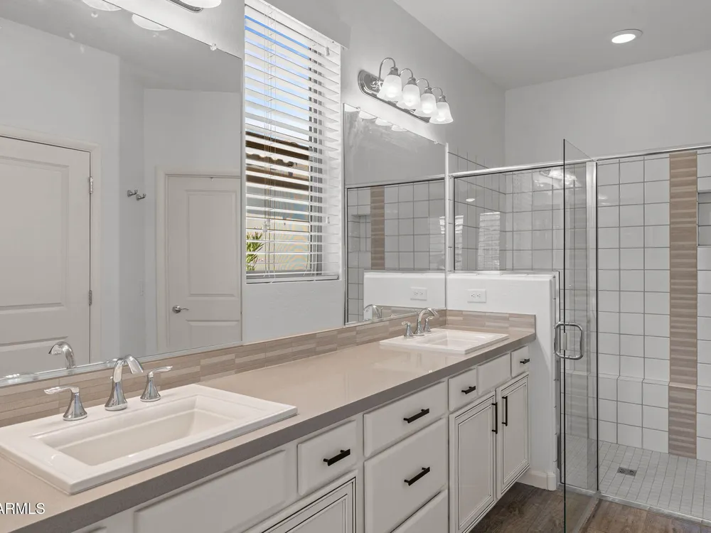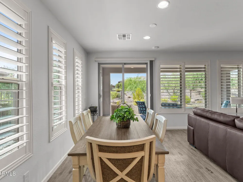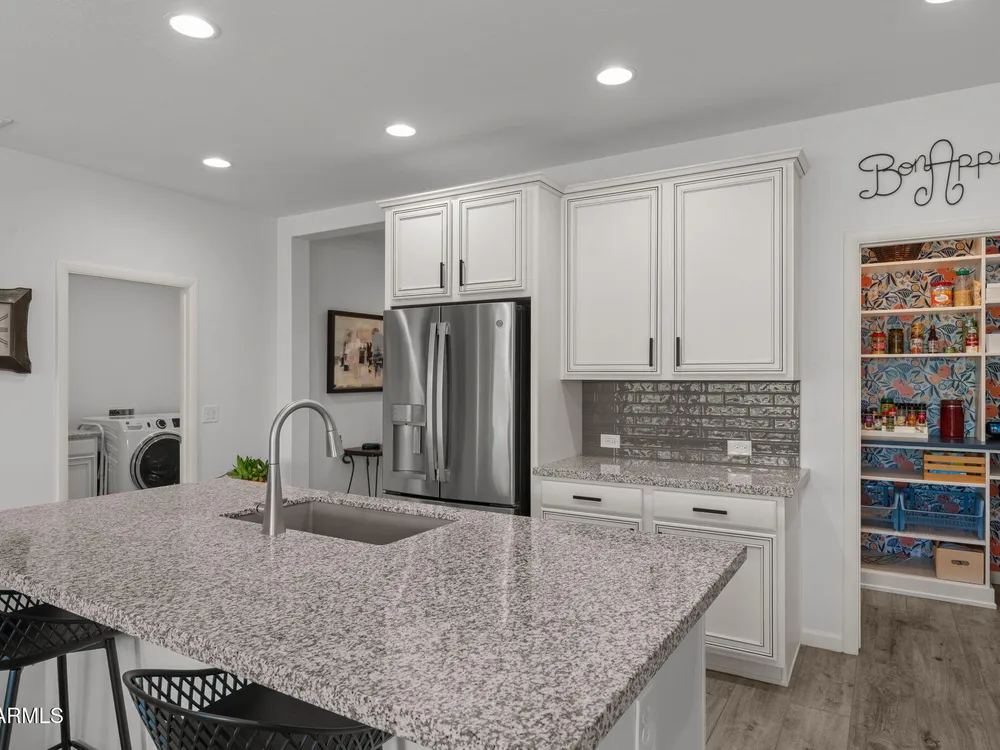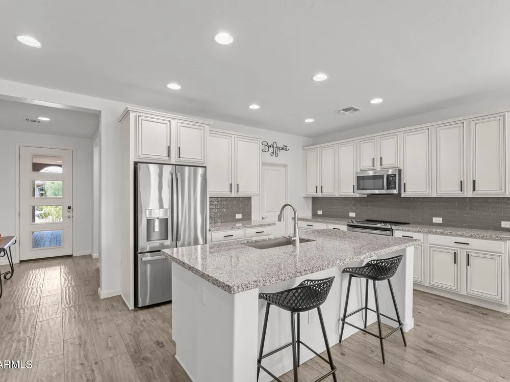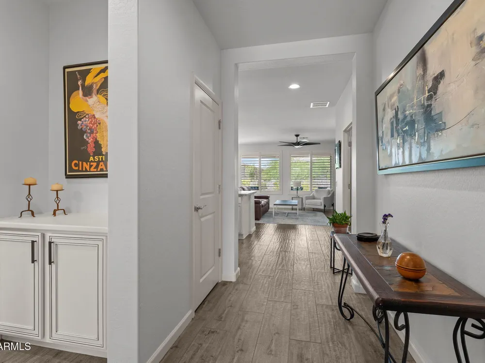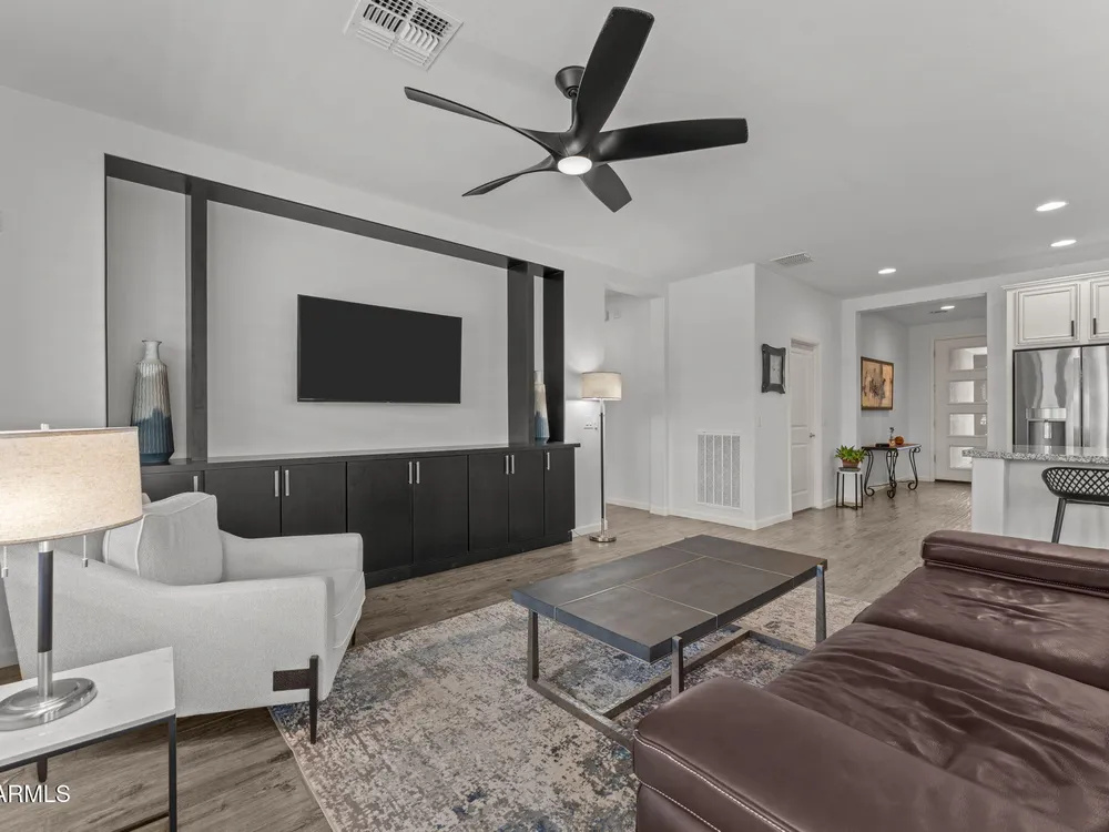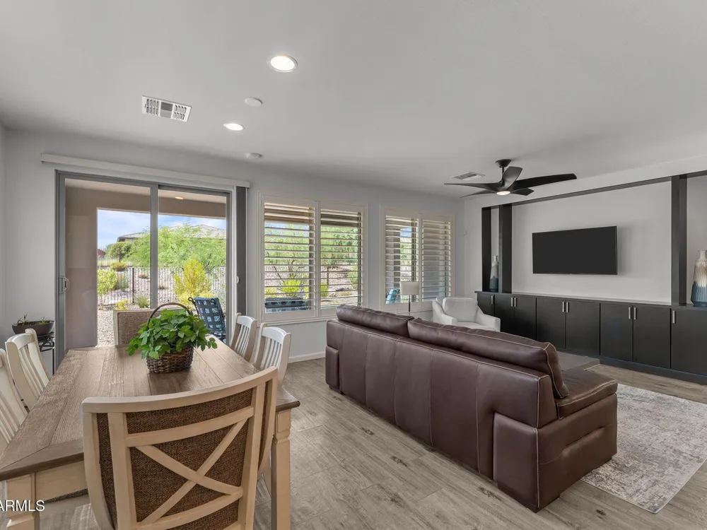 Welcome to this beautifully designed 2-bedroom, 2-bathroom home offering a perfect blend of style, comfort, and functionality. Step inside and experience the open floor plan that creates a seamless flow between the living, dining, and kitchen areas—ideal for both everyday living and entertaining guests. The gourmet kitchen is a true centerpiece, featuring stainless steel appliances, a spacious center island with seating, and a stunning walk-in pantry that includes a convenient built-in desk—perfect for organizing or working from home. Light, modern finishes enhance the bright and airy feel of the home, while large windows fill every room with natural light. In the great room, you'll find a custom built-in entertainment center that adds both style and practicality. The primary suite provides a peaceful retreat, complemented by a well-appointed en-suite bathroom and generous closet space. Step outside to a fully fenced backyard designed for easy living, showcasing low-maintenance desert landscaping and a covered patioperfect for relaxing with your morning coffee or hosting evening gatherings. A thoughtful layout, stylish details, and inviting outdoor spaces make this home a wonderful place to enjoy everyday life.