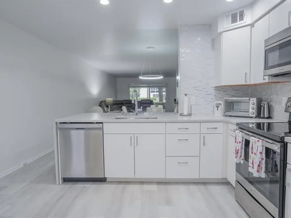 Step into this beautifully renovated, move-in ready first floor condo with stunning golf course views. This modern 2 bedroom, 2 bath residence features an open layout with a beautifully redesigned kitchen with sleek cabinetry, newer appliances, and premium finishes. The spacious living areas feature new flooring, entertainment wall paneling, and smooth ceilings with no popcorn for a fresh, clean feel. Enjoy peaceful mornings or sunsets from the screened patio overlooking the greens. Unit perfectly located just steps from the pool, laundry, mailbox, and parking. Wynmoor is a beautifully maintained 55+ community offering resort style amenities including golf, pickleball, theater, fitness center, and café for plenty of opportunities to stay active and connected.
