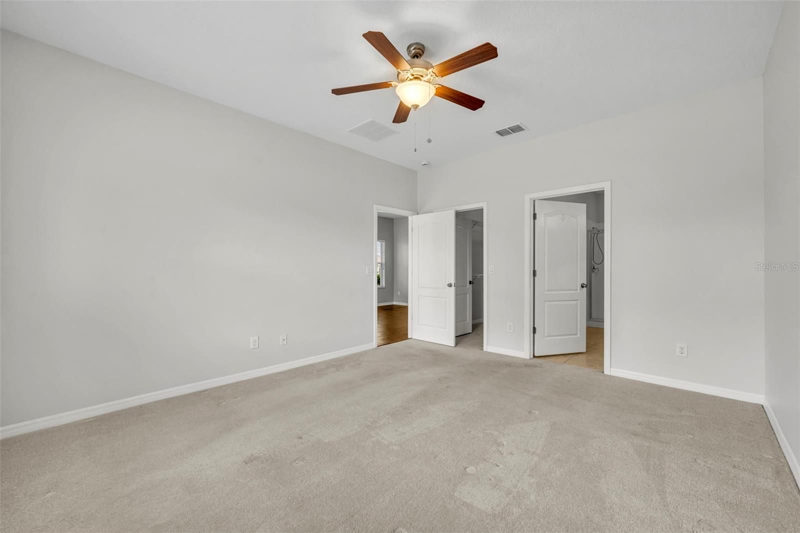 - Ceiling Fan(s), Other, Main Level Primary, Solid Surface Counters, Split Bedrooms, Stone Counters, Thermostat, Walk-In Closet(s)