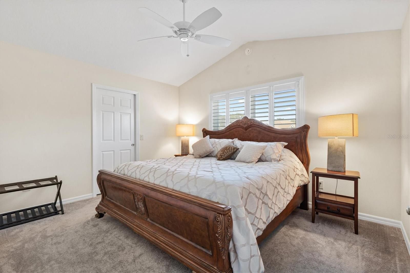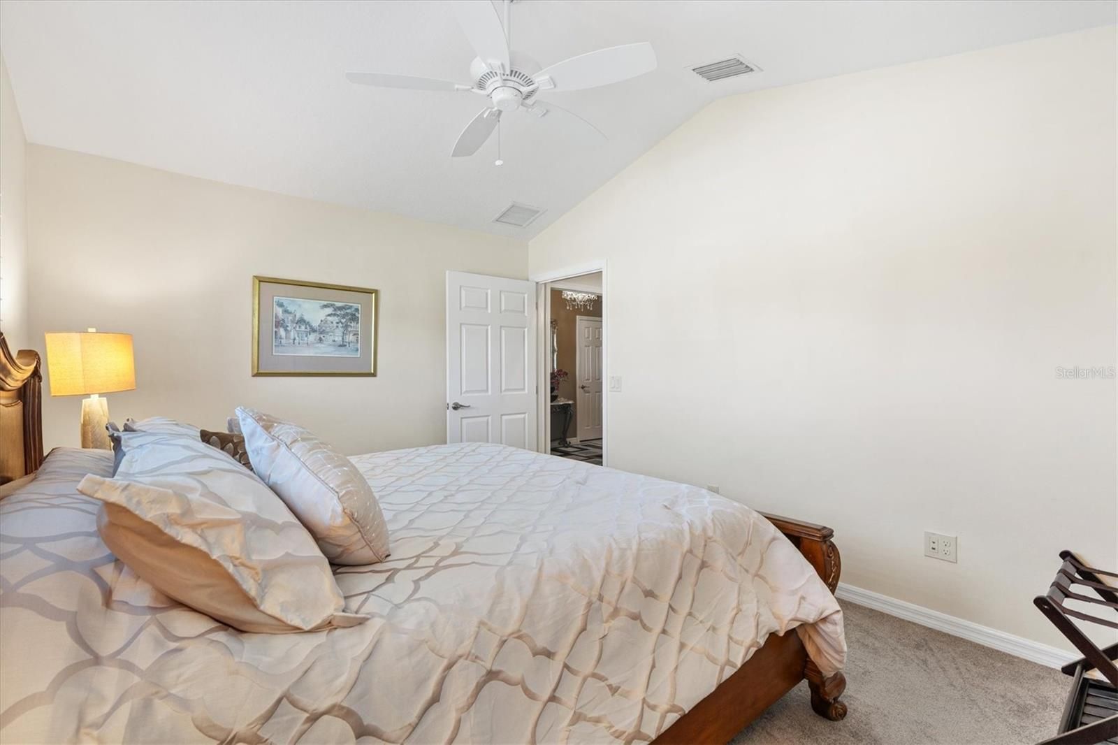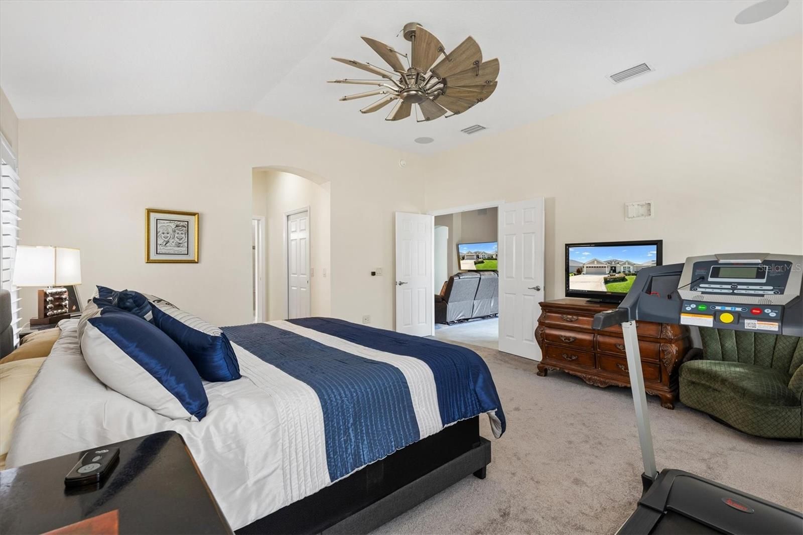 - Ceiling Fan(s), Eat-in Kitchen, High Ceilings, Kitchen/Family Room Combo, Living/Dining Room, Open Floorplan, Main Level Primary, Solid Surface Counters, Split Bedrooms, Stone Counters, Thermostat, Tray Ceiling(s), Vaulted Ceiling(s), Walk-In Closet(s)