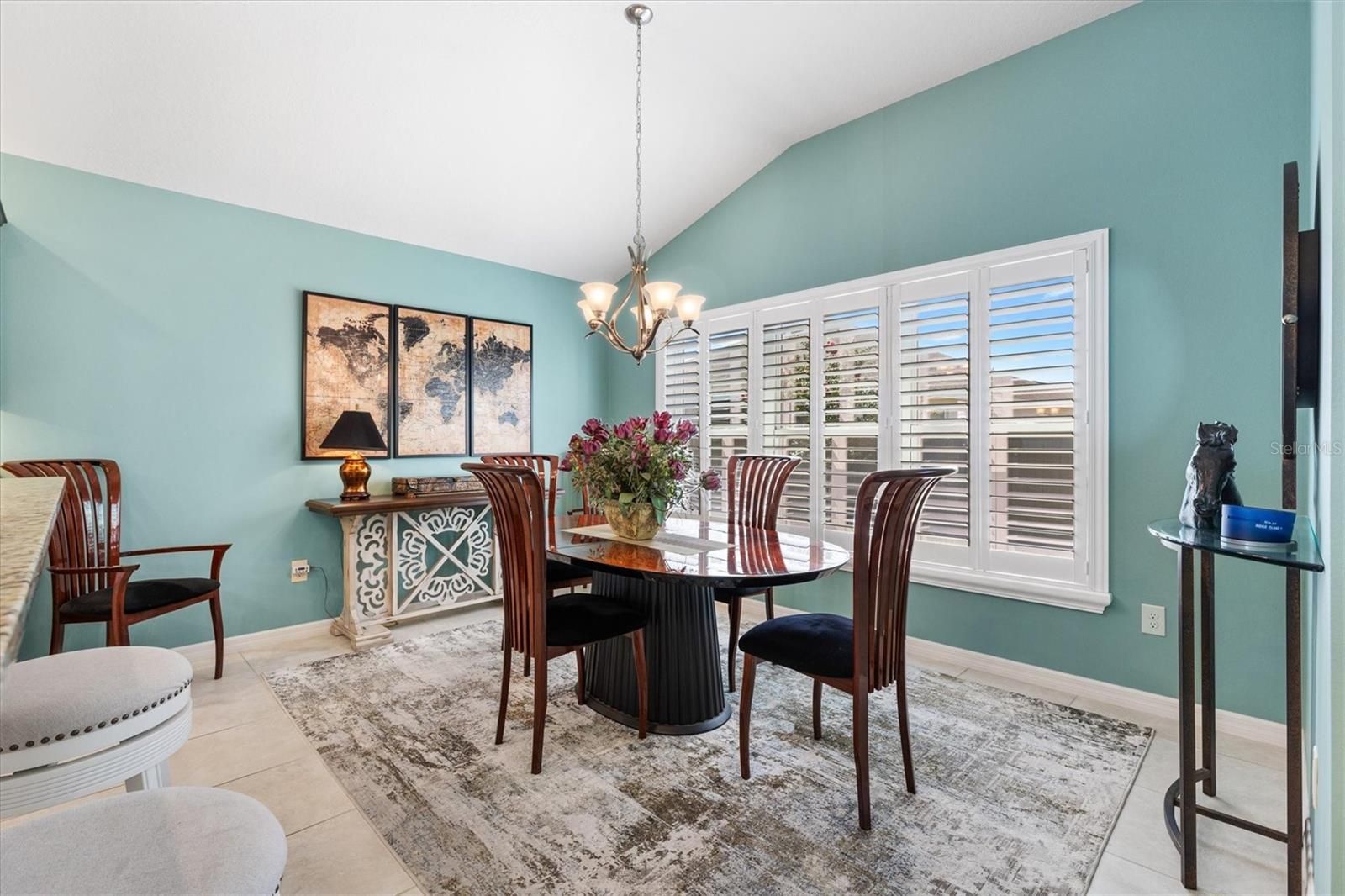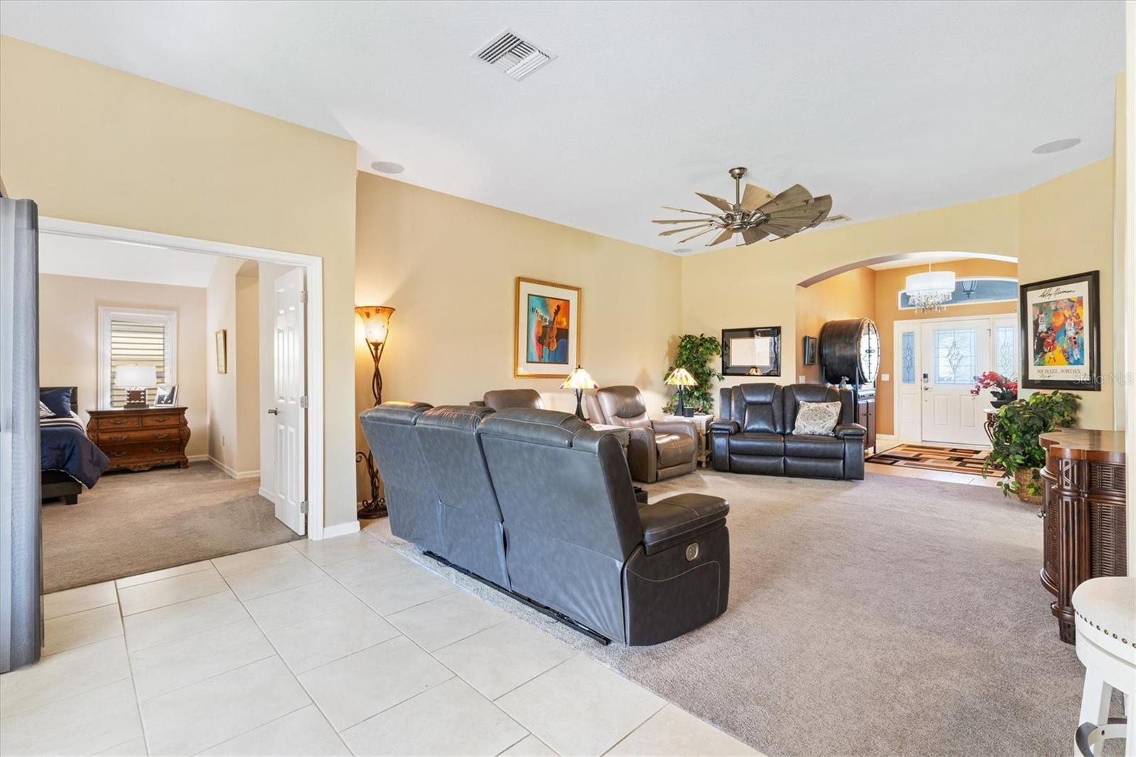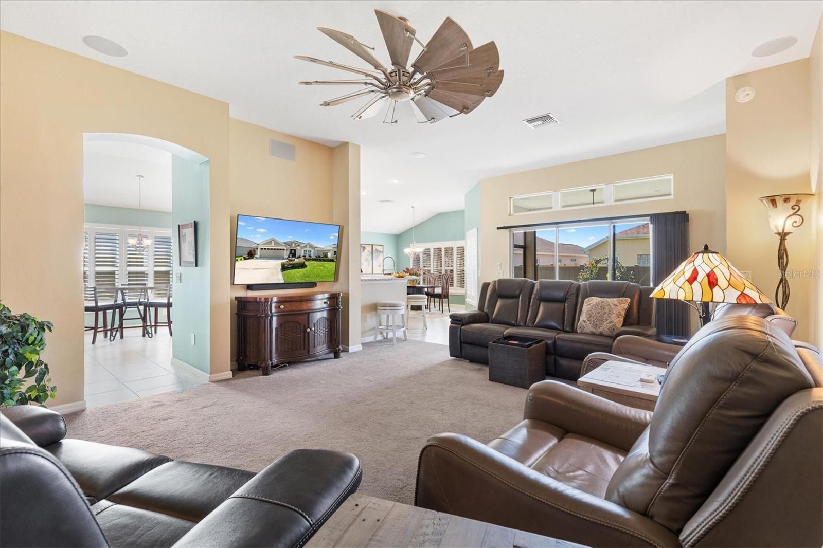 - Ceiling Fan(s), Eat-in Kitchen, High Ceilings, Kitchen/Family Room Combo, Living/Dining Room, Open Floorplan, Main Level Primary, Solid Surface Counters, Split Bedrooms, Stone Counters, Thermostat, Tray Ceiling(s), Vaulted Ceiling(s), Walk-In Closet(s)
