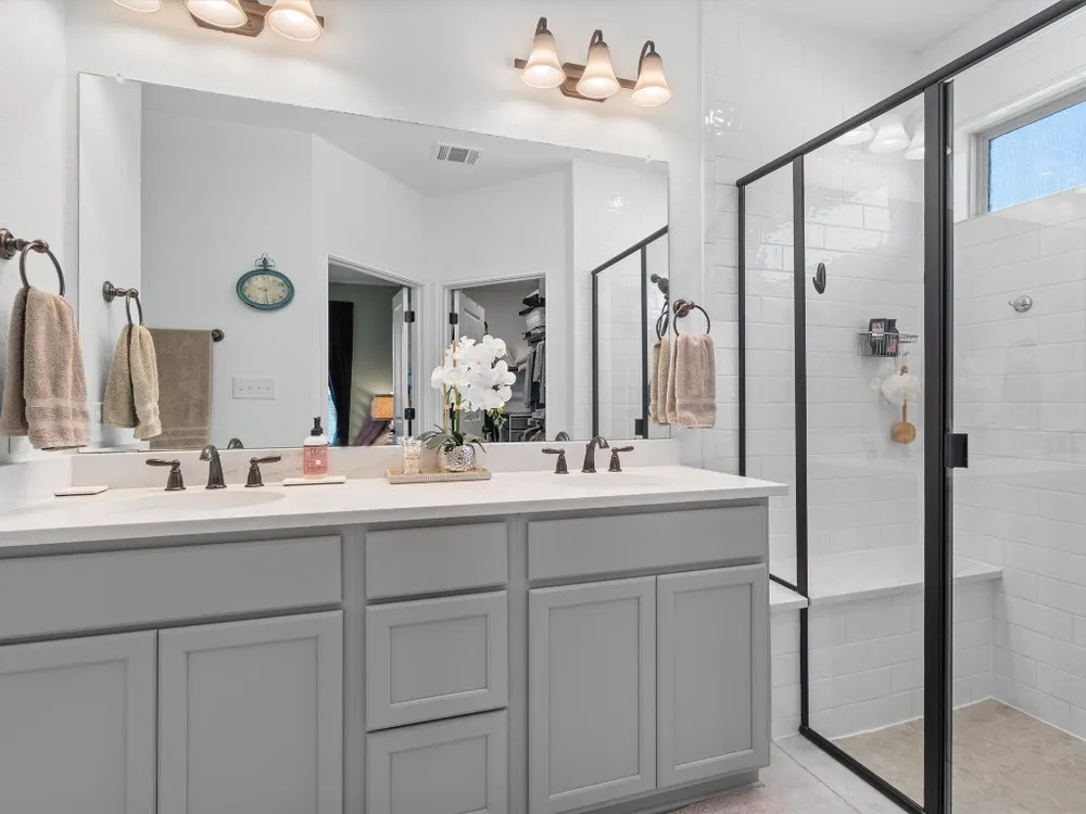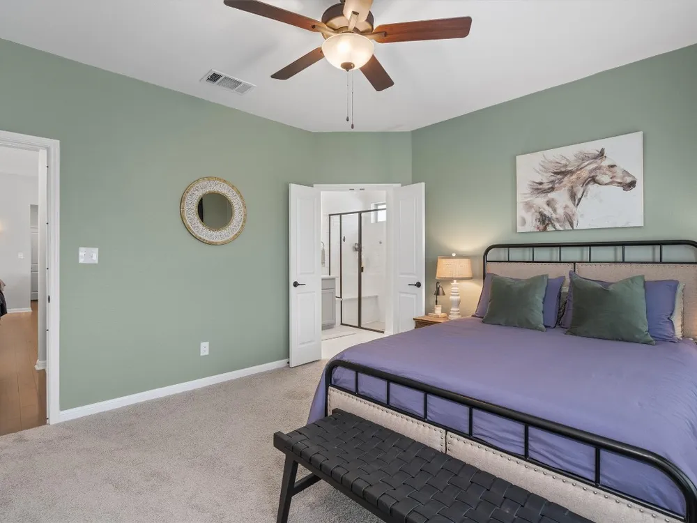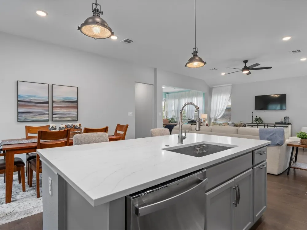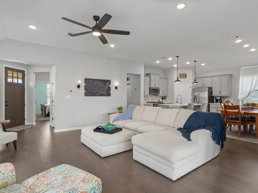 - Breakfast Bar, Ceiling Fan(s), Double Vanity, Entrance Foyer, Kitchen Island, Multiple Living Areas, Main Level Primary, NoInteriorSteps, Open Floorplan, Pantry, Quartz Countertops, Recessed Lighting, Walk-In Closet(s)