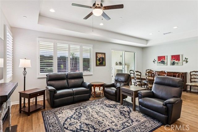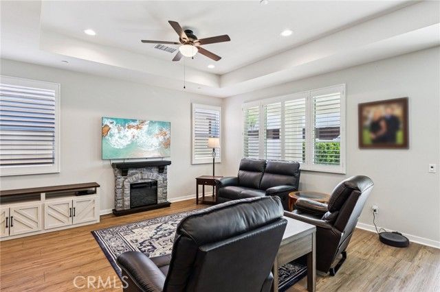 ESPLANADE 55+, LUXURY, OWNED SOLAR, PRIVATE, GATED COMMUNITY, TURNKEY, UPGRADED. Experience elevated 55+ living in this beautifully upgraded Arise Plan 2, combining modern design, energy efficiency, and resort-style comfort. The home offers 3 bedrooms, 2.5 baths, and an open-concept layout with sound-proof Pecan luxury vinyl plank flooring and plantation shutters throughout. The chef’s kitchen showcases a large quartz island, premium stainless appliances, and abundant storage - ideal for entertaining or casual gatherings that flow seamlessly into the great room and outdoor spaces.The primary suite delivers a tranquil retreat with an oversized walk-in shower, dual vanities, and an expansive walk-in closet. Through the sliding glass doors, step into a stunning backyard oasis with a California room, built-in gas fireplace, recessed lighting, and low-maintenance, pet-resistant turf. The outdoor space is enhanced by a custom retaining wall, terraced landscaping, mature hedges, a sun deck, and custom pavers wrapping both sides of the home - creating a truly serene and private retreat. A storage shed adds functionality without sacrificing style. Residents of Esplanade Sommers Bend enjoy exclusive resort amenities including a pool and spa, pickleball and bocce courts, outdoor kitchen and BBQ areas, fire pit, gardens, and a private clubhouse with fitness center, billiards, and indoor lounges with kitchen facilities - all just minutes from Temecula Wine Country and local shopping.