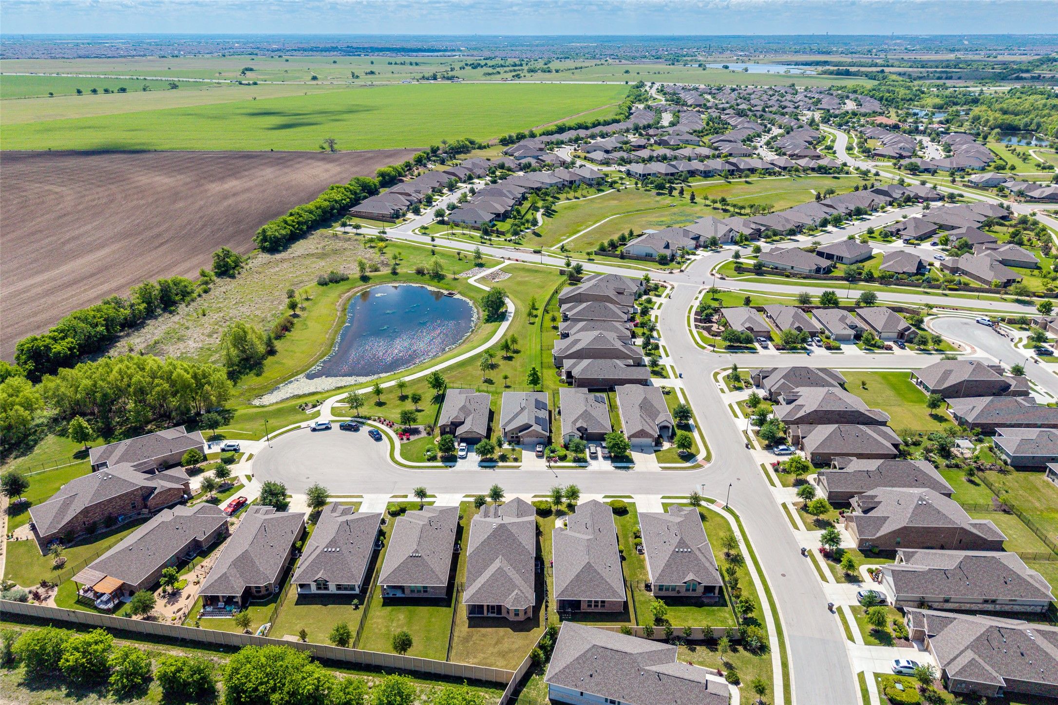 Welcome to one of the best-positioned homes in Heritage at Vizcaya, Round Rock’s premier 55+ community. This beautifully maintained 2-bedroom, 2-bath home with a dedicated office/study features the highly sought-after Sablewood floor plan by Taylor Morrison and is truly move-in ready. Tucked away on a quiet cul-de-sac street, this home stands out with peaceful, open views of the pond and surrounding green space right from the front—an increasingly rare find. Inside, the smart, efficient layout lives larger than expected. The kitchen is built for both everyday living and entertaining, offering generous counter space, a large center island, and abundant storage. It opens seamlessly into the main living area, creating a comfortable, connected feel throughout the home. The primary suite is a true retreat, featuring a walk-in shower, dual vanities, and a spacious closet designed for convenience and ease. Step outside to your private backyard and enjoy the oversized screened-in patio—perfect for relaxing mornings or evening gatherings without the hassle of bugs or harsh sun. Living in Heritage at Vizcaya means more than just owning a home. Residents enjoy a vibrant, active lifestyle with access to a state-of-the-art amenity center, fitness facilities, social events, and more. If you’ve been waiting for the right home in the right community, this one checks the boxes.