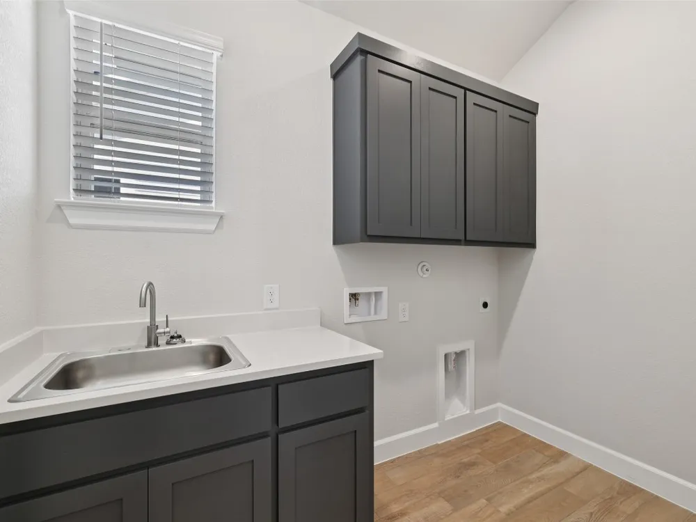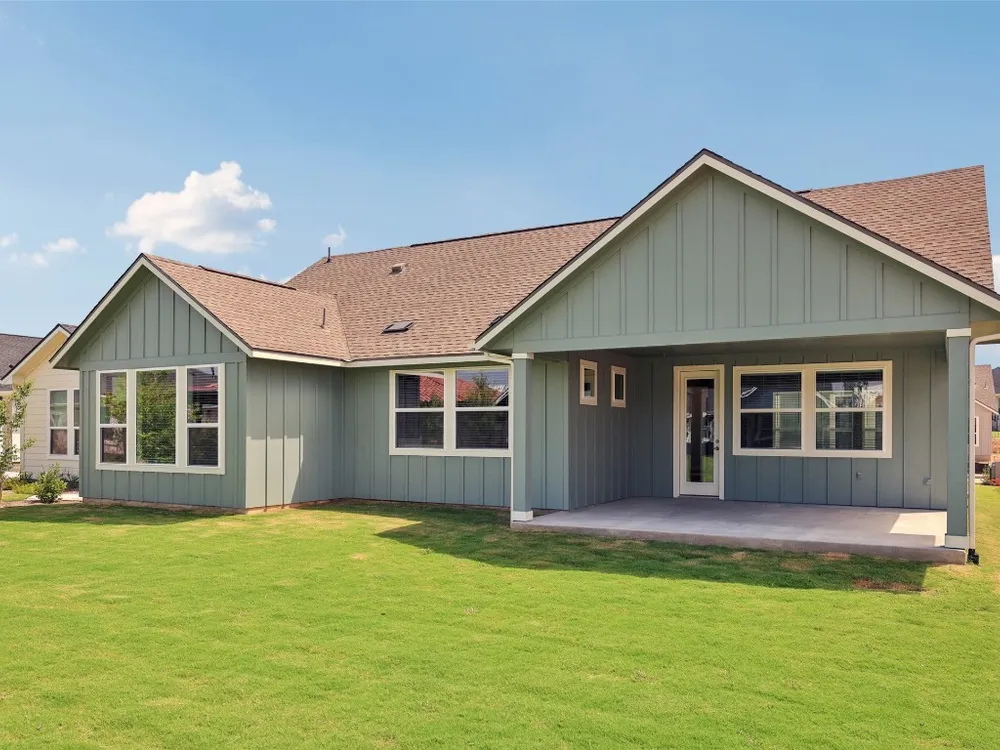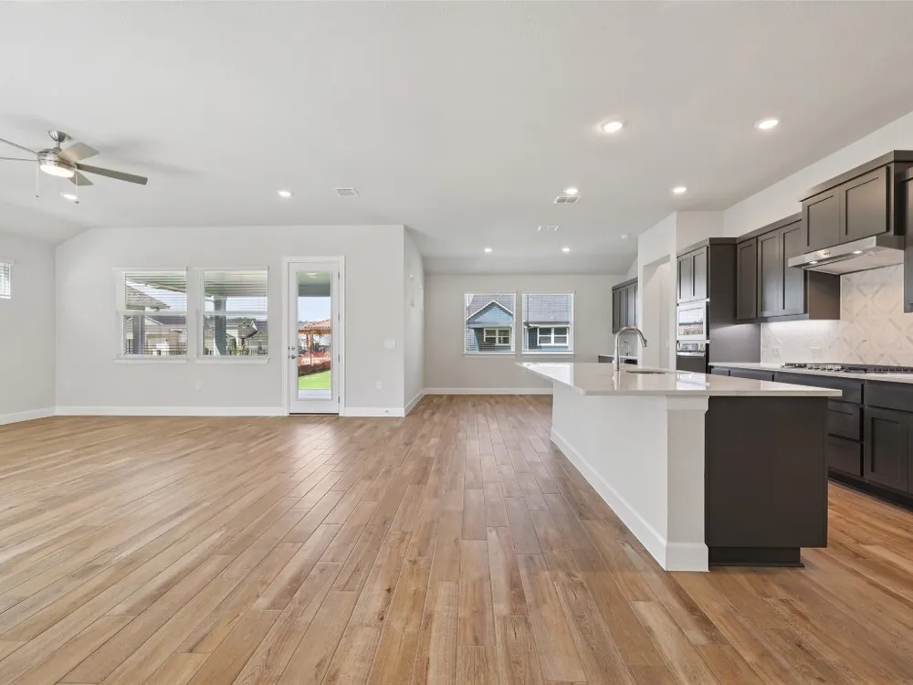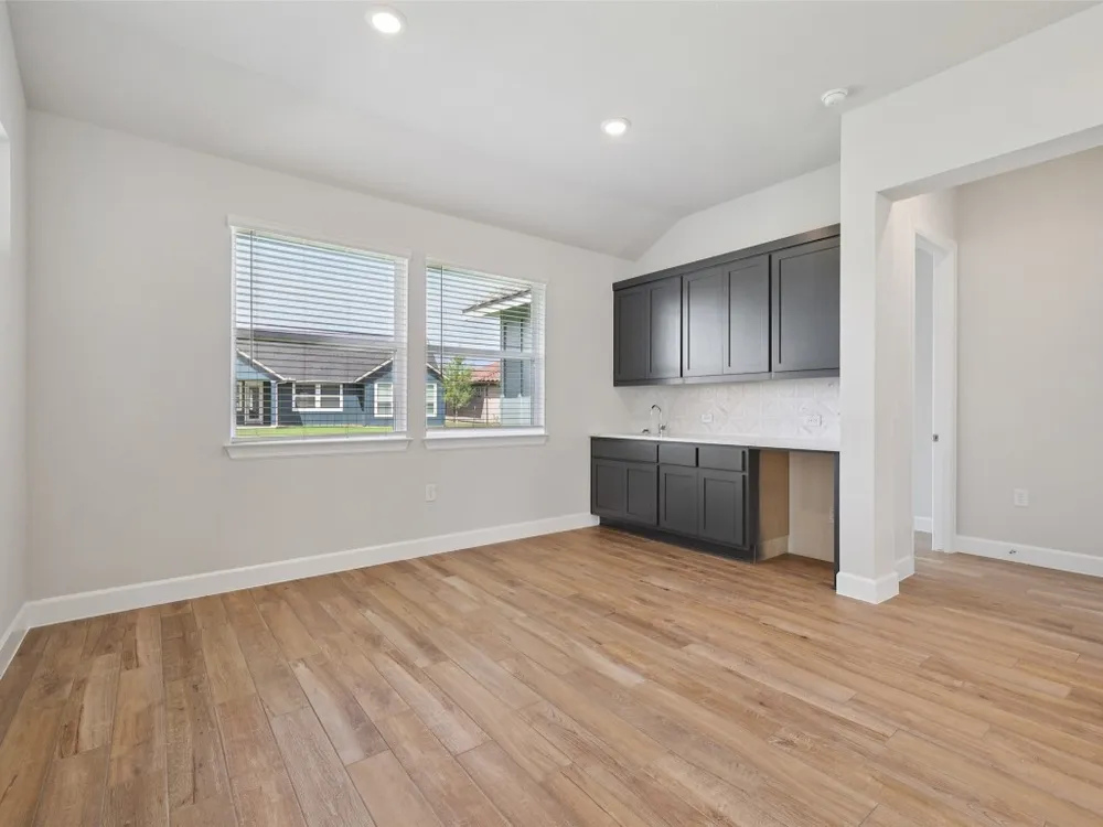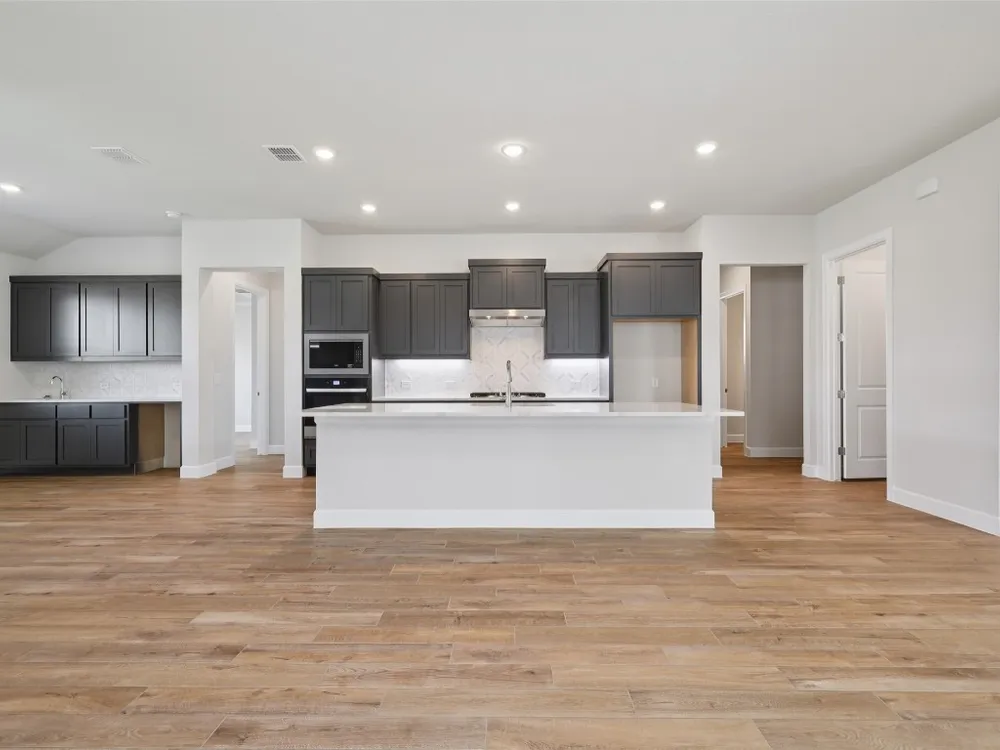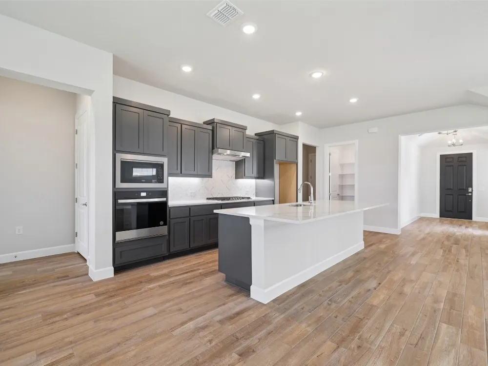 Trinity plan with upgraded kitchen, quartz countertops, optional cabinets in utility room with sink, optional wet bar, tray ceilings in master, optional study, garage interior mounted tankless water heater, enlarged covered patio