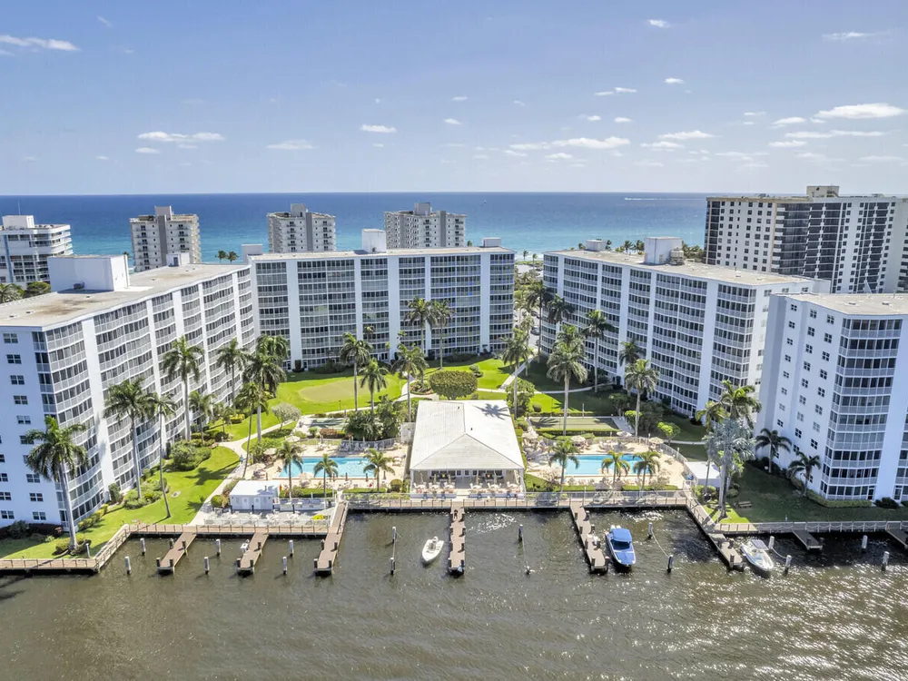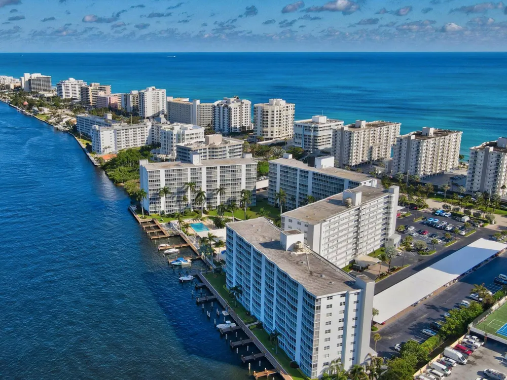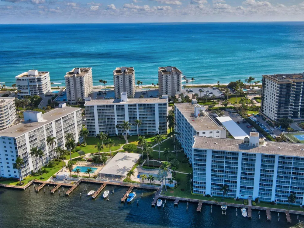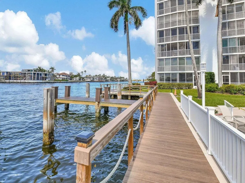 Highly sought after Seagate, 55+ community. Your beachside resort. Corner ICW & Ocean Views, Stunning sunsets & sunrises from the large enclosed balcony. Walk to restaurants & beach across the street. COVERED parking, updated kitchen & baths. Deeded beach access across the street. Marina, bocce ball, putting green, 2 pools, remodeled clubhouse, fitness room, billiards, grilling area, shuffleboard, docks, on site property management. Building & Complex has new: Dockage, Roof, Cooling Towers, Generator, Elevators, Pools Resurfaced, Concrete & Structural Study Completed, All assessments paid.