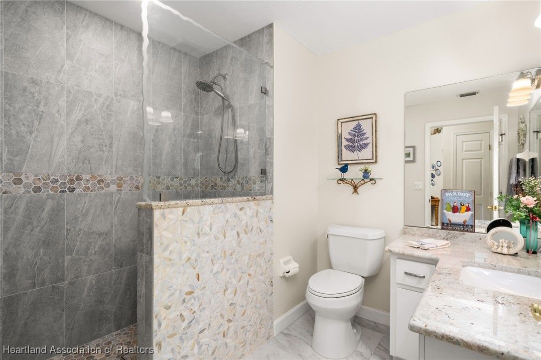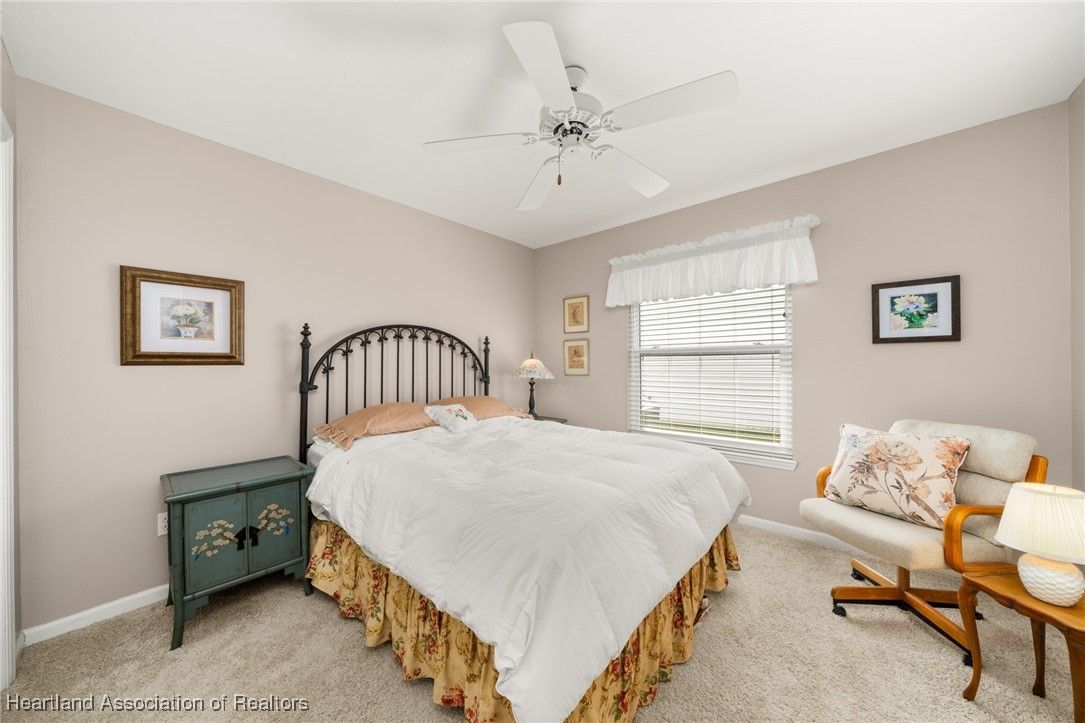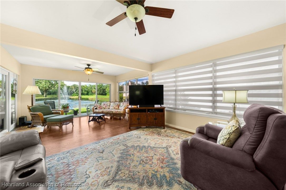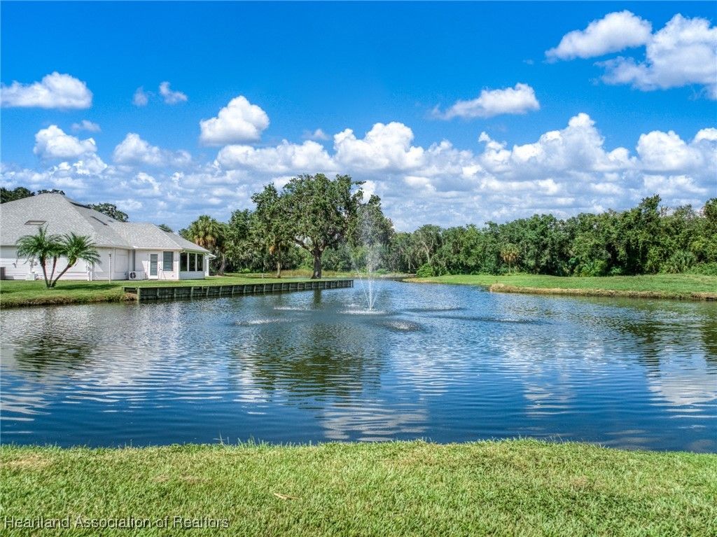 UPDATED!!! And TRULY, this is one of the most beautiful homesites in Highlands Ridge. You'll love the serene water setting, fountain and golf course views. Your favorite rooms will surely be the grand family room boasting lots of natural light and the wonderful, (almost 14' x 17'), screen porch highlighted by cathedral ceiling, these are great spaces where you can unwind, watch TV or entertain while overlooking the water. Have peace of mind with a brand new roof, new Pella windows plus a whole house generator. Spacious, charming kitchen features granite countertops, stainless steel appliances, under-cabinet lighting, breakfast bar, pantry and built-in corner display shelves. Just off the kitchen is the roomy breakfast nook with bay window. Nice master bedroom with walk-in closet and elegantly remodeled ensuite boasting a double sink granite vanity, modern walk-in shower, relaxing tub and a linen closet. Your family or guests will appreciate the generously sized guest bedrooms and the beautifully modern guest bathroom with tile shower and granite vanity. Convenient indoor laundry room with cabinets, granite countertop, laundry tub plus washer and dryer included. Roomy 2 car garage with lots of storage space and attic stairway. Neatly manicured lawn with irrigation, 2023 AC and 500 gal tank for generator. You'll love the community, surrounded by beautiful oak trees, where you can enjoy a refreshing dip in the two pools or spa, work out in the gym, participate in various clubs, go for a round of golf, grab a bite to eat at the Irish Pub and play on the tennis courts, shuffleboard courts or pickleball courts. The common facility fee covers lawn maintenance, use of amenities and subdivision maintenance. In addition to common facility fee, there's a $25/year HOA fee that covers resident voting as a member of association. Rentals allowed, with association approval, and two pets allowed. (Items included: EZ-go golf cart. Ethan Allen sofa in living room. In foyer: mirror & glass top table. In kitchen: dining table with 4 chairs and 2 barstools. In sunroom: rattan furniture including sofa, chair, ottoman & table with glass top.)