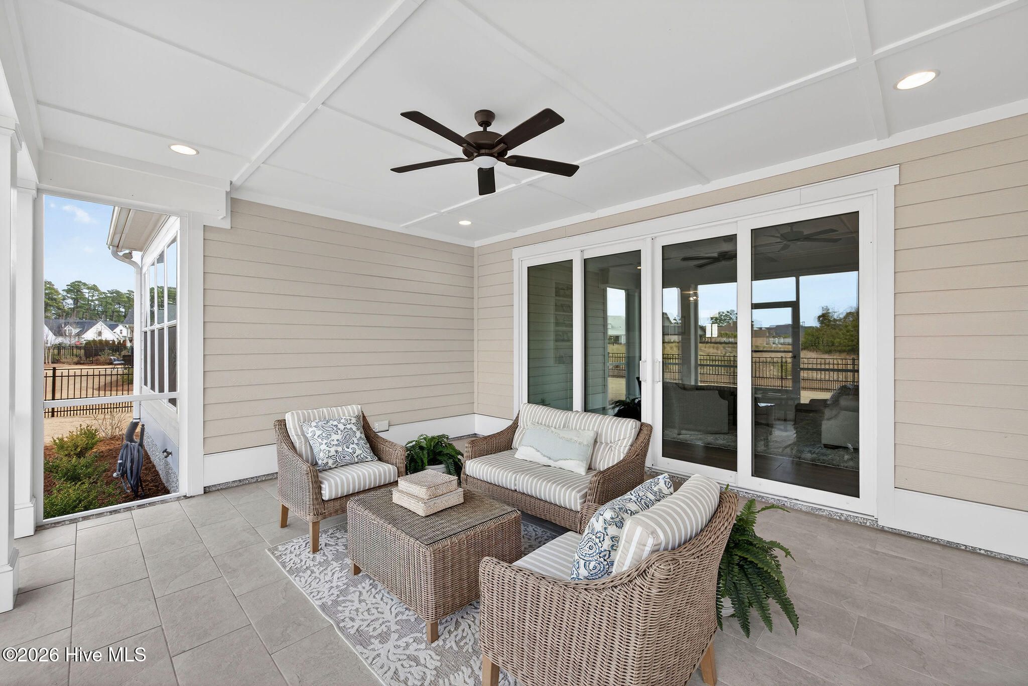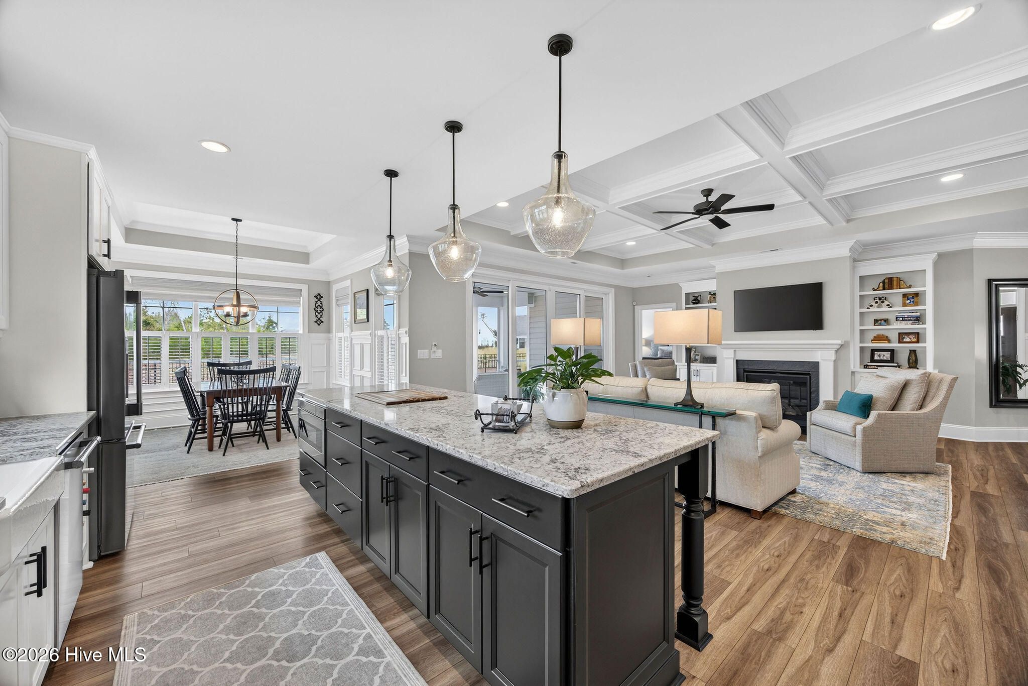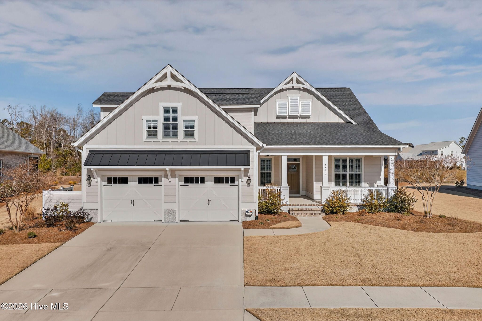 Located in The Peninsula at Cape Fear National, 3214 Calusa Cove, built in 2023, offers an easy-living coastal lifestyle on a .25-acre fenced lot. The home features LVP flooring throughout with no carpet, plantation shutters, and refined trim details including crown molding, wide baseboards, and wainscoting in the foyer and dining room. The open layout is complemented by a chef's kitchen with double ovens, natural gas stove, gas logs, and hot water heater, with the added peace of mind of a home connected to a whole-house generator and security system. A spacious bonus room with its own bath offers ideal flexibility for guests or additional living space, while walk-in attic storage offers ample storage space. The backyard is a peaceful setting with privacy behind. Lawn maintenance is included in the HOA, allowing for truly low-maintenance living. Residents of Brunswick Forest enjoy an active, resort-style lifestyle with multiple pickleball and tennis courts, pools, fitness centers, and miles of walking trails, along with year-round community events, all just minutes from shopping, dining, medical facilities, downtown Wilmington, and area beaches.