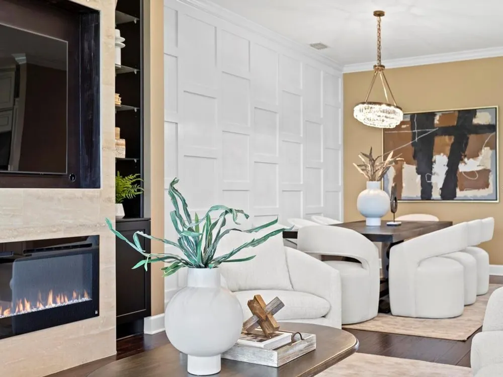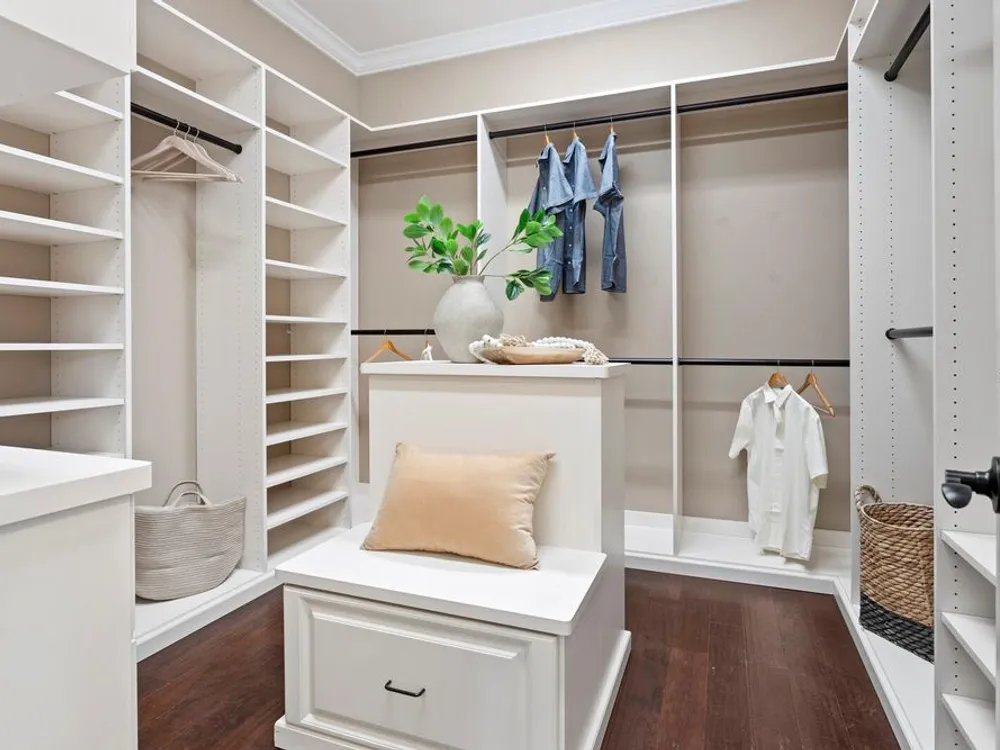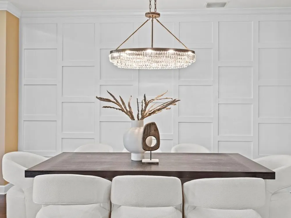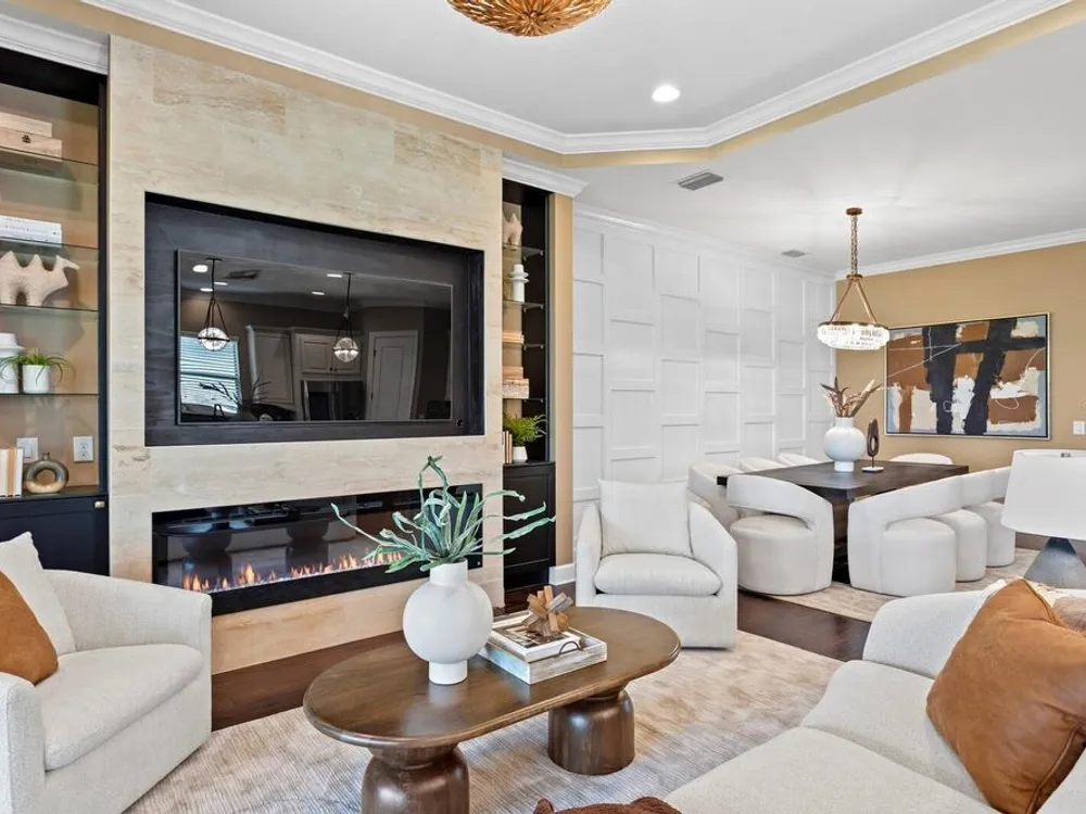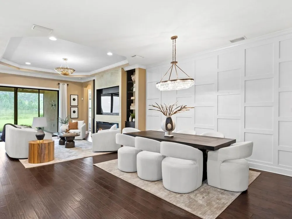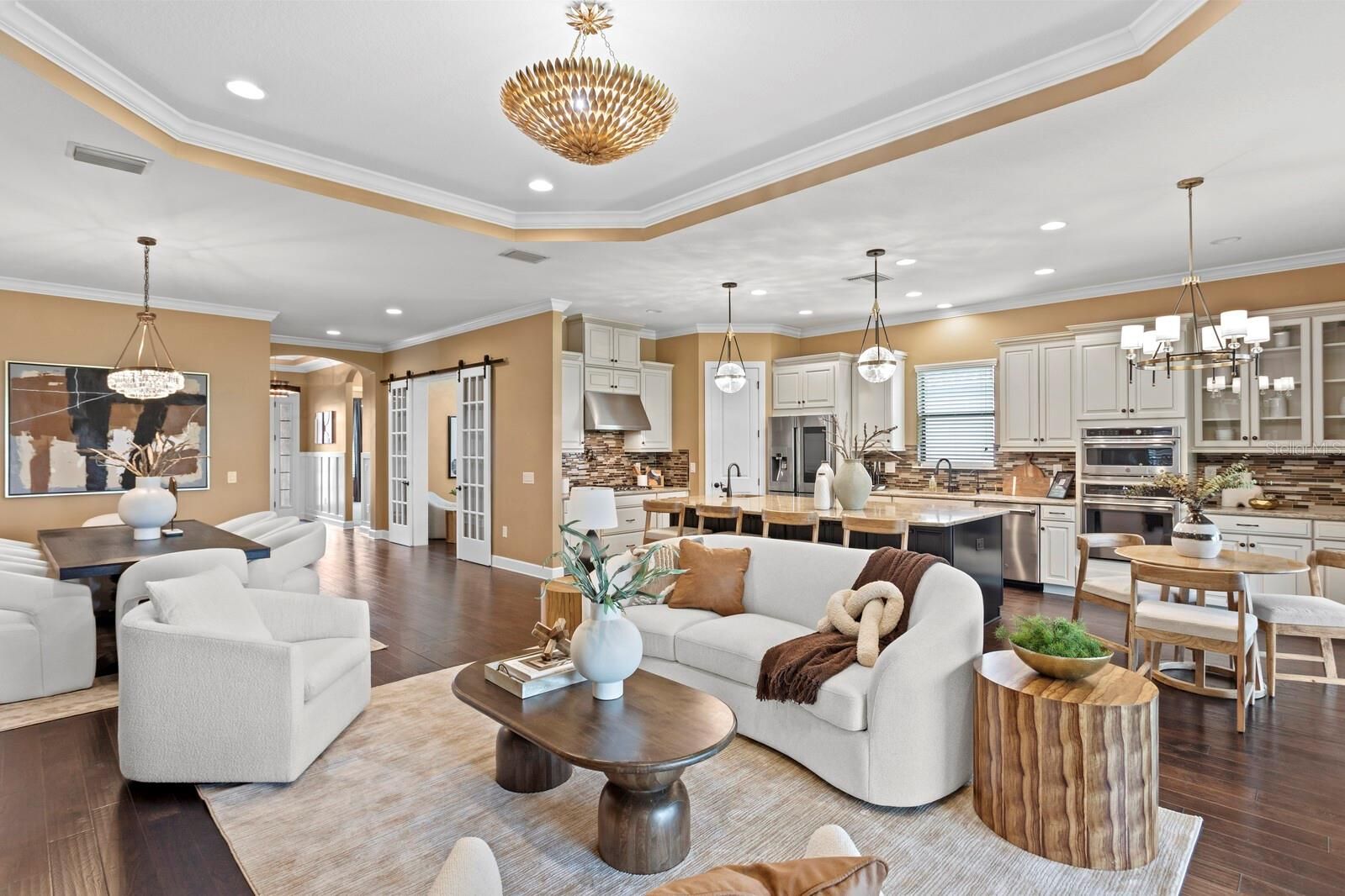 - Built-in Features, Ceiling Fan(s), Crown Molding, Dry Bar, Eat-in Kitchen, High Ceilings, Living/Dining Room, Open Floorplan, Other, Main Level Primary, Solid Surface Counters, Solid-Wood Cabinets, Tray Ceiling(s), Walk-In Closet(s), Wet Bar, Window Treatments