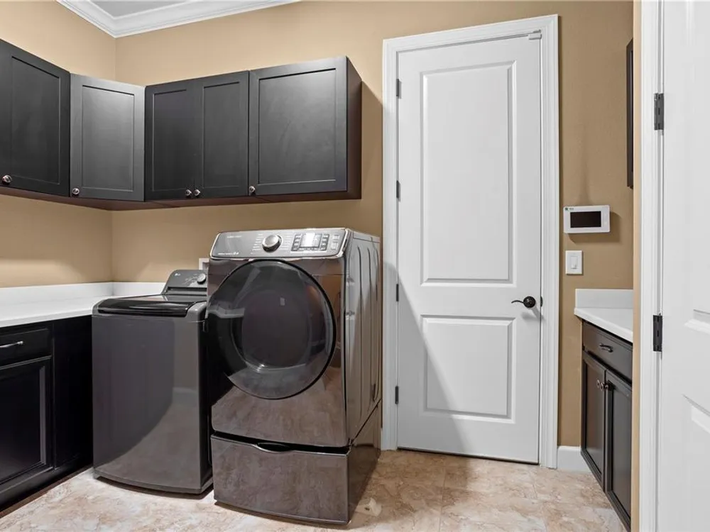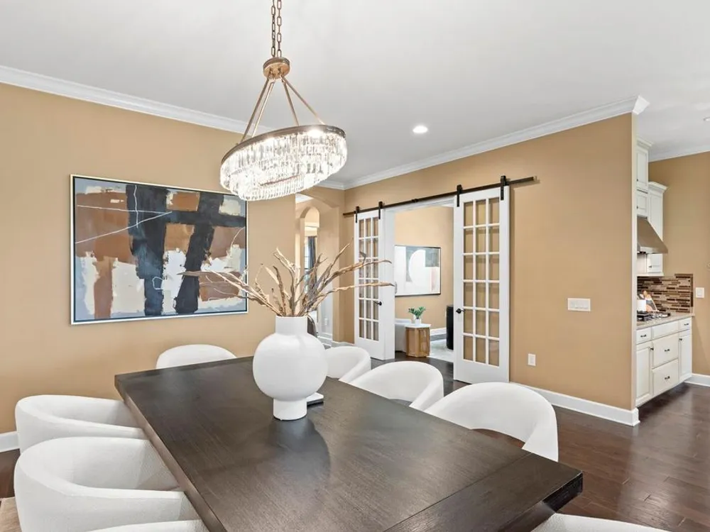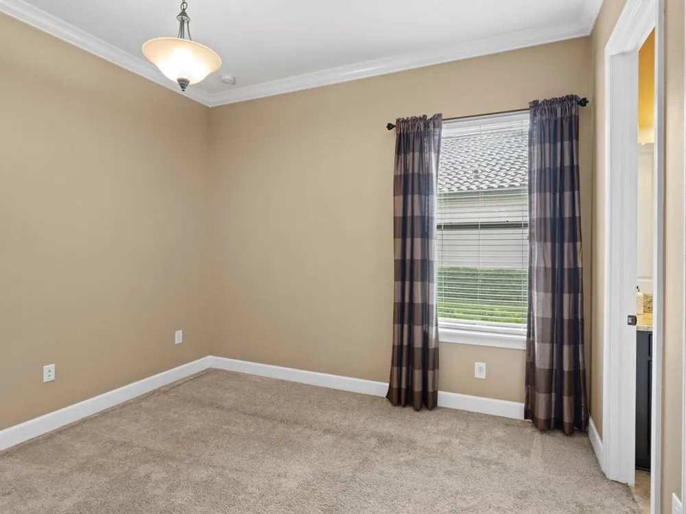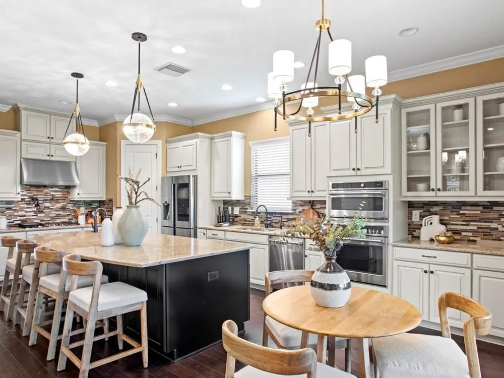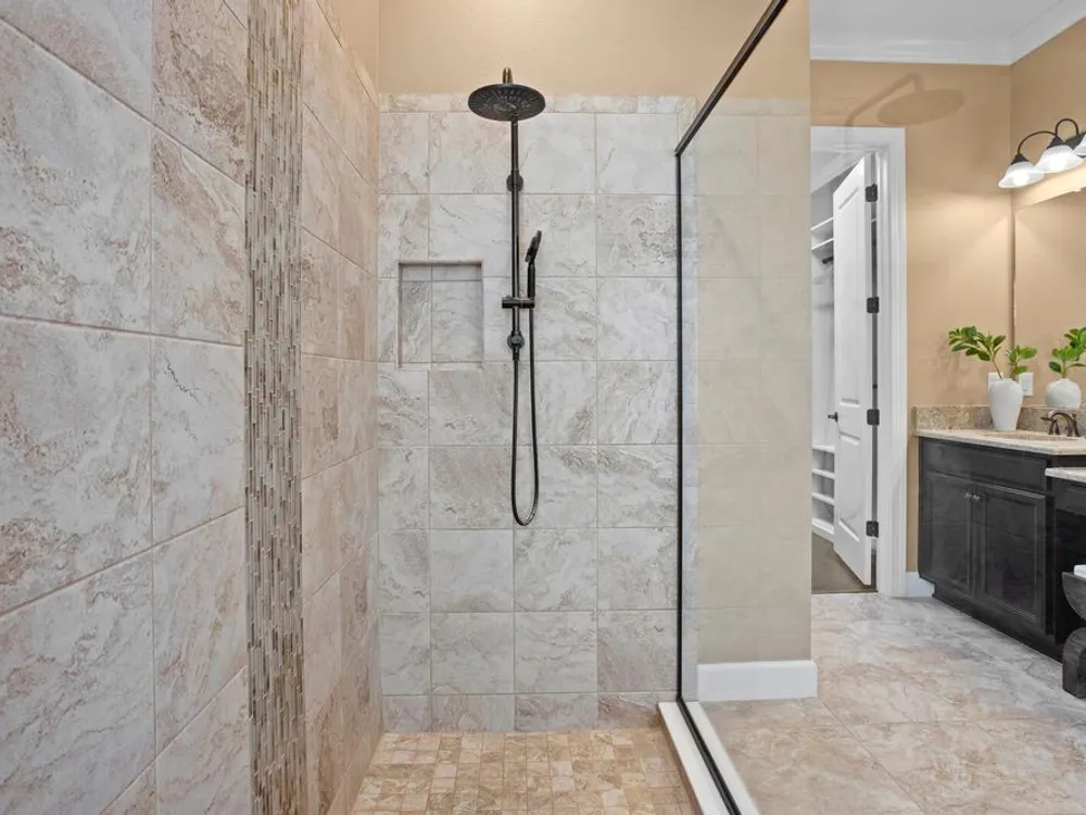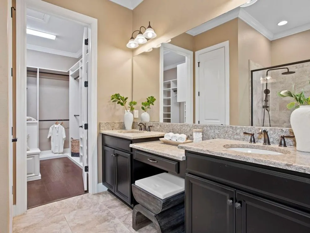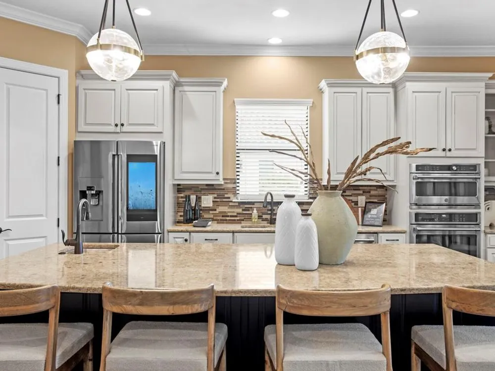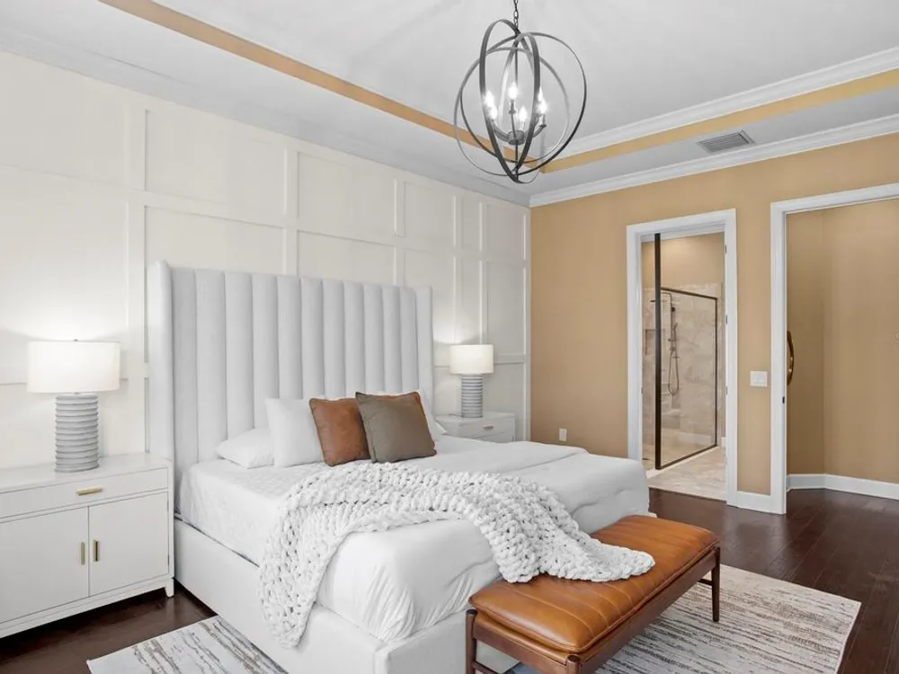 - Built-in Features, Ceiling Fan(s), Crown Molding, Dry Bar, Eat-in Kitchen, High Ceilings, Living/Dining Room, Open Floorplan, Other, Main Level Primary, Solid Surface Counters, Solid-Wood Cabinets, Tray Ceiling(s), Walk-In Closet(s), Wet Bar, Window Treatments