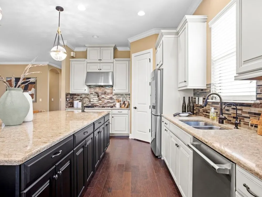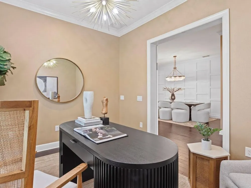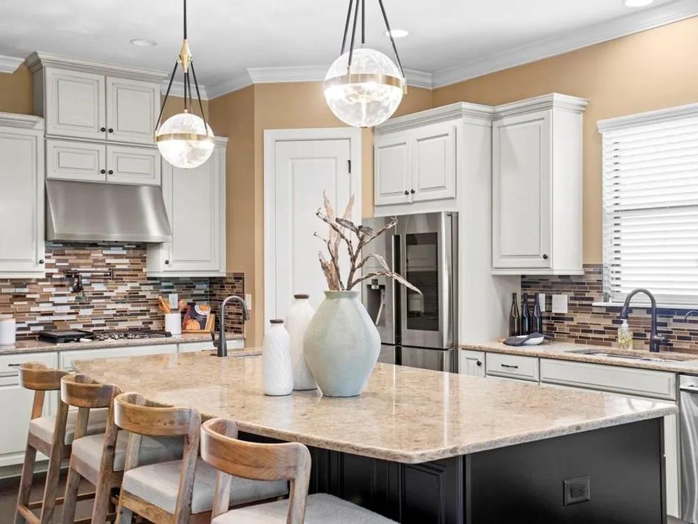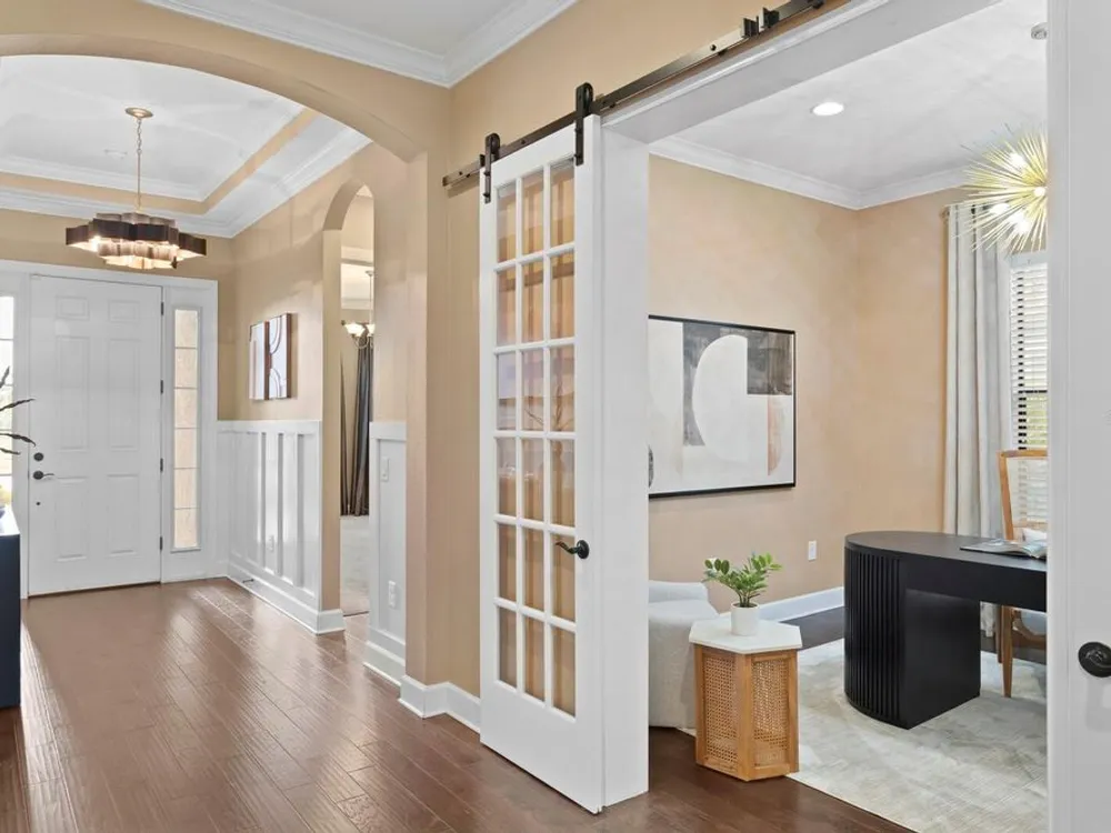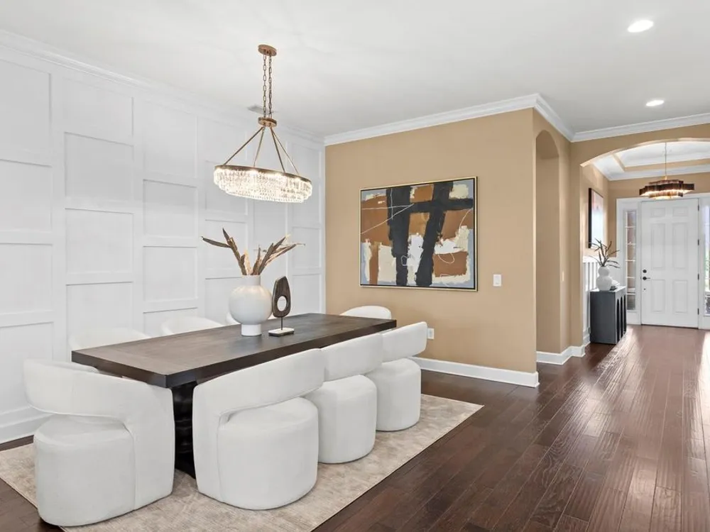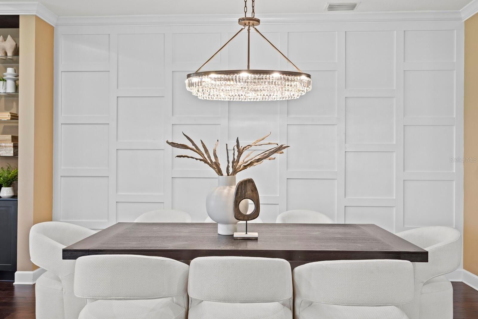 - Built-in Features, Ceiling Fan(s), Crown Molding, Dry Bar, Eat-in Kitchen, High Ceilings, Living/Dining Room, Open Floorplan, Other, Main Level Primary, Solid Surface Counters, Solid-Wood Cabinets, Tray Ceiling(s), Walk-In Closet(s), Wet Bar, Window Treatments