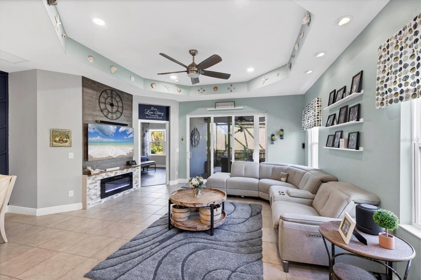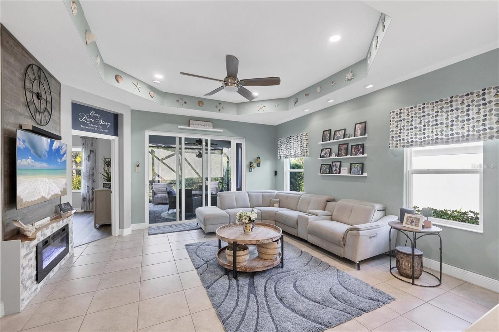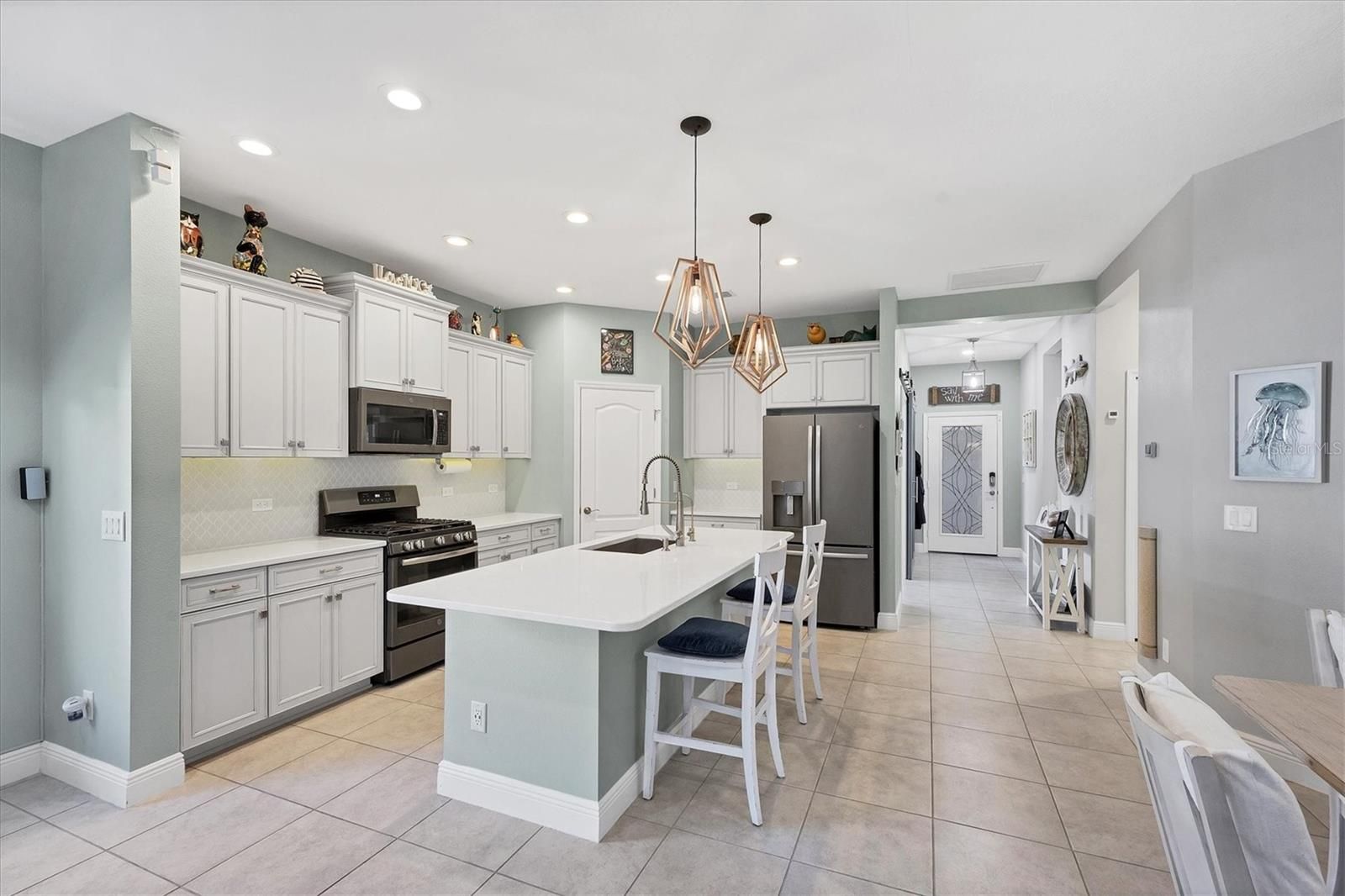 Come check out this meticulously maintained villa located in the award winning gated neighborhood of Indigo! This premium ''Tidewinds'' villa boasts 2 bedrooms, 2 bathrooms, a generous sized study/den, indoor laundry room, large two-car garage, extended lanai with premium pavers, highly desirable private rear conservation area AND lake view! Rest assured, your new villa is built strong and safe with its HURRICANE IMPACT windows throughout, insulated cinder block construction, concrete tile roof AND is located in an ''X'' floodzone! This villa also comes equipped with a portable Tri -Fuel, (Natural Gas, Propane, or Gasoline) generator which connects to the natural gas line extension outside the villa and is capable of powering all the appliances and Air Conditioning in the event the power goes out. Your new villa also has ''smart home'' capabilities which allows you to remotely operate your garage door, front door and thermostat! Throughout you will find 5 1/4" deco baseboards, UV light filtration incorporated in the ''TRANE" air conditioning unit, LED recessed lighting, ceramic tile, luxury vinyl plank, custom barn doors, premium built-ins and accent walls, upgraded light fixtures, reverse osmosis water in the kitchen and much more! The luxurious primary suite offers TWO closets, a large walk-in shower with separate his and hers vanities with stone countertops. The guest bedroom features a generous sized closet and built-in murphy bed. The high quality built-ins continue into the office where you will find a custom wrap around desk with more than enough shelving and cabinet space! This amazing family room has a designer trey ceiling and custom accent wall with an electric fireplace which makes this centerpoint of the villa the perfect interior gathering location. The kitchen boasts a large island with breakfast bar, 5-burner gas convection oven, reverse osmosis water filtration system plus a booster at the sink that provides instant hot water, premium slate steel appliances with exterior ventilated microwave plus LED overhead lighting as well as undermount lighting that complements the premium quartz countertops. Open the three paneled HURRICANE IMPACT slider and be amazed at not only the amount of room the paver rich extended screened lanai provides but your peaceful, undisturbed conservation area (NO rear neighbors) PLUS lake view. Your new lanai also comes equipped with a motorized sun shade, heightened 120V electrical socket so no wires will be showing for any desired flat screen. The large 2-car garage comes equipped with a HURRICANE IMPACT, insulated garage door and several storage racks. Indigo is an active community that features a full time on-site manager as well as a full time activities director that manages an extensive calendar of activities for all ages. A-Rated Gullett Elementary AND Mona Jain Middle school are right outside our gates too! You can also expect sidewalks on both sides of the street, ''Oasis'' pool/spa, resort style heated community pool/spa at the main clubhouse where you will find 5 cabanas with an abundance of seating, 4 pickleball courts, 2 bocce ball courts, 24-hour exercise gym, meeting room/banquet room and playground. Indigo is not only a community that takes care of all ground maintenance to include mowing, fertilizing, irrigation, shrubs and mulch but is right around the corner to a plethora of dining, banking, entertainment, public transportation and MORE!