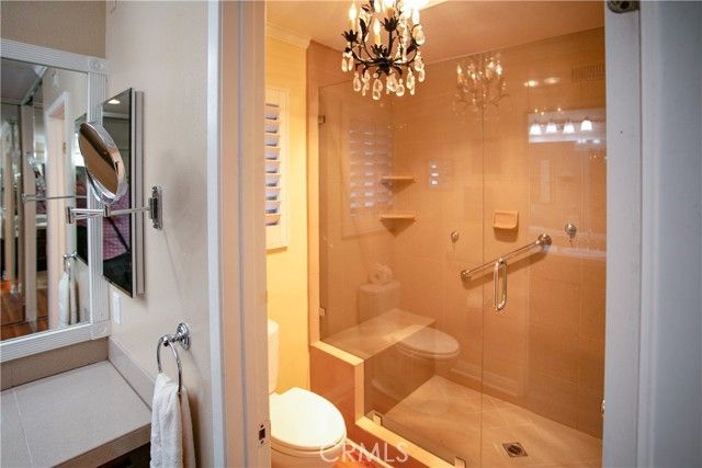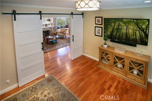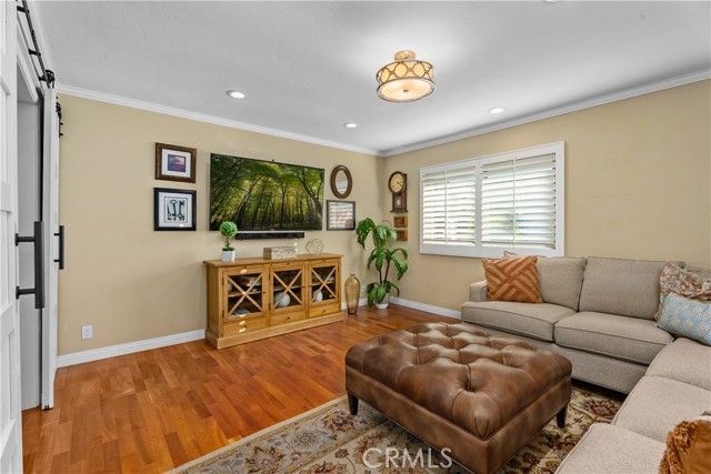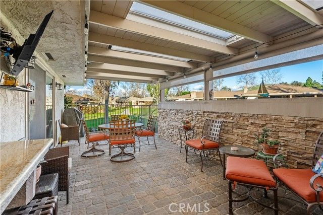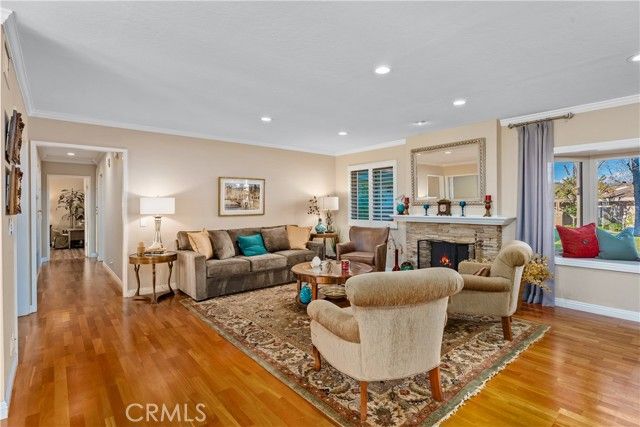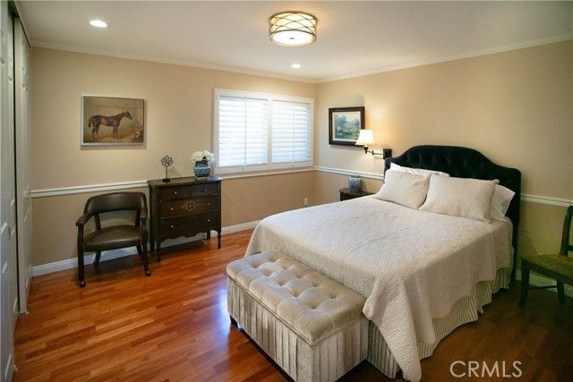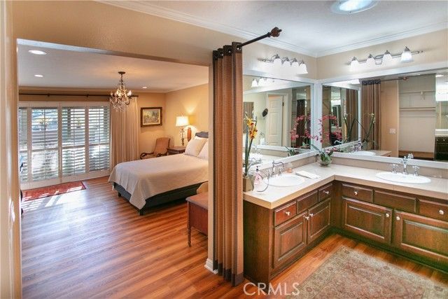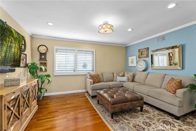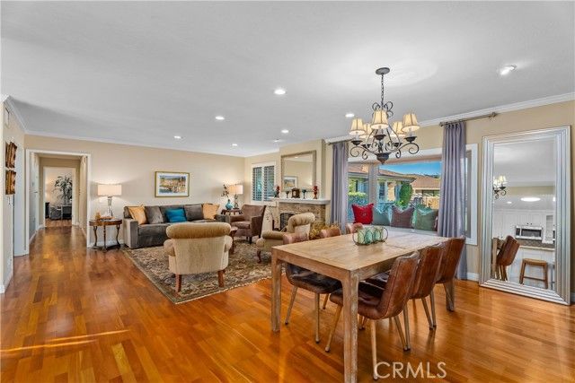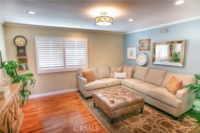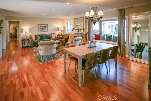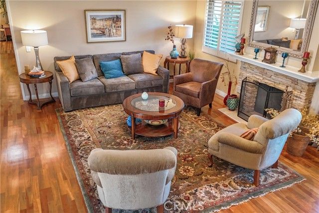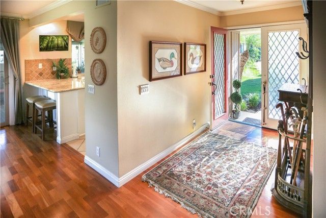 If you're looking for a turnkey, move-in-ready, single-level home in a peaceful and private setting, this is it. Located in the highly desirable 55+ community of San Juan Hills East, this beautifully upgraded residence offers abundant natural light, thoughtful design, and true pride of ownership. Enjoy a quiet location with no one above or below and only one minimal common wall. A custom stained-glass double-door entry creates a striking first impression, filling the foyer with natural light. Professionally designed, low-maintenance landscaping surrounds the home, featuring custom pebble-stone and river-rock walkways that connect the entry, patios, side yard, and garage. Inside, the open floor plan is enhanced by real wood plank flooring throughout the entire home, including all bedrooms. Granite countertops, recessed lighting with dimmers, plantation shutters, and custom blackout draperies create a refined yet comfortable living space. Solar tube skylights in the kitchen, hallway, and both bathrooms add even more natural light. The upgraded kitchen features granite countertops, custom cabinetry, Bosch microwave, oven, and dishwasher, a built-in KitchenAid refrigerator, reverse osmosis water filtration, a custom bay window, and sliding doors with tranquil greenbelt views. Origina