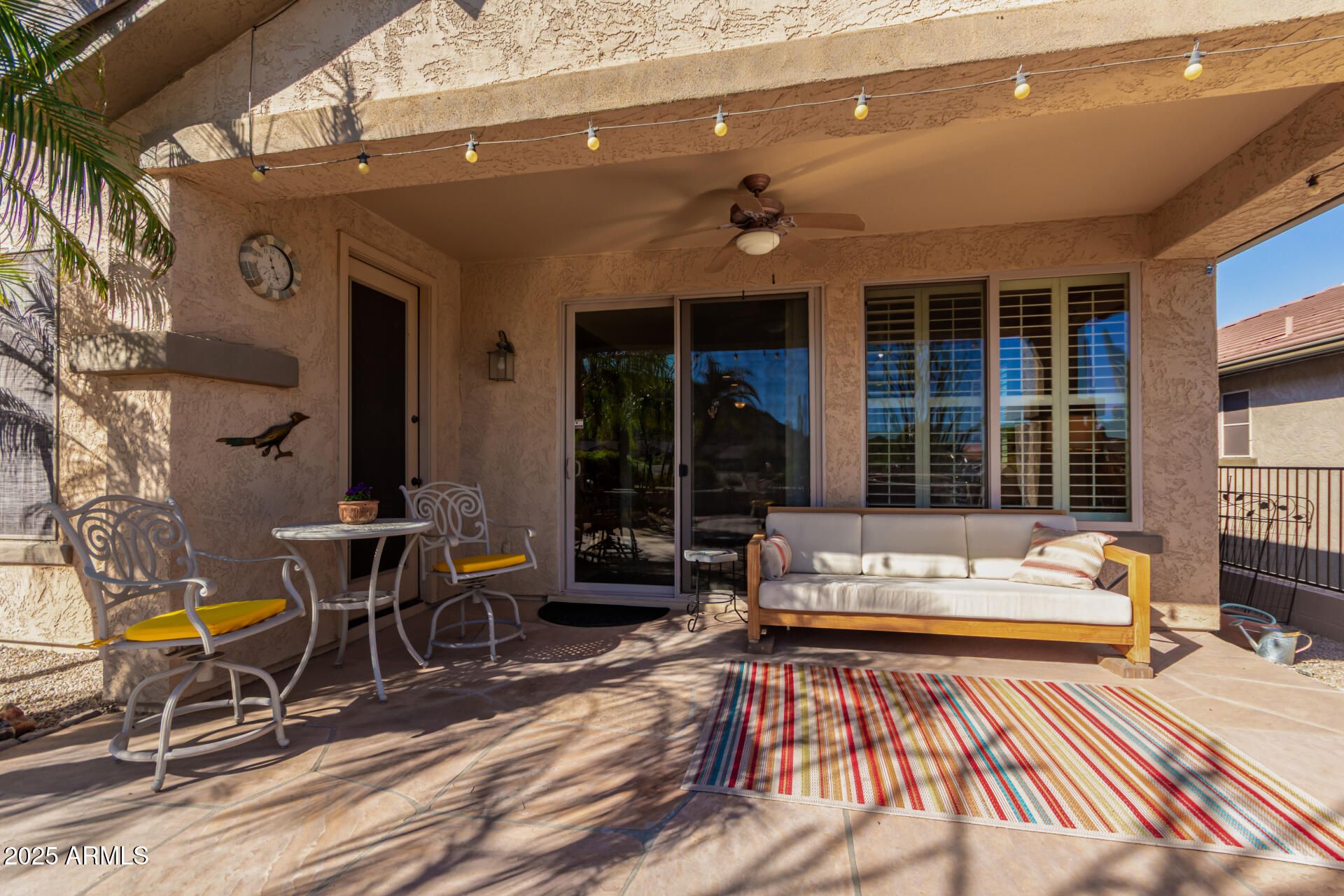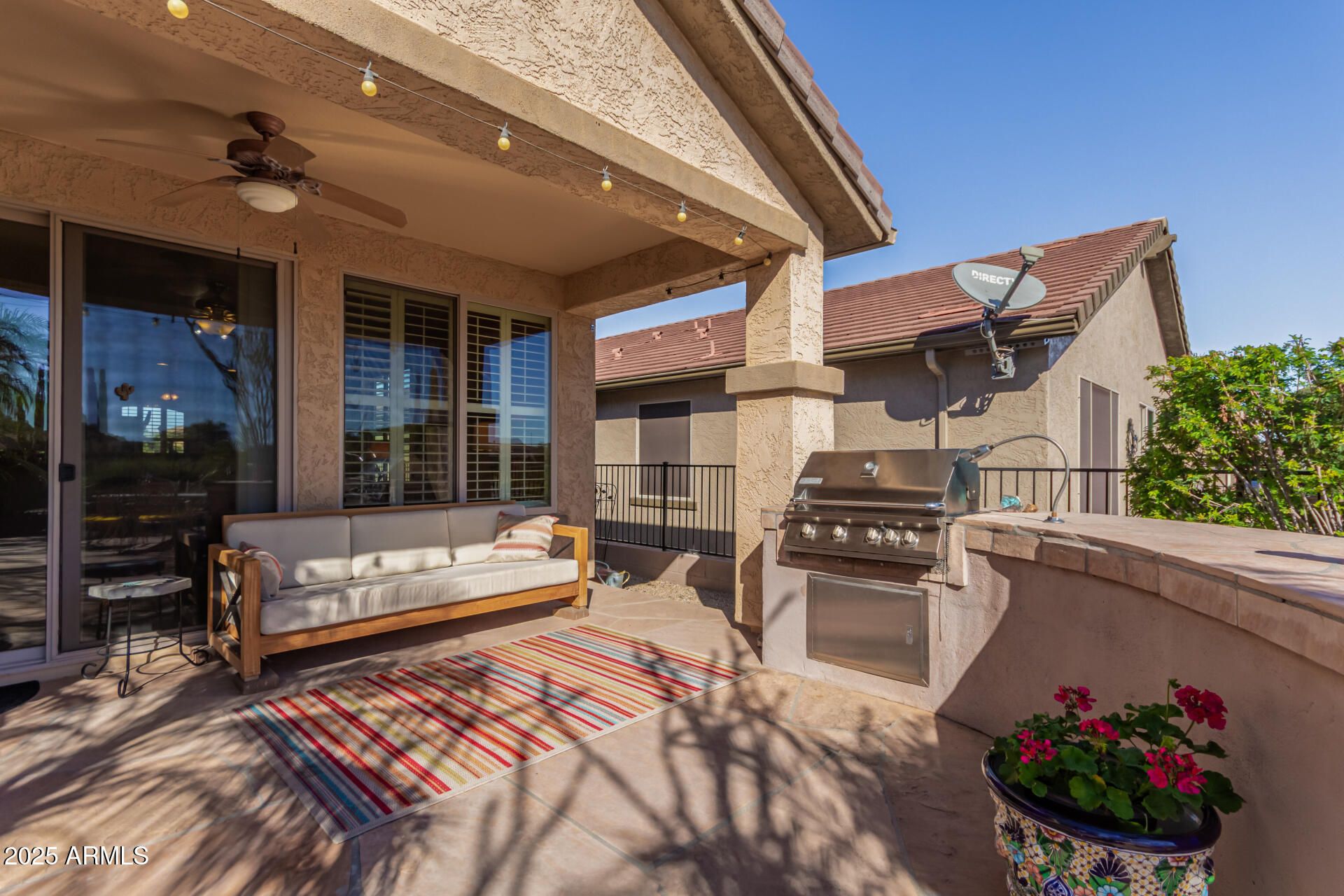 Live the lifestyle you've dreamed of in Solera at Johnson Ranch, a premier 55+ gated community! This 2bed, 2bath beauty features a kitchen with granite countertops SS appliances, RO system, and breakfast nook. The primary suite offers double sinks, a walk-in shower, and a spacious walk-in closet. Added touches include a water softener, shutters throughout and a garage with epoxy and built-in cabinets Enjoy AZ sunrises and mountain views from your east facing backyard with a built-in BBQ, firepit, water feature, lime tree, and extended flagstone patio overlooking the 15th tee box of San Tan Highlands Golf Club. Solera's resort amenities include heated pools and spa, fitness center, pickleball, community activities, and more!