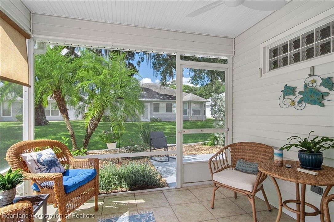 CHARMING, WELL-MAINTAINED, 2 bedroom + den/office, 2 bath, 2-car garage home in the active 55+ gated, golfing community of Highlands Ridge. A nicely landscaped lawn with concrete curbing and a screened front entryway greet you as you arrive. Come inside to an open, great room floor plan featuring a spacious living area with vaulted ceiling, wood laminate flooring & NEW ANDERSEN WINDOWS. The lovely kitchen has plenty of white cabinets, white appliances, a pantry and a breakfast bar open to the living room. Just off the great room through double doors is a den/office offering added living space. In the primary suite you'll find a walk-in closet and full bath with walk-in shower. The guest bedroom & bath are located on the opposite side of the home for added privacy. There's also a screened porch & patio overlooking the peaceful & shaded backyard, great for relaxing and barbequing. Plus, a new leaf filter gutter system has been installed. This home is perfect for year-round living, but could be a wonderful seasonal retreat. Highlands Ridge amenities include lawn care, community center, two outdoor heated pools, fitness center, golfing, pickleball, tennis courts, shuffleboard and so much more.