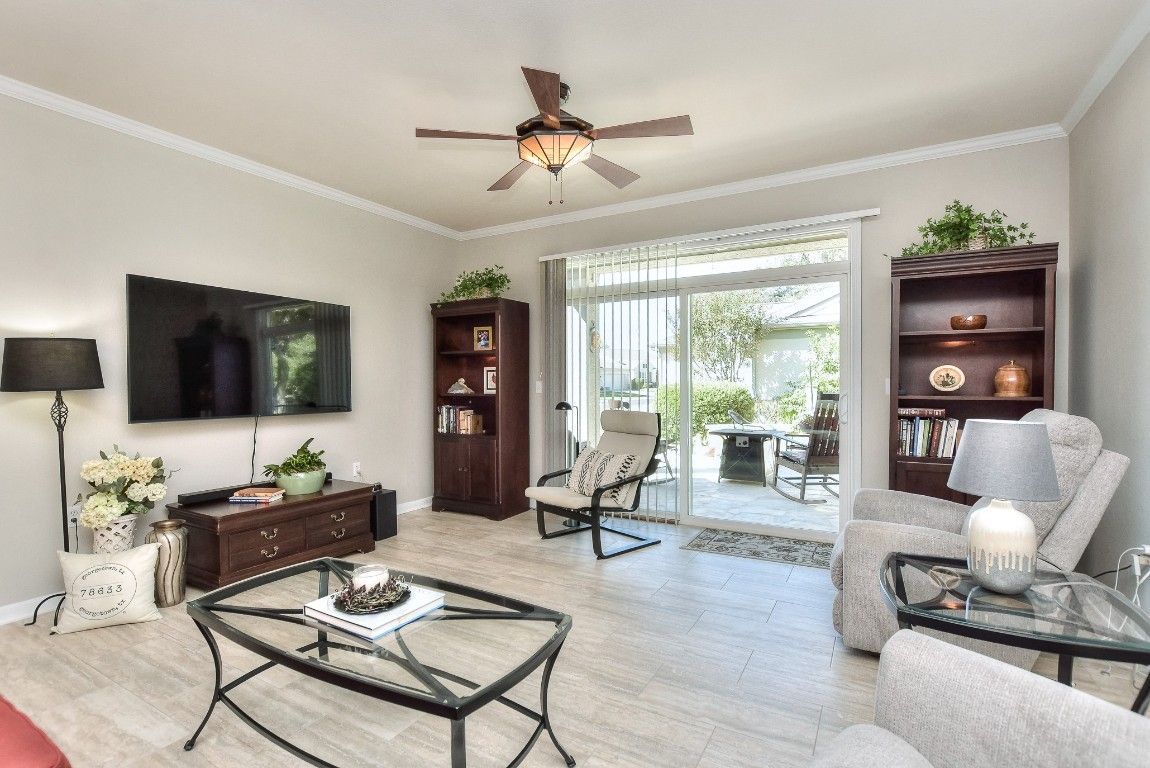 Welcome to this immaculate Monroe floor plan, one of the community's most popular and in-demand layouts. Situated on a large corner lot, this home boasts outstanding curb appeal and offers a wealth of custom upgrades, setting it apart from the rest. The interior showcases modern elegance and function. The kitchen is a true centerpiece, completely updated with granite countertops, stylish painted cabinets, a contemporary backsplash, under-cabinet lighting for task and ambiance, and a custom slate stone facade accenting the breakfast bar and main cabinet run. All primary appliances were replaced in 2023. The oven has air fryer capabilities. The kitchen is plumbed for gas if that is a preference for the oven. Elegant crown molding accents the entry, main living, and dining areas, complementing the updated tile floors found throughout the kitchen and main living spaces. The bathrooms have been beautifully updated with granite counters, featuring a large, modern walk-in shower with ceiling heater in the primary bath. The versatile layout includes a cozy breakfast nook, spacious living and dining areas, a second bedroom, and a study accessed through classic French doors, which includes a custom built-in desk, cabinets and bookshelf. Outdoor living is exceptional with an extended, custom back patio with a retractable awning, and an expansive front yard featuring extensive landscaping, a beautiful water feature, and a lovely sitting area to enjoy with family and friends. An epoxy walkway extends seamlessly from the driveway to the front entry. Practical updates include a Roof replaced in 2019 and HVAC replaced in 2016. The hot water heater has a circulation pump. Garage has extra space and includes cabinet storage. For added value, the washer/dryer, main refrigerator, garage refrigerator, and water softener all convey with the home. This is the turnkey opportunity you've been waiting for!