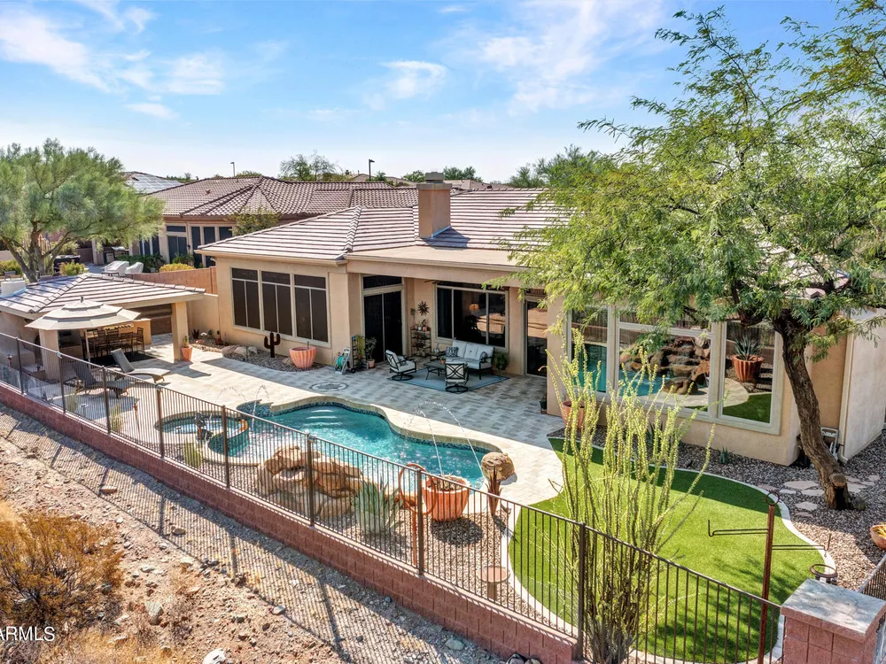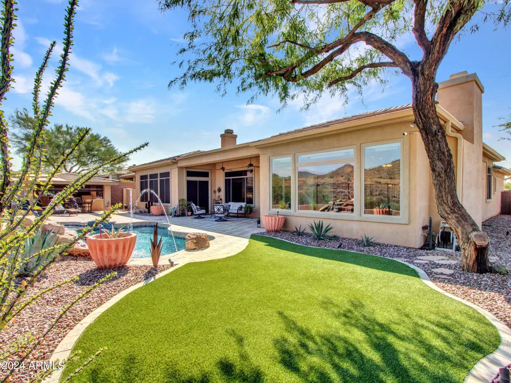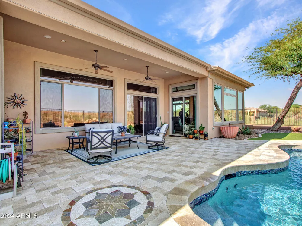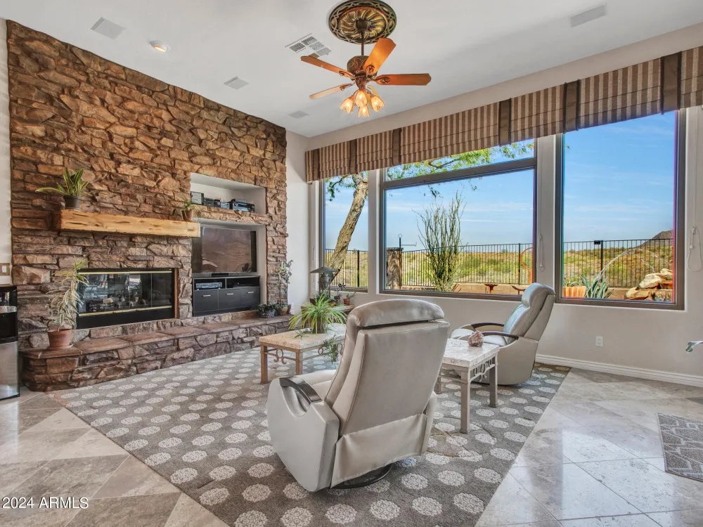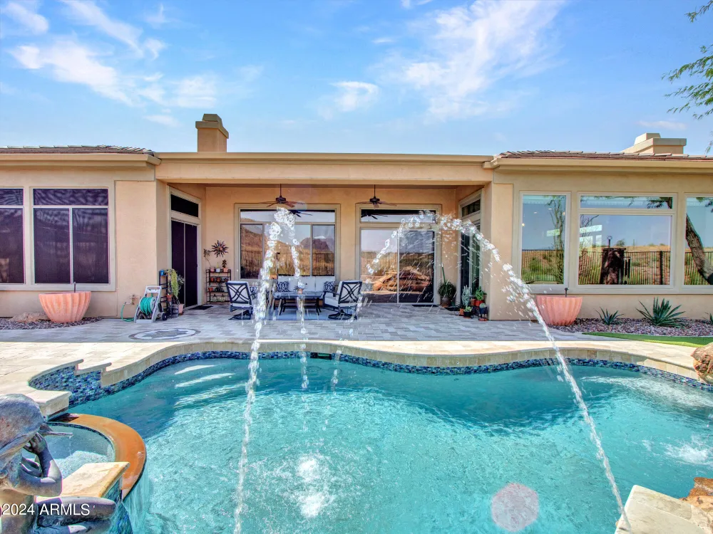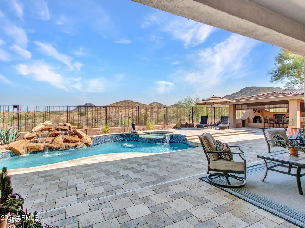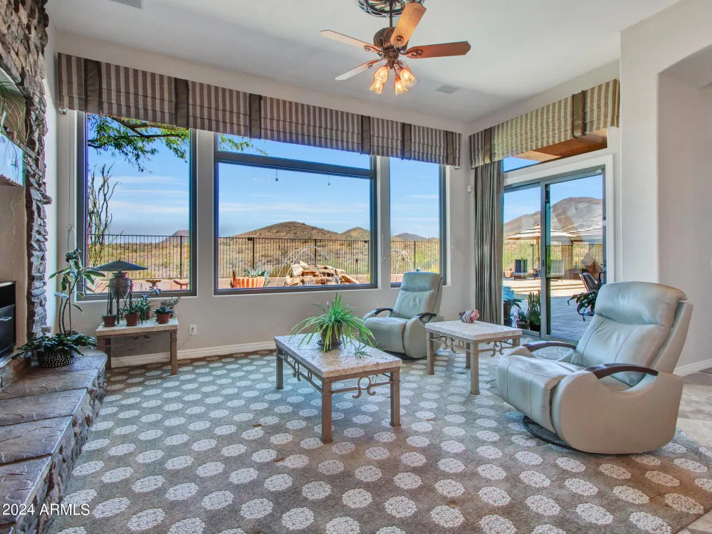 Experience the epitome of luxury living in this beautifully updated Anthem Country Club home, boasting a perfect blend of modern convenience and elegant design. Nestled on a prime lot with unobstructed views of both Daisy Mountain and Gavilan Peak, this property offers a serene backdrop that is simply breathtaking. Key Upgrades: • Brand new air conditioning system installed in September 2024 • New roof added in 2020 • Freshly painted interiors highlighting the home's sophisticated design This residence is a haven of high-end features, including upscale kitchen appliances like Sub-Zero, and a Scotsman. Every detail exudes luxury, from the soaring 12' ceilings and stone accent walls to the stunning alabaster chandeliers and intricate marble medallion. Additional luxury touches include: " Granite counters and stone flooring " Plantation shutters and custom draperies " Custom-built bookcases " Central vacuum system Step outside to your resort-style backyard, a private retreat perfect for entertaining or unwinding. Swim year-round in the heated pool and spa, complete with a rock waterfall. An outdoor kitchen awaits under a ramada, featuring a 48'' DCS gas grill, sink, refrigerator, and a cozy fireplaceideal for enjoying Arizona evenings. Whether you're relaxing poolside or hosting a barbecue, the spectacular mountain views will make every moment unforgettable. This home truly offers the best of Anthem Country Club living.