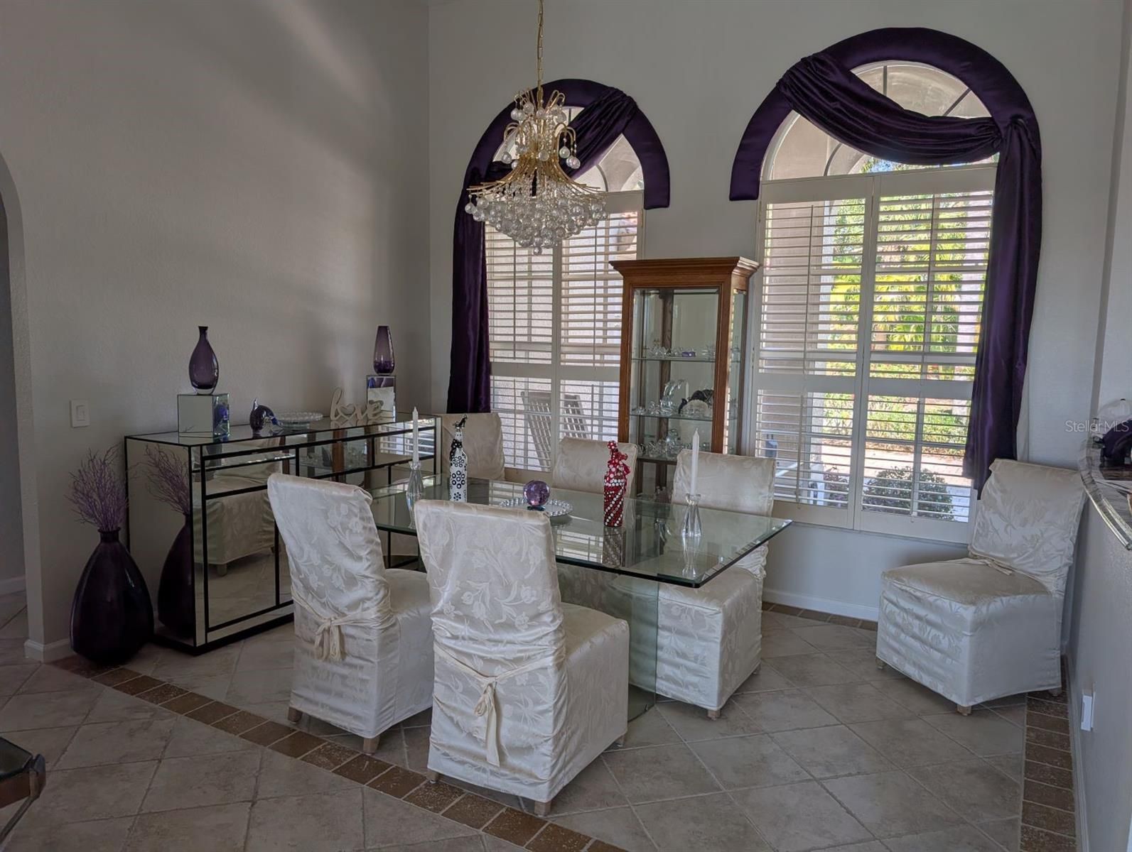 - Eat-in Kitchen, High Ceilings, Kitchen/Family Room Combo, Main Level Primary, Solid Surface Counters, Split Bedrooms, Walk-In Closet(s), Window Treatments