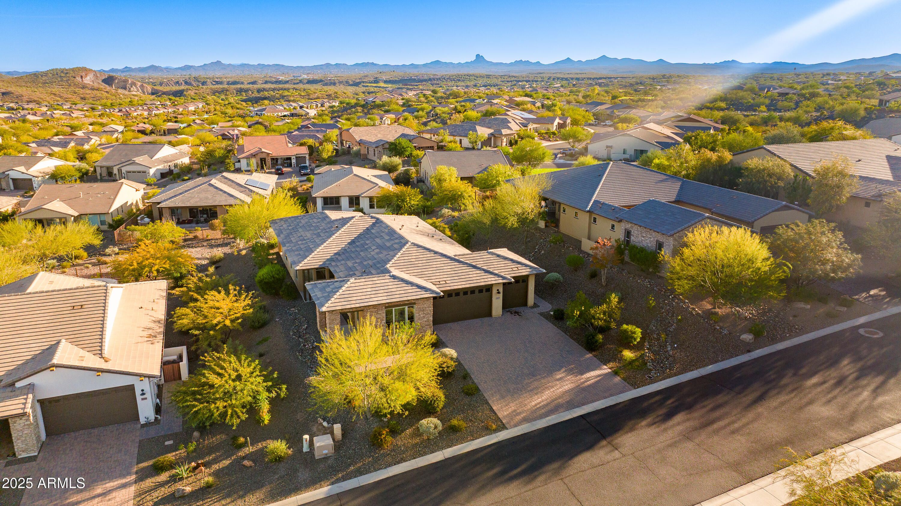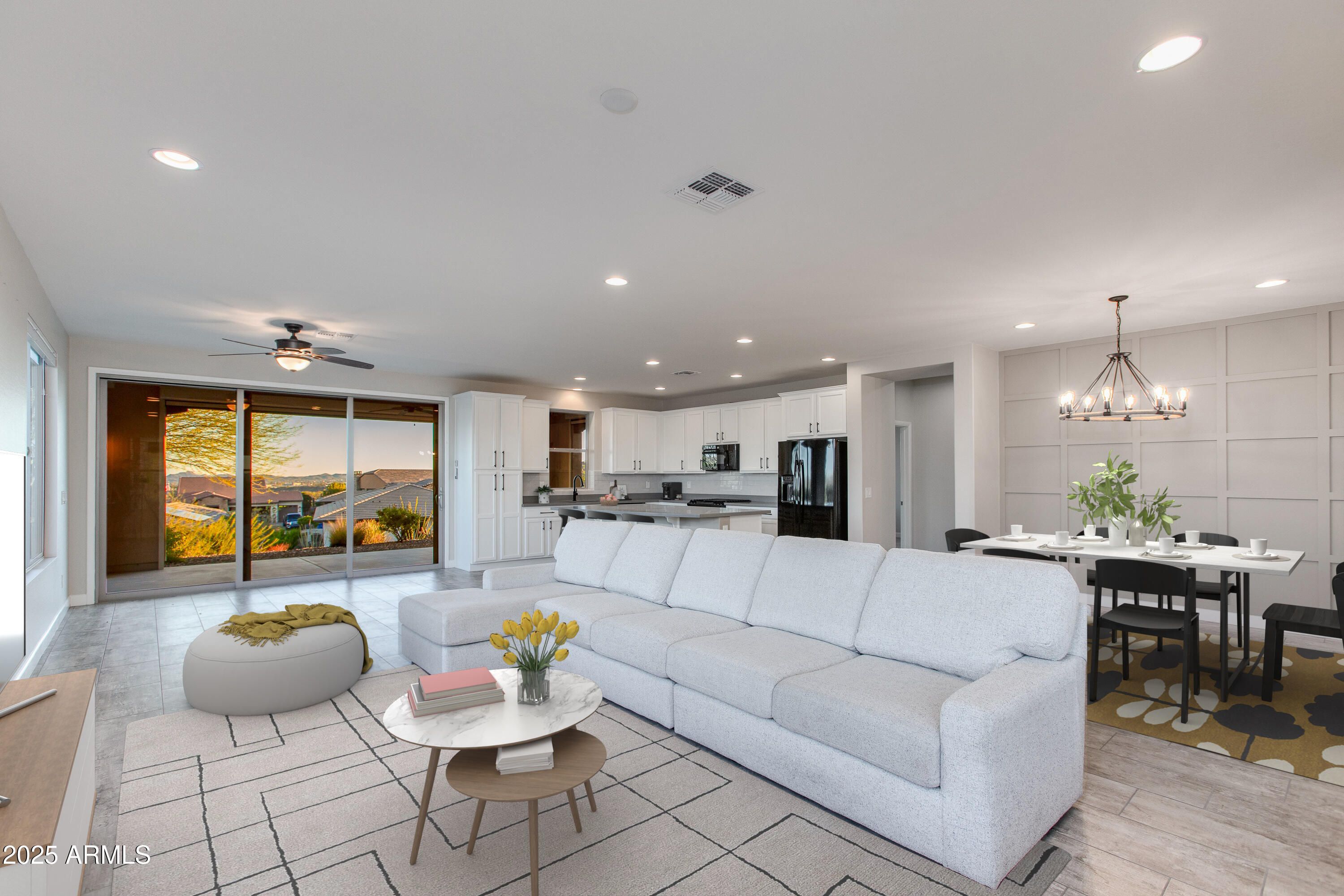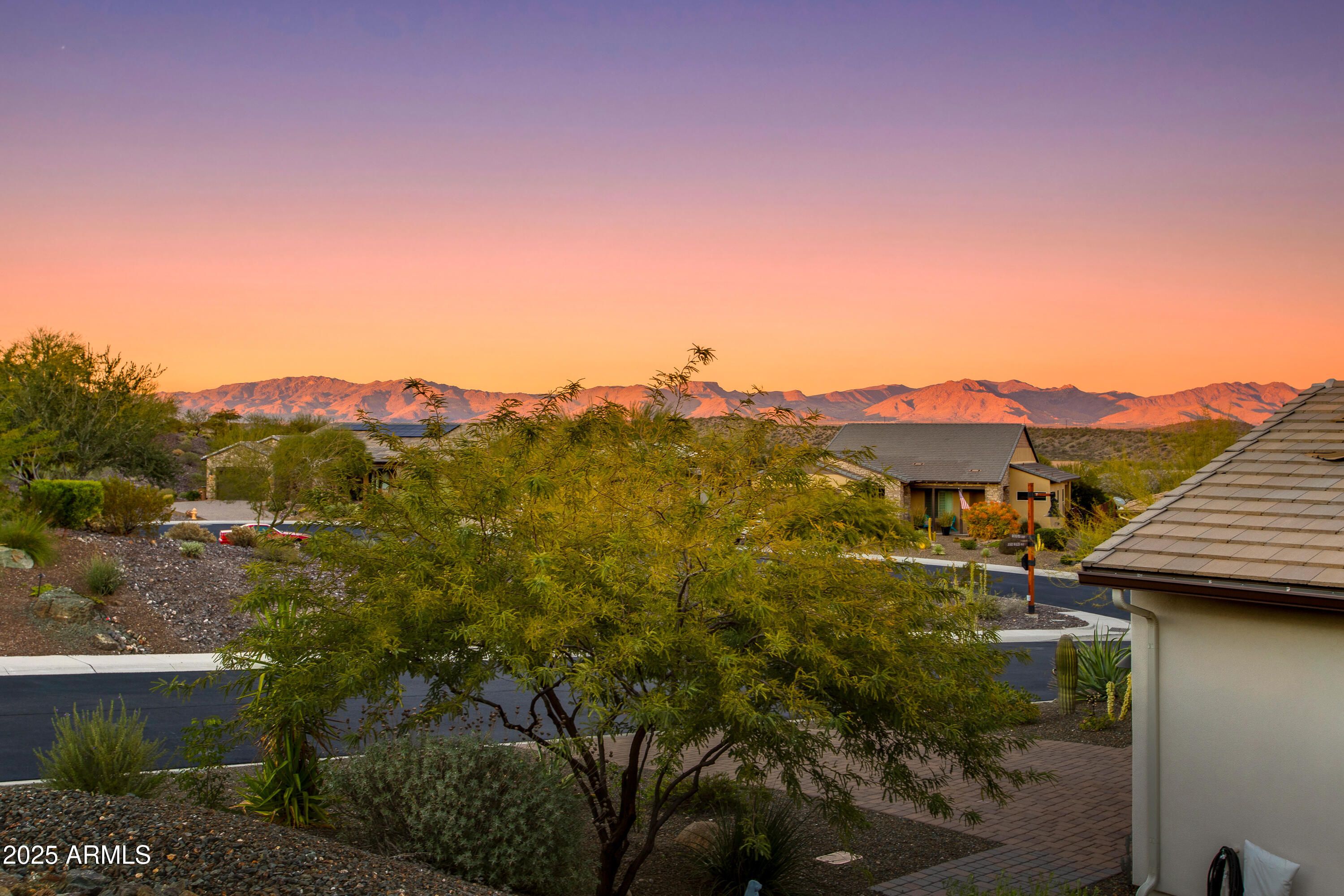 Beautiful Sycamore on an oversized terraced homesite in the highly desirable Caballero neighborhood. This 2-bed, 2.5-bath plus den home features custom interior details, barn doors, a Murphy bed, and a large laundry room. Upgrades include granite counters, Coconut Matte cabinets, enhanced lighting, and a 12' multi-slide leading to motorized patio screens. The 3-car garage is insulated, and the lot offers 360° entertaining spaces, landscape opportunities on both sides, and mountain views from the front and back. A water softener completes this stunning, private view home. - FULL DESCRIPTION - Gorgeous Sycamore floorplan on an oversized, terraced view lot in the highly desirable Caballero neighborhoodan entertainer's dream with true 360° living. This beautifully upgraded 2,141 sq ft home offers 2 bedrooms + den, 2.5 baths, and a spacious 3-car garage, all wrapped in amazing panoramic and mountain views from both the front and back of the property. The terraced homesite provides exceptional privacy and multiple outdoor zones for relaxing, dining, and hosting. Inside, custom touches elevate every room: Coconut Matte cabinetry, granite slab counters, 42" kitchen uppers, roll-out convenience package, upgraded Blanco undermount sink, enhanced LED lighting, and a dramatic 12' multi-slide door connecting the dining room to the back patio. The den features barn doors and a built-in Murphy bed, offering the perfect flex space for guests or work. A large laundry room adds functionality and storage. Additional upgrades include motorized screens at the back patio, a whole-home water softener, AV sleeve for TV mounting, added exterior outlets, fan pre-wires, and an insulated 3-bay garage. Both sides of the property offer unique landscape opportunities, allowing you to create your own outdoor havens around the already stunning natural surroundings. With incredible finishes, thoughtful design, and a premium location in Caballero, this home blends comfort, sophistication, and unforgettable Wickenburg Ranch views.