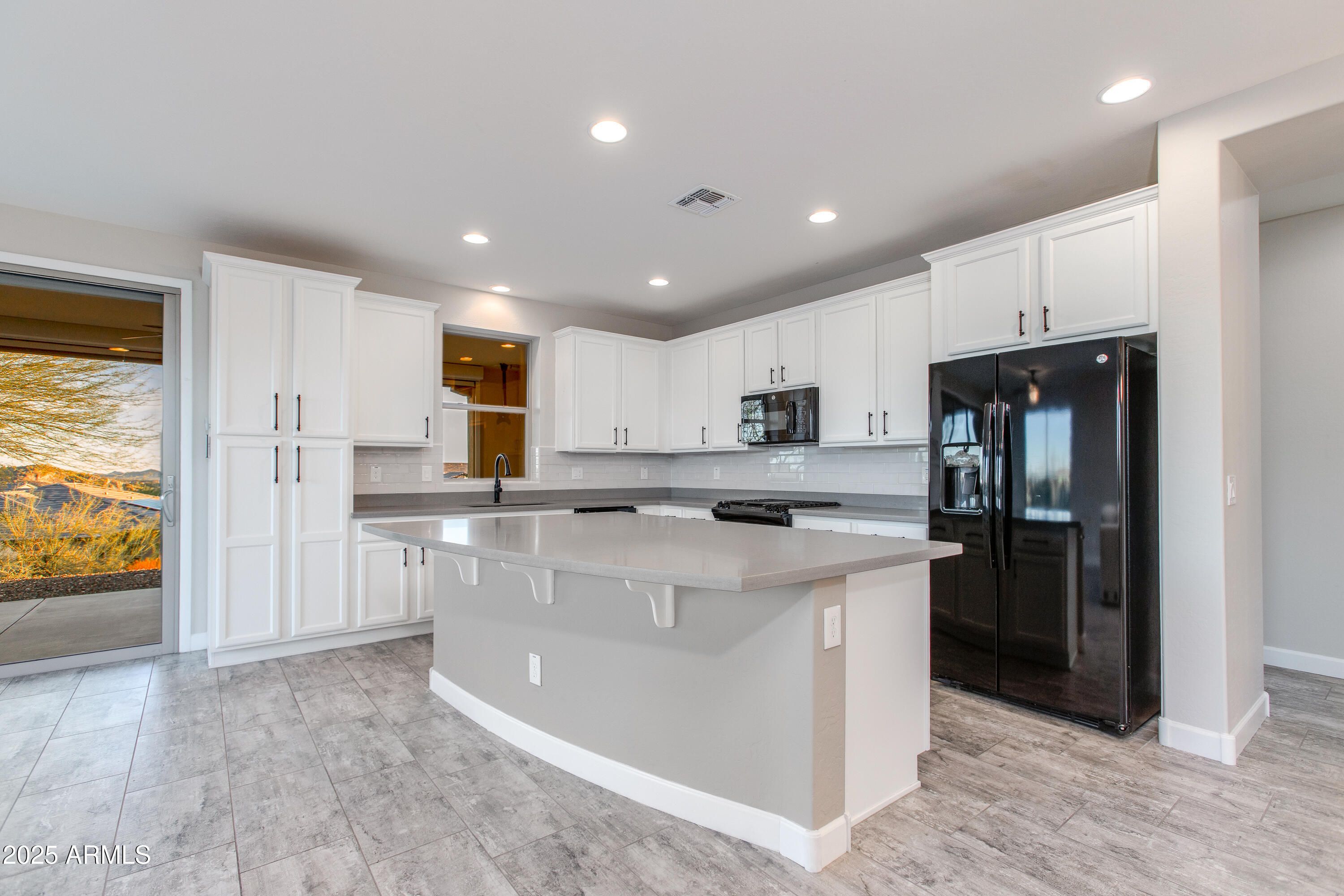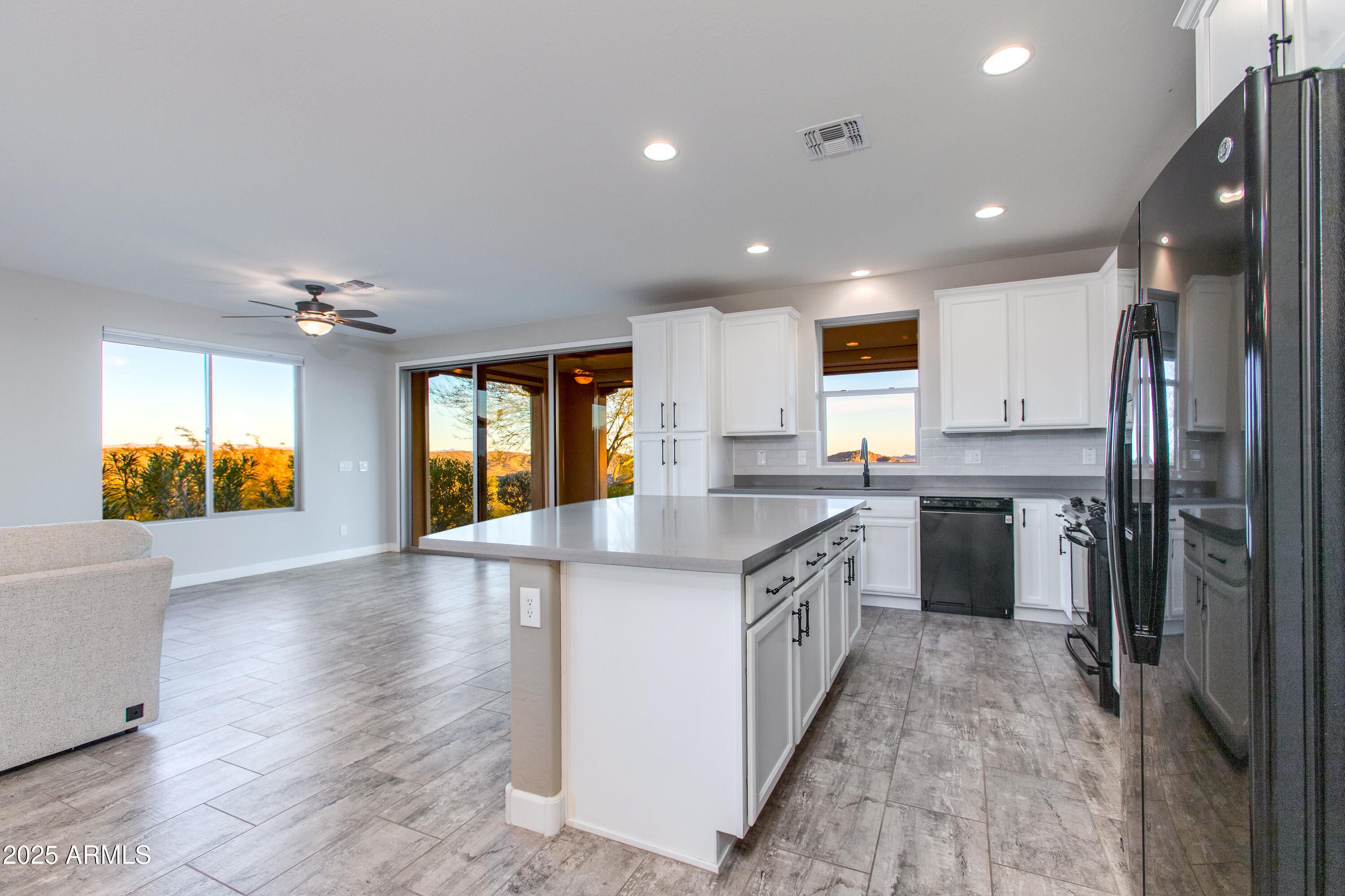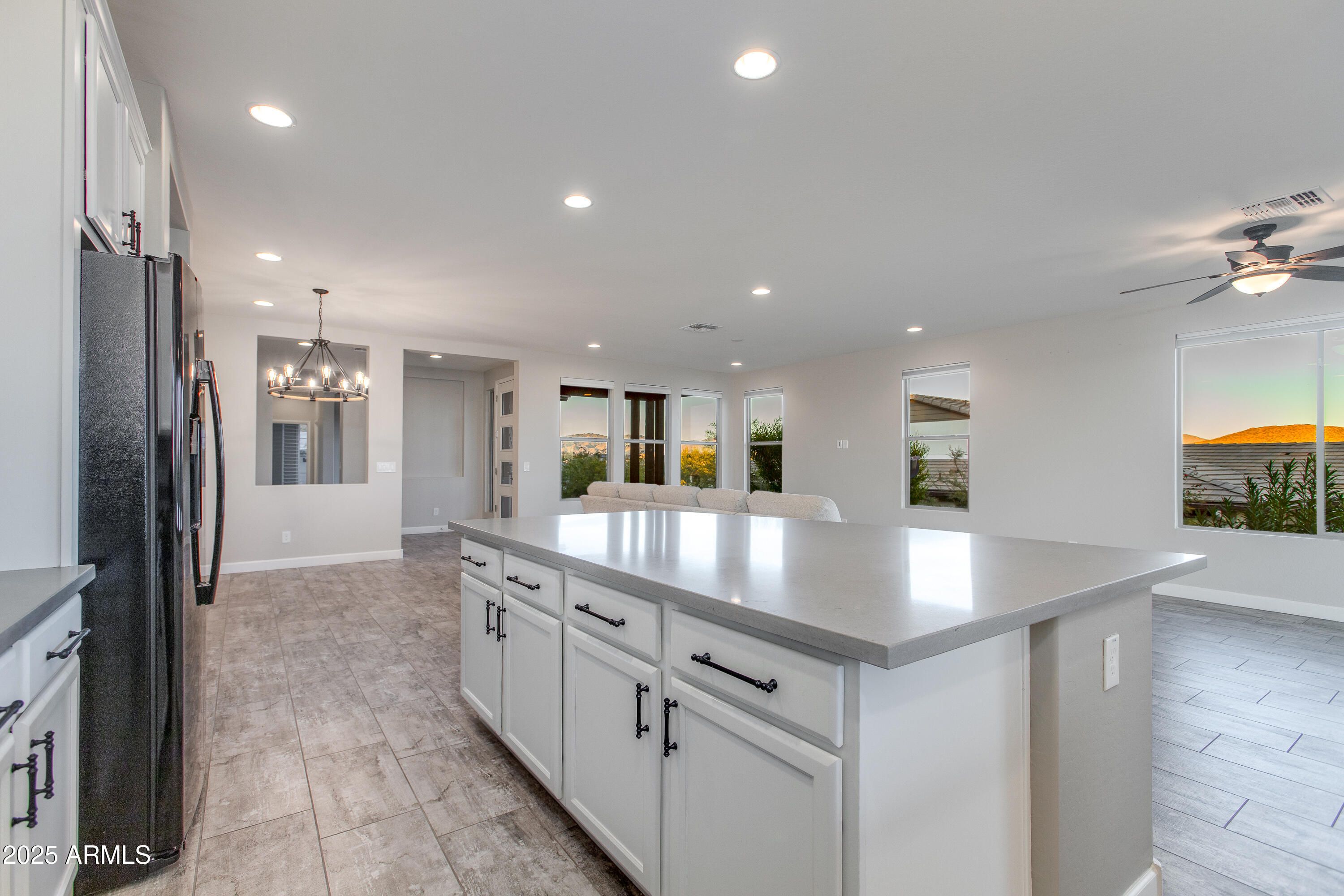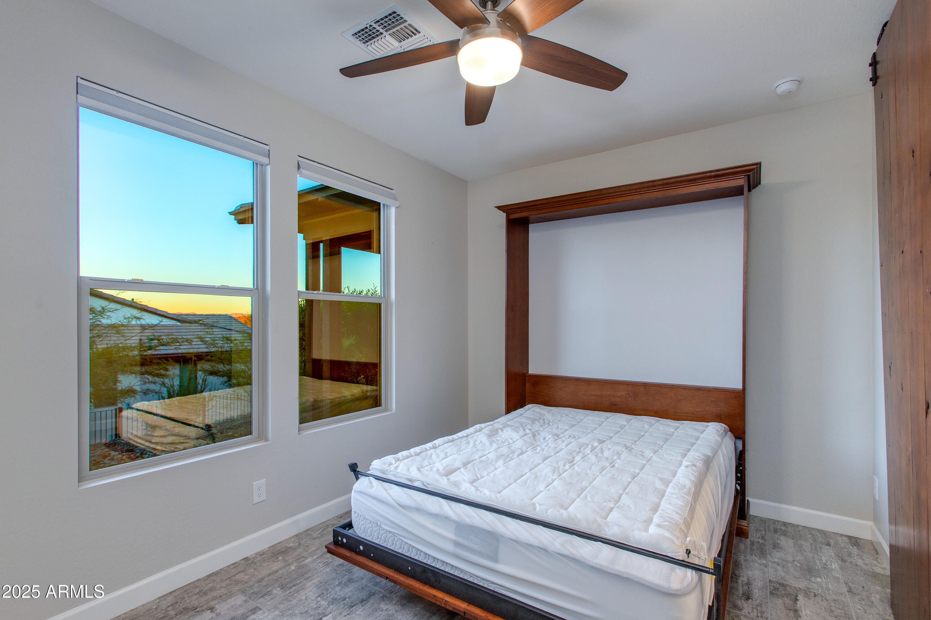 Beautiful Sycamore on an oversized terraced homesite in the highly desirable Caballero neighborhood. This 2-bed, 2.5-bath plus den home features custom interior details, barn doors, a Murphy bed, and a large laundry room. Upgrades include granite counters, Coconut Matte cabinets, enhanced lighting, and a 12' multi-slide leading to motorized patio screens. The 3-car garage is insulated, and the lot offers 360° entertaining spaces, landscape opportunities on both sides, and mountain views from the front and back. A water softener completes this stunning, private view home. - FULL DESCRIPTION - Gorgeous Sycamore floorplan on an oversized, terraced view lot in the highly desirable Caballero neighborhoodan entertainer's dream with true 360° living. This beautifully upgraded 2,141 sq ft home offers 2 bedrooms + den, 2.5 baths, and a spacious 3-car garage, all wrapped in amazing panoramic and mountain views from both the front and back of the property. The terraced homesite provides exceptional privacy and multiple outdoor zones for relaxing, dining, and hosting. Inside, custom touches elevate every room: Coconut Matte cabinetry, granite slab counters, 42" kitchen uppers, roll-out convenience package, upgraded Blanco undermount sink, enhanced LED lighting, and a dramatic 12' multi-slide door connecting the dining room to the back patio. The den features barn doors and a built-in Murphy bed, offering the perfect flex space for guests or work. A large laundry room adds functionality and storage. Additional upgrades include motorized screens at the back patio, a whole-home water softener, AV sleeve for TV mounting, added exterior outlets, fan pre-wires, and an insulated 3-bay garage. Both sides of the property offer unique landscape opportunities, allowing you to create your own outdoor havens around the already stunning natural surroundings. With incredible finishes, thoughtful design, and a premium location in Caballero, this home blends comfort, sophistication, and unforgettable Wickenburg Ranch views.
