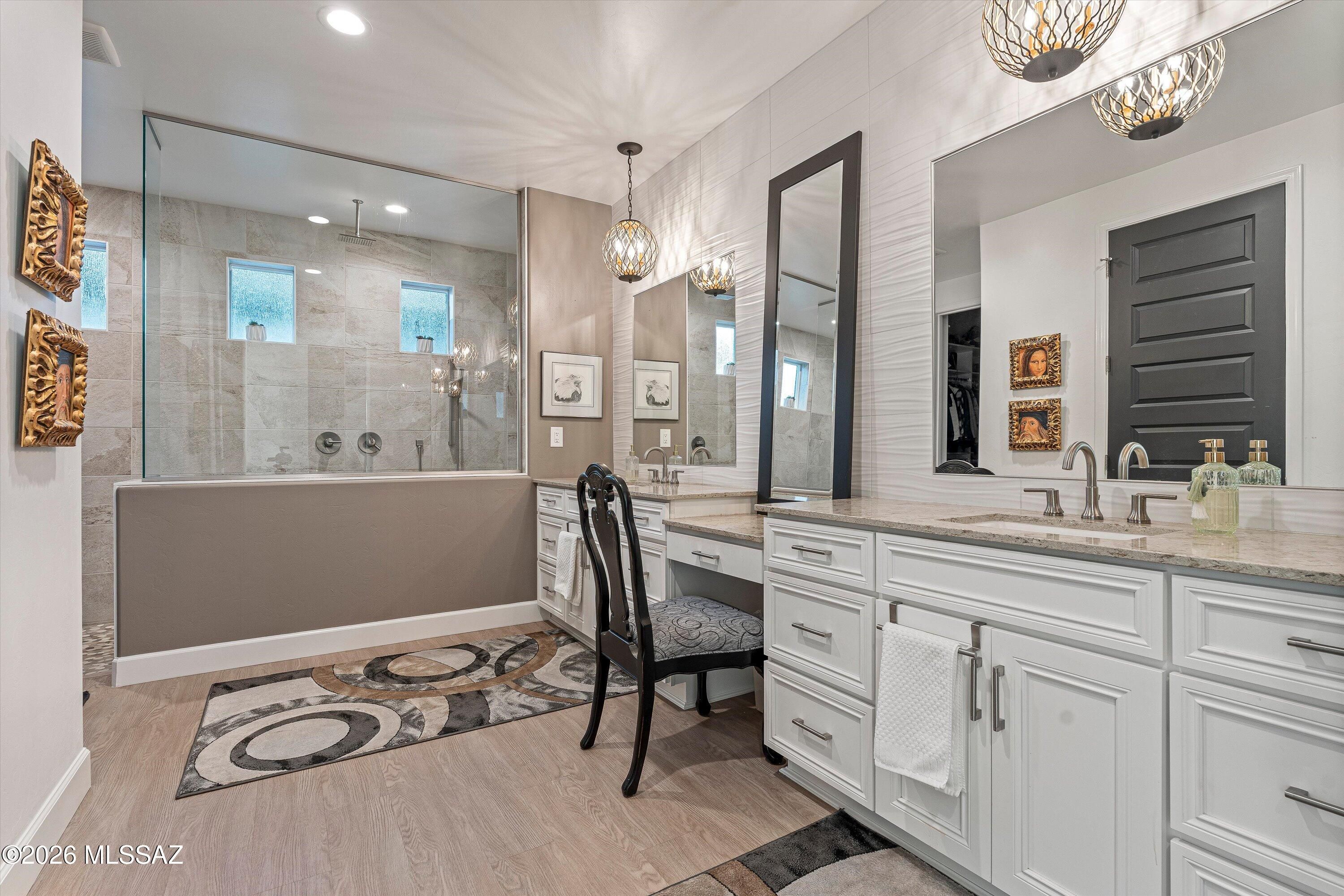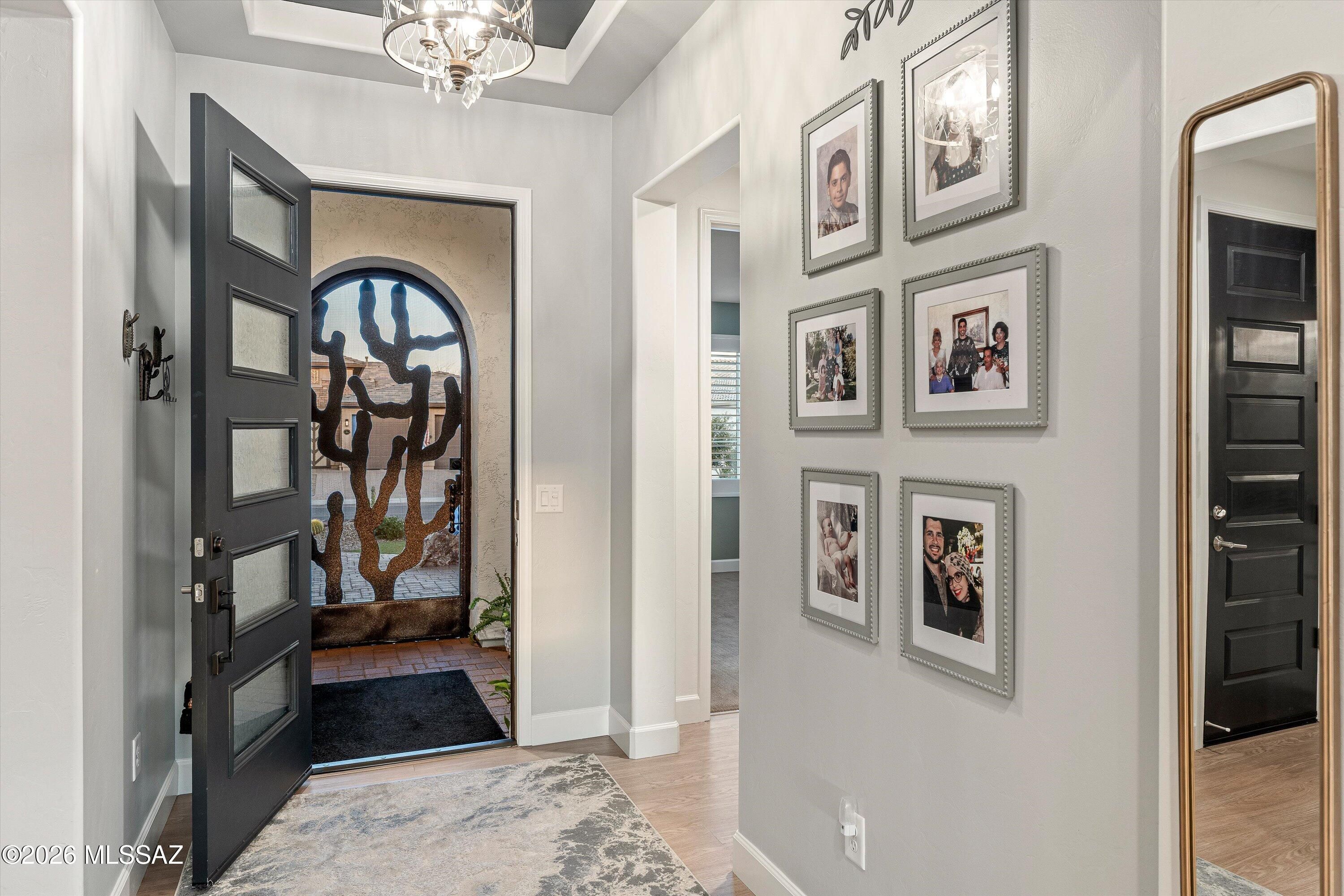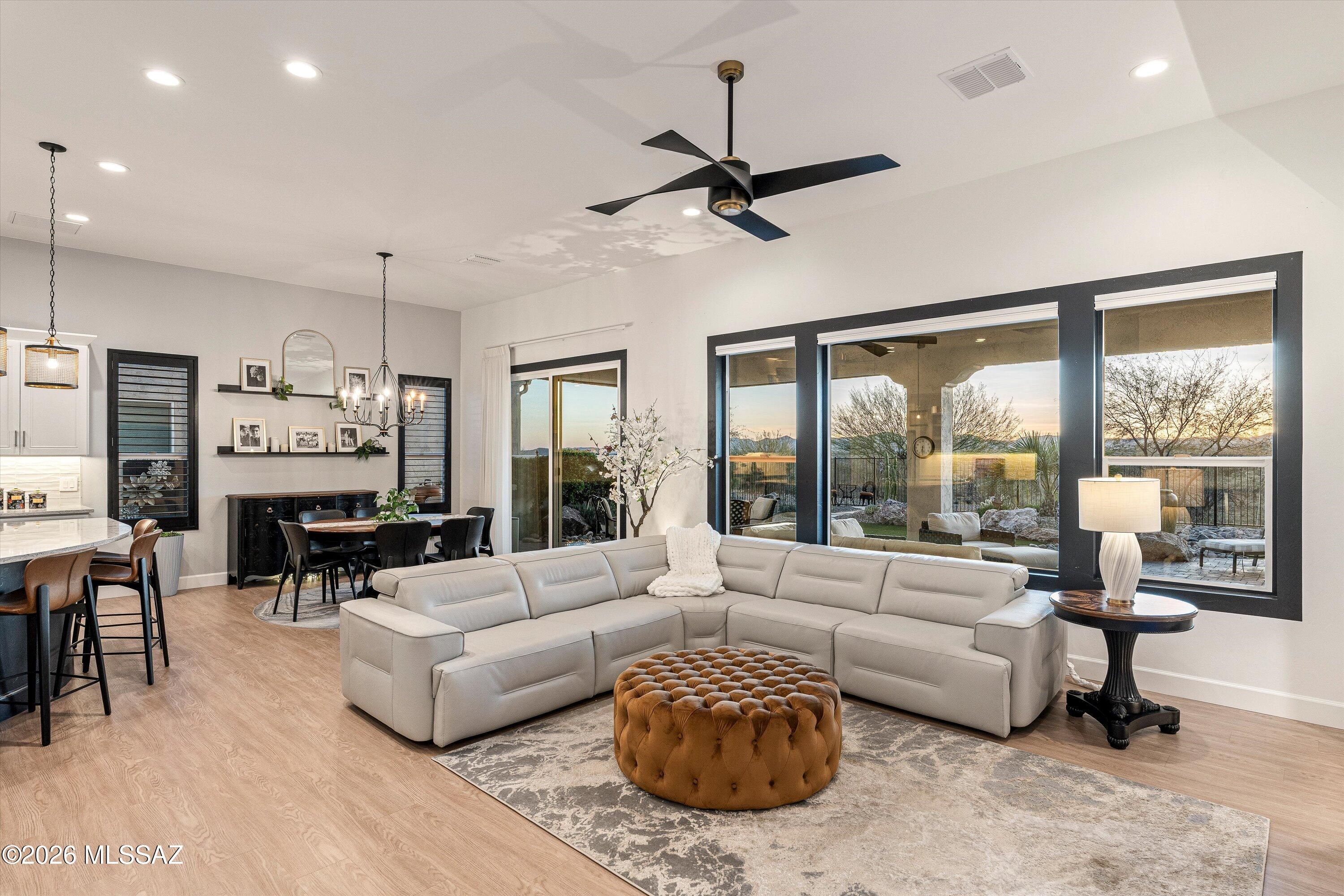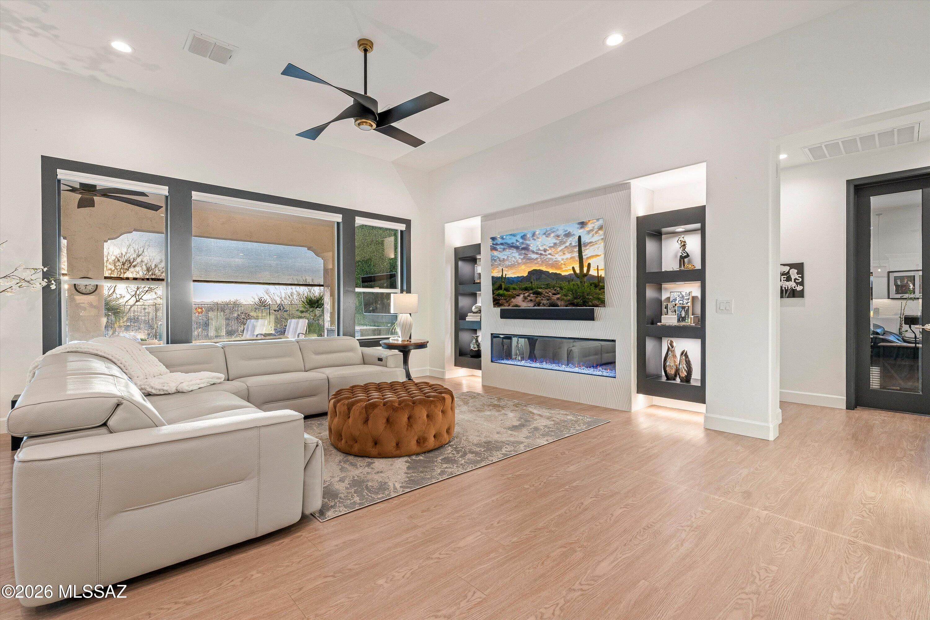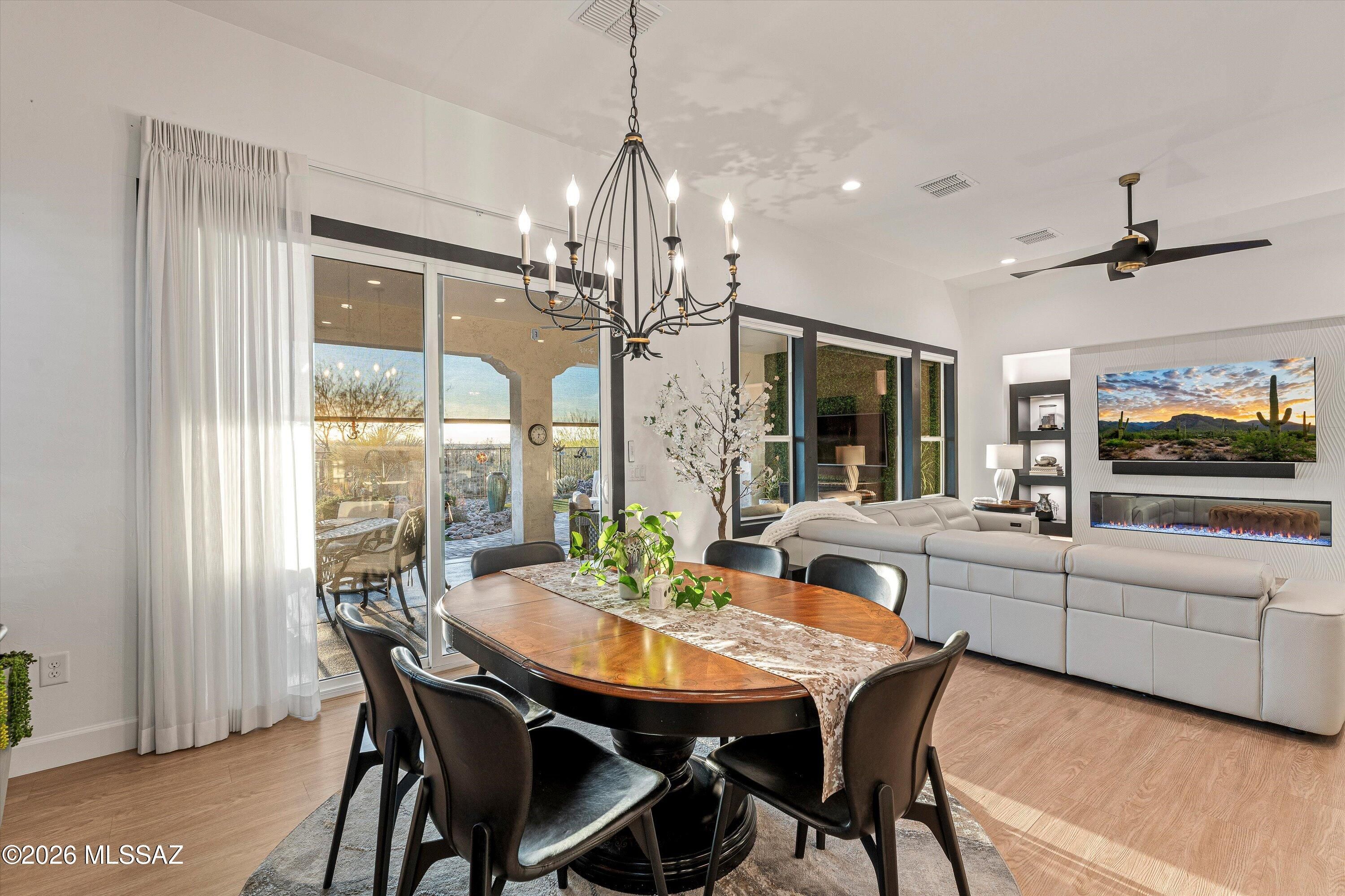 From the moment you arrive, this upgraded luxurious Vienta model commands attention. An epoxy driveway and paver courtyard set the stage for the upgrades within. Soaring tall doors and designer trim lead into an interior where LVP flooring, custom lighting, and plantation & electric blinds, flow throughout. The chef's kitchen Shines with quartz countertops, soft-close cabinetry & pull-out shelves, gas cooktop, and bar with wine fridge. The living room features a custom built-in fireplace. The extended master retreat frames breathtaking mountain views and western sunsets, with rain-head shower, makeup vanity, and custom built-in closet. Outside, a fully snake-fenced backyard with electric shades, infrared heater, water fountain, and lush landscaping showcases those spectacular views.